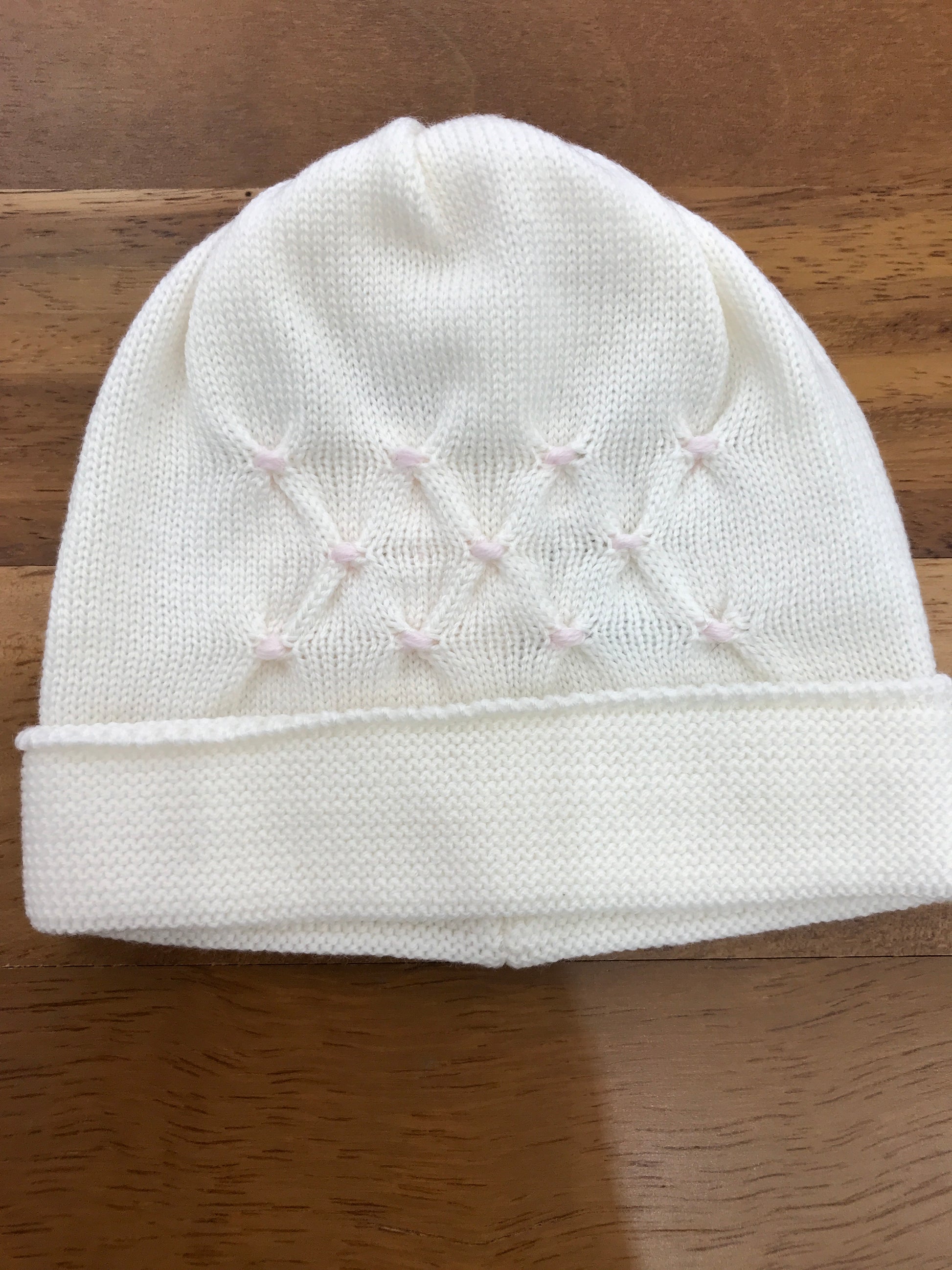 Cappellino con risvolto caratterizzato da un raffinato motivo a punto smok.