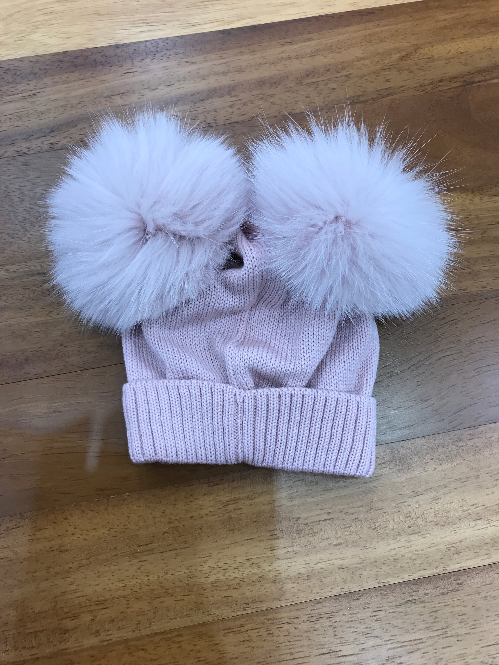 Cappellino in lana rosa antico, dotato di risvolto e decorato con due soffici pon pon dello stesso colore.