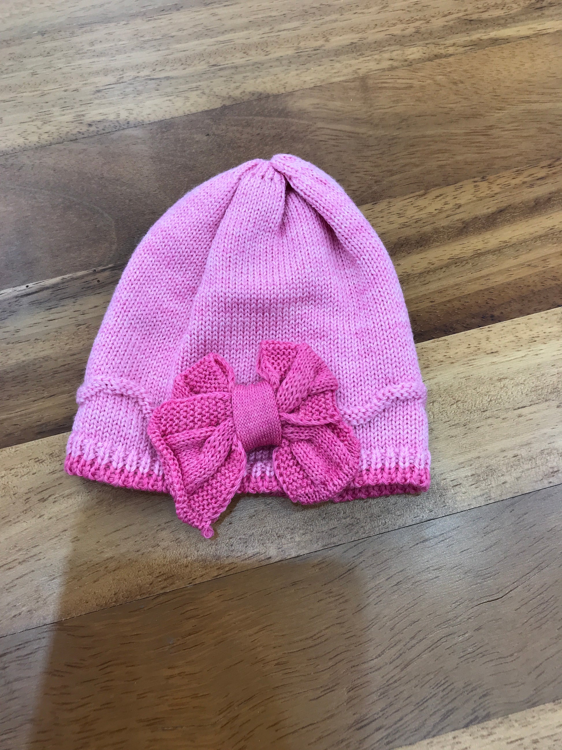 Cappellino senza risvolto realizzato in lana, caratterizzato da un delicato motivo a onda e arricchito da un fiocco posizionato al centro.