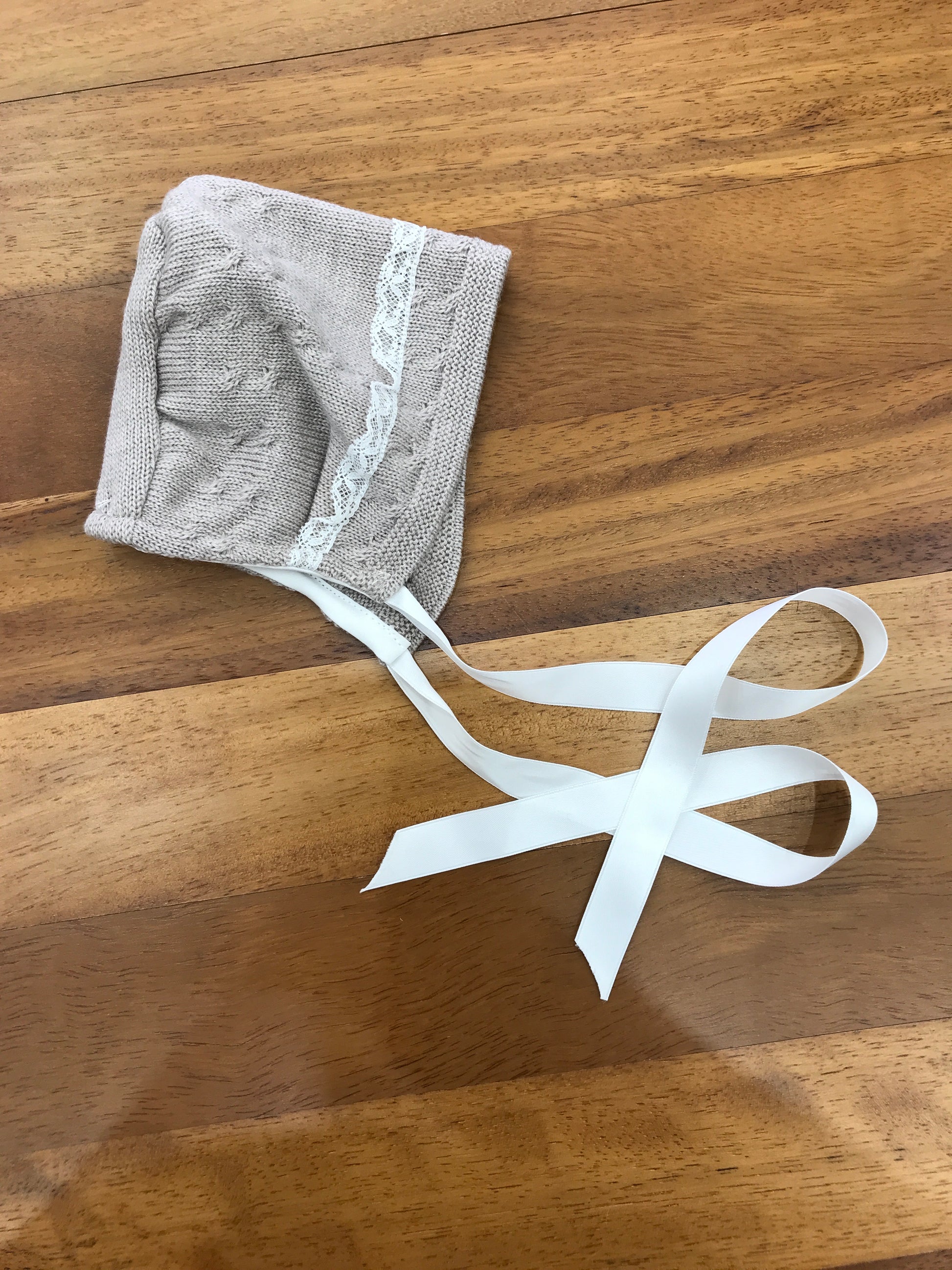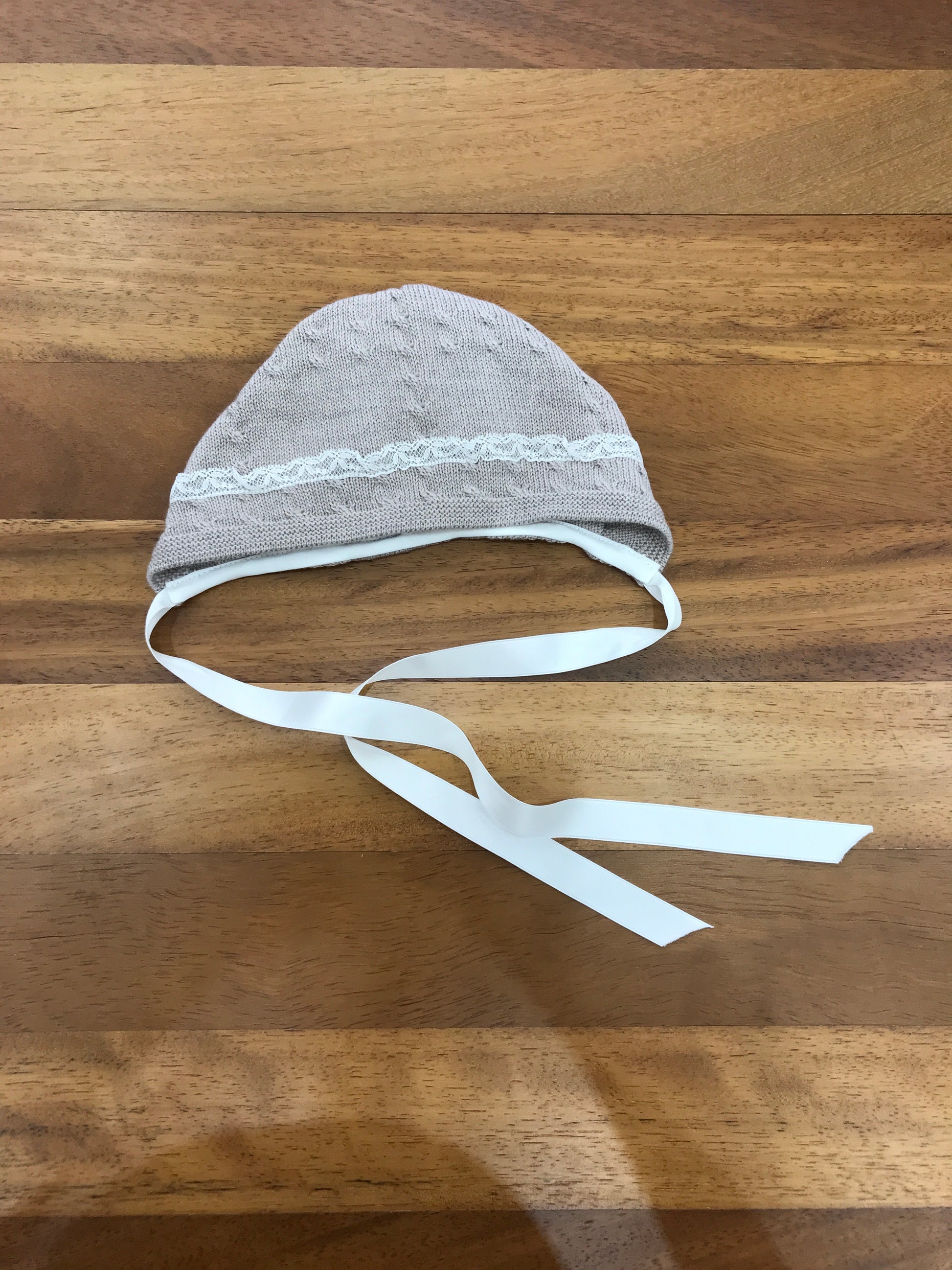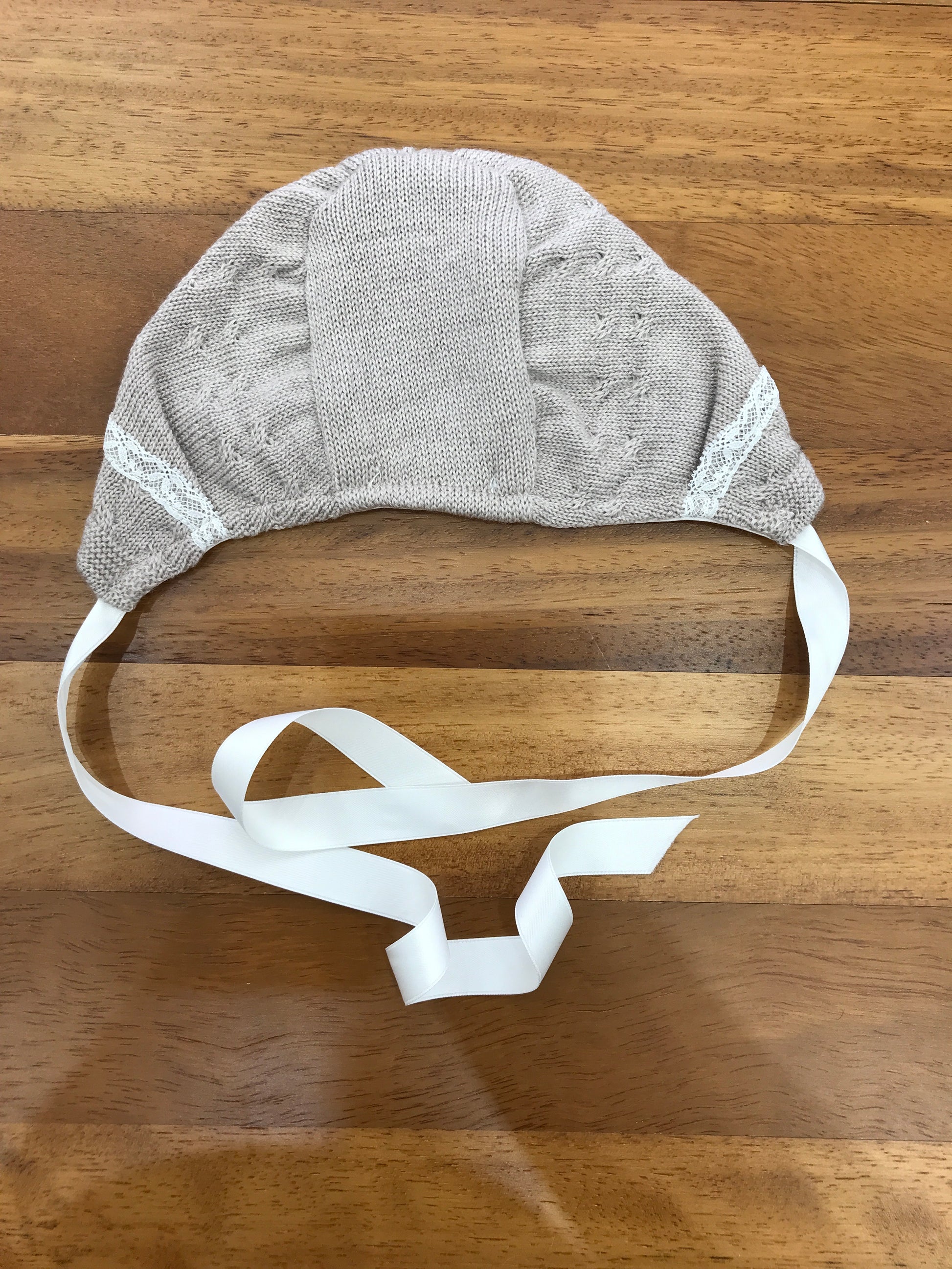Cuffietta in lana con chiusura a fiocchetto, decorata sul davanti da un ricamo Valancienne.