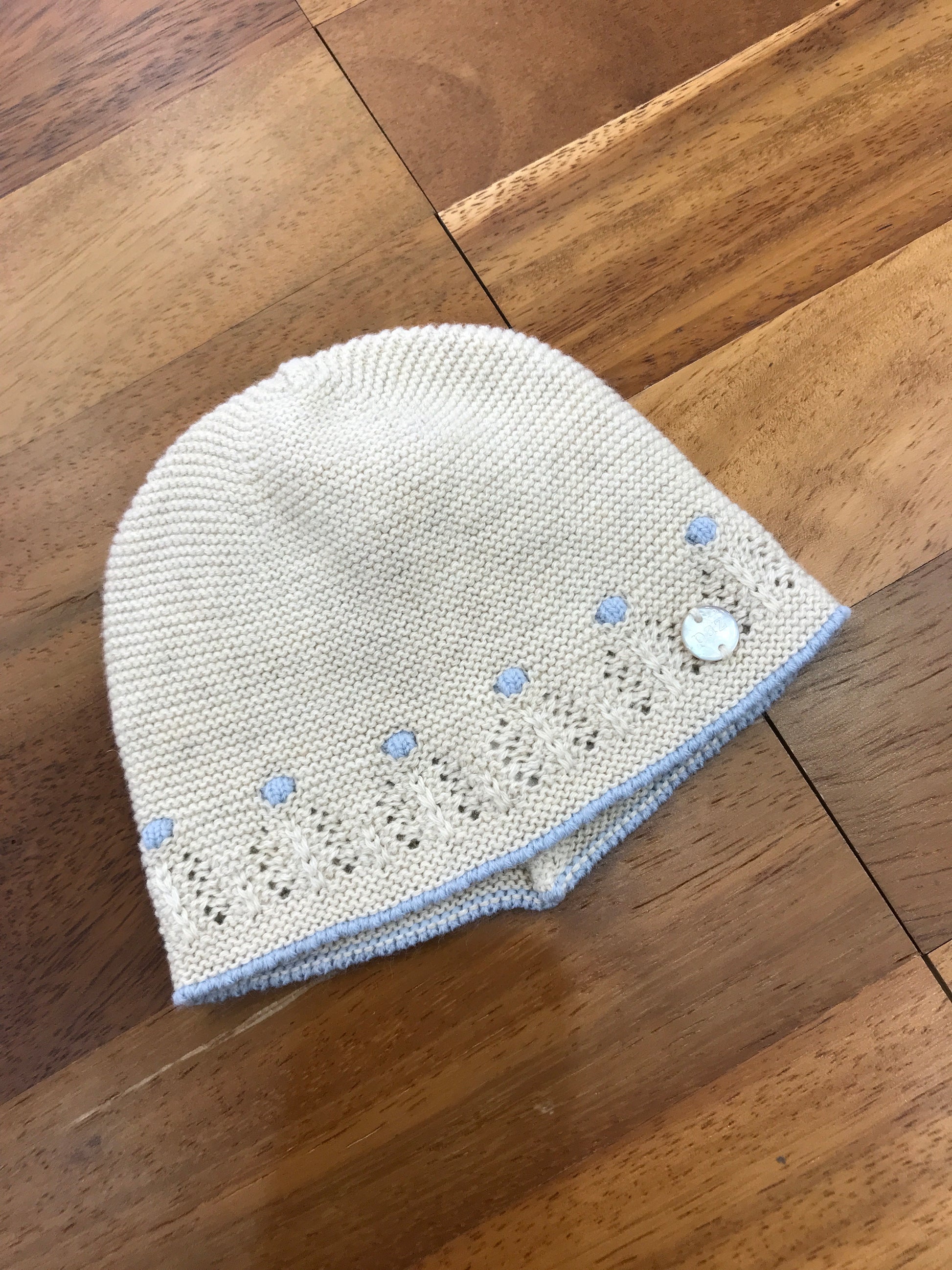 Questo cappellino in lana presenta delicati ricami celesti e un design leggermente traforato, unendo eleganza e traspirabilità in un accessorio raffinato.