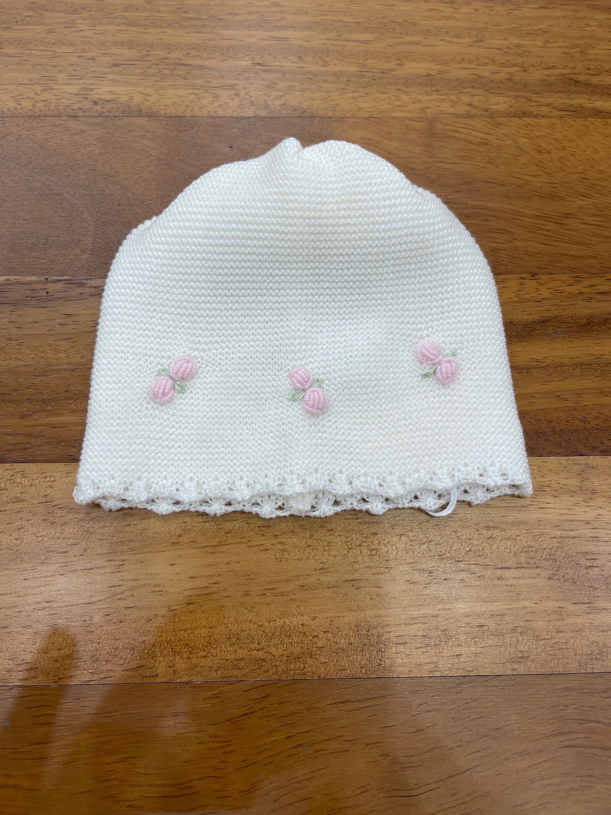 Delicato cappellino in lana decorato con piccoli fiori rosa ricamati e rifinito da un bordo traforato finemente lavorato.