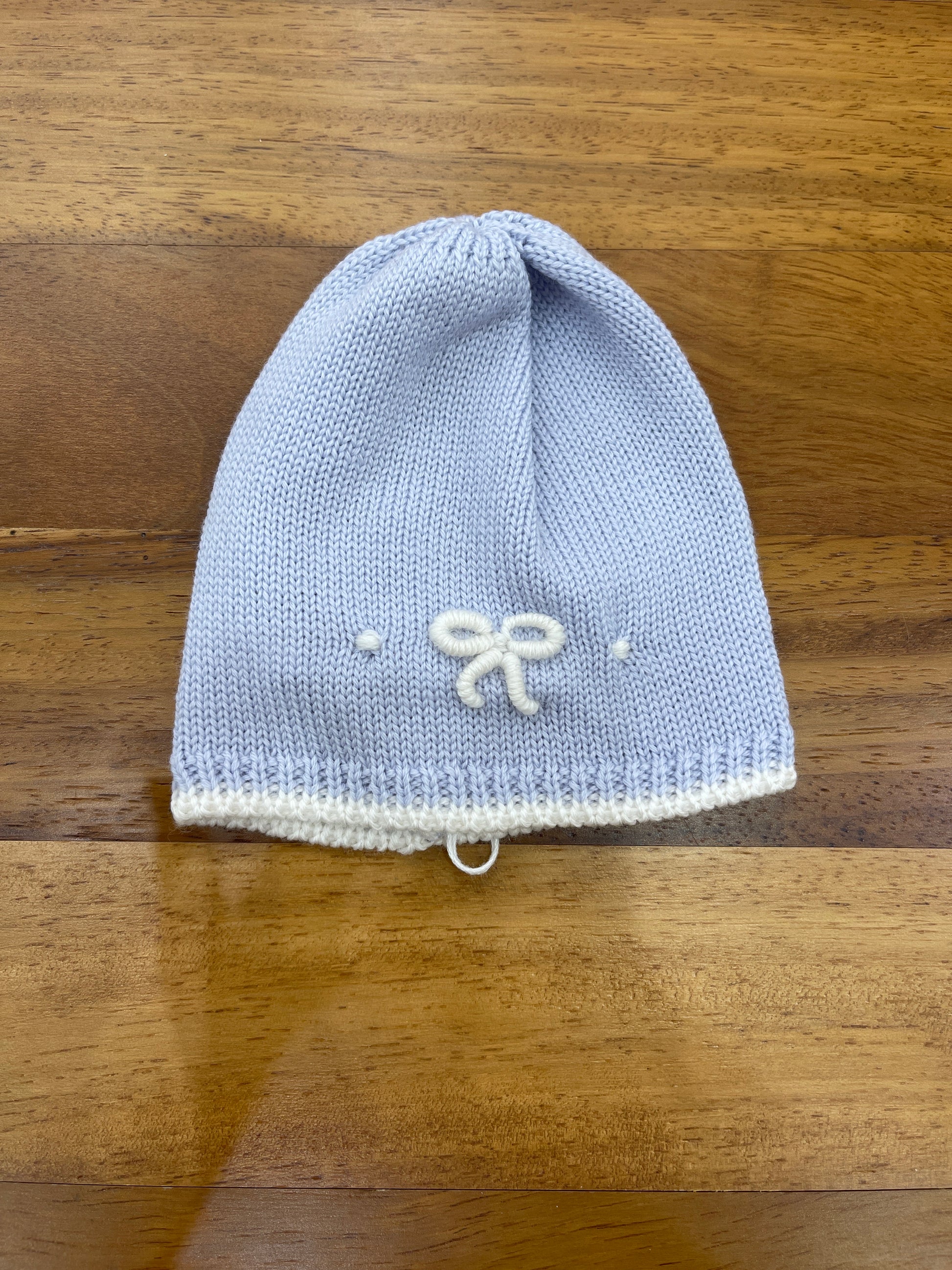 Questo cappello in lana presenta un elegante fiocco ricamato a mano in rilievo, un dettaglio raffinato che unisce comfort e stile per il tuo bebè.