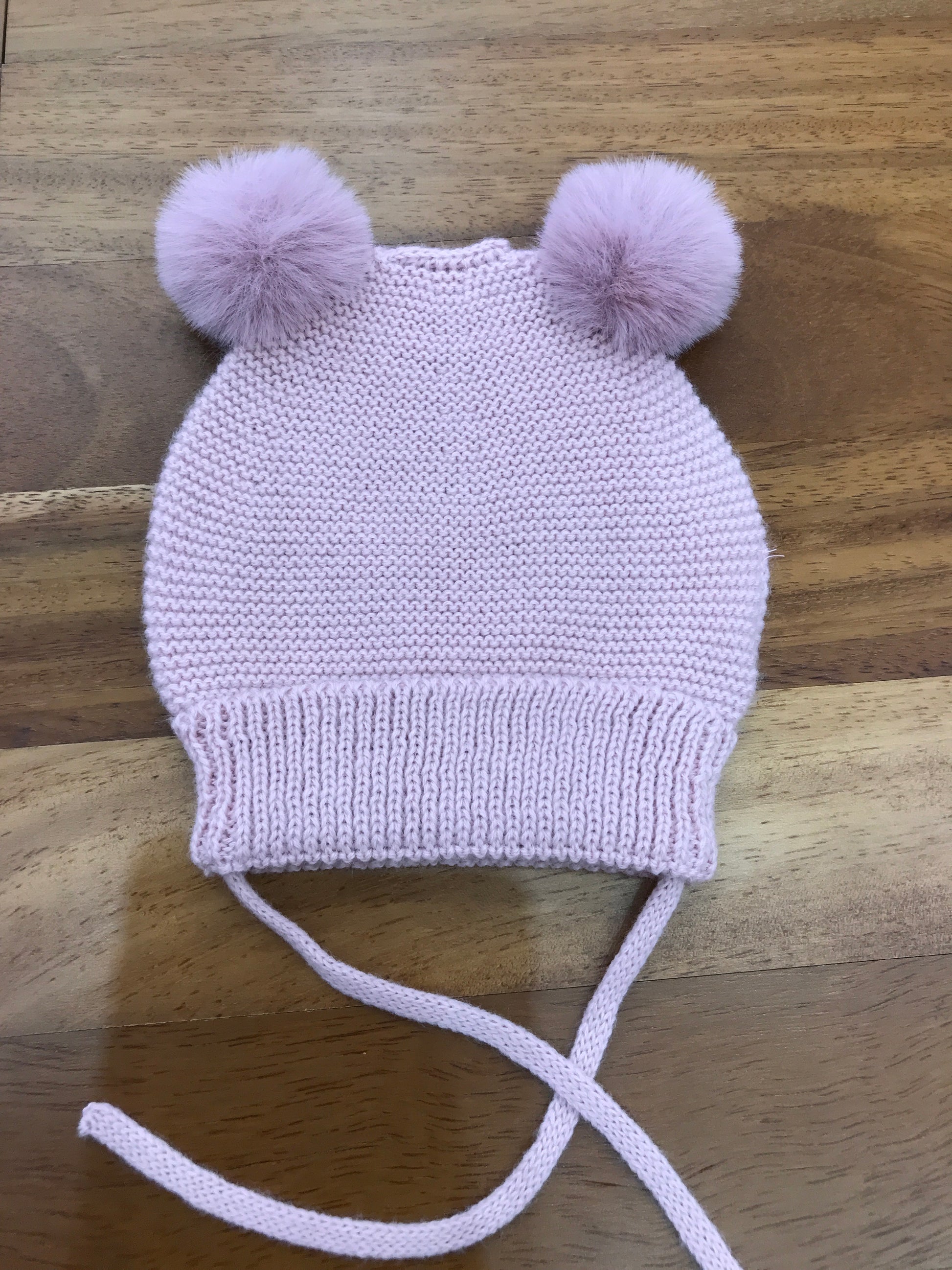 Questo cappellino per bambini PCS presenta due pon pon posizionati sopra la testa, uno su ciascun lato. È dotato di risvolto e di una chiusura con due laccetti da annodare sotto il mento per una vestibilità sicura e confortevole.