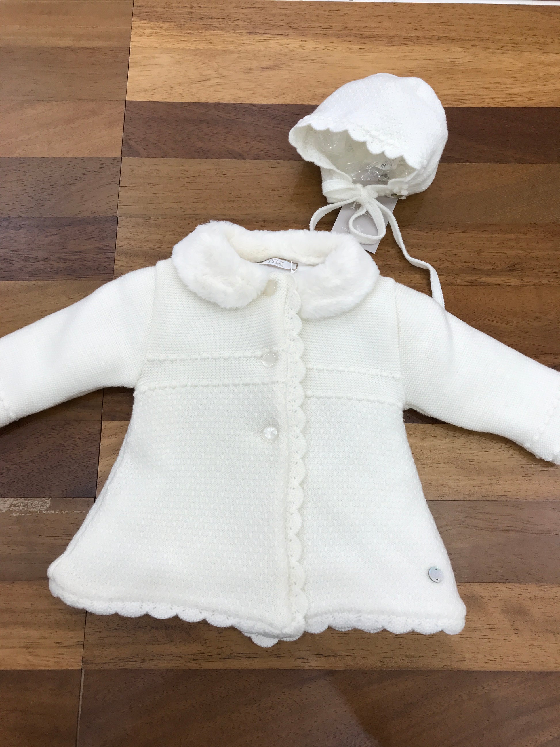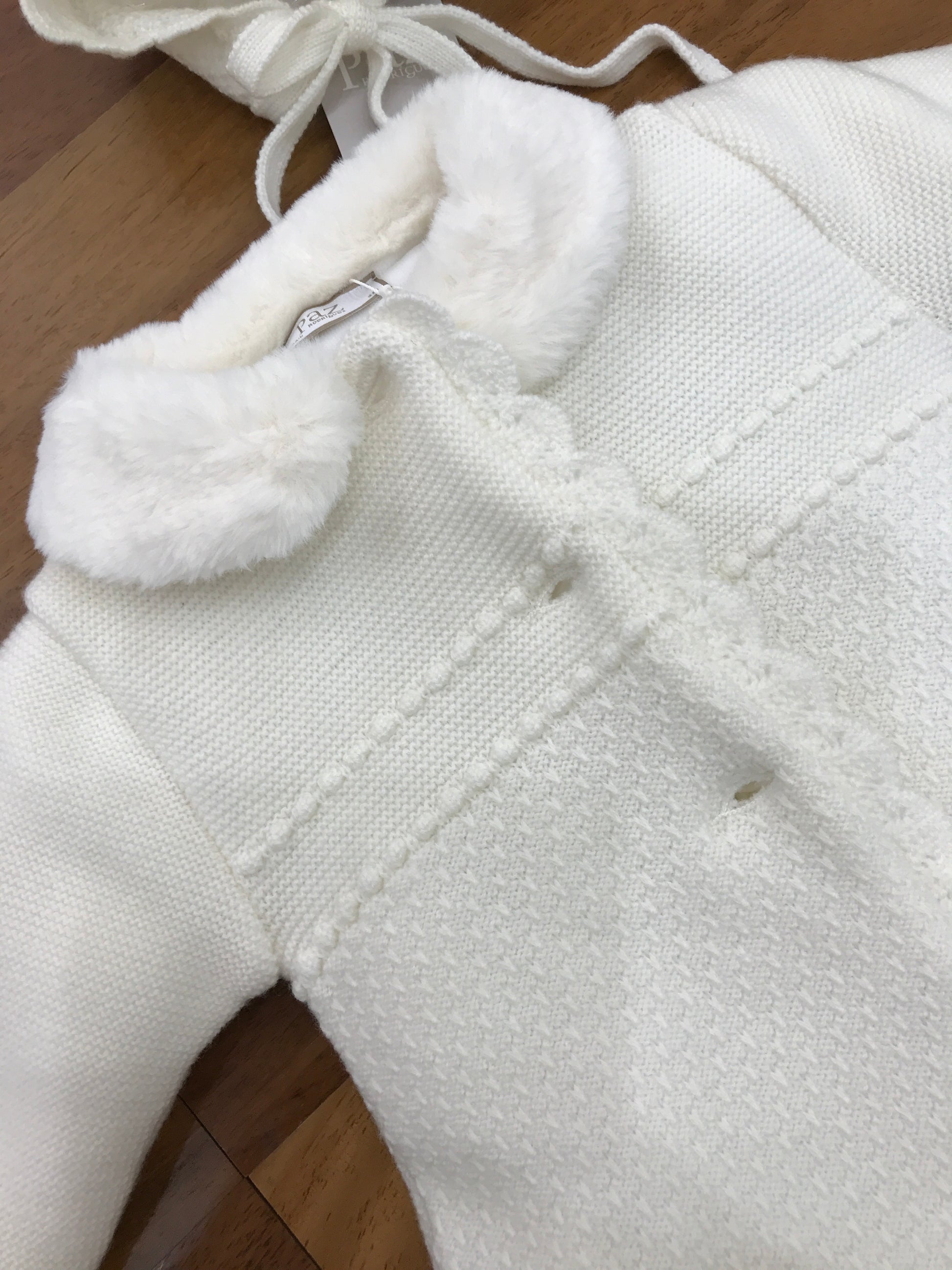 Questo cappottino in lana è realizzato con una lavorazione a maglia riso, arricchito da un elegante colletto in pelliccia bianca. La chiusura è garantita da tre piccoli bottoni, che conferiscono al capo un aspetto raffinato e curato, ideale per chi cerca un equilibrio tra stile e comfort durante la stagione fredda.