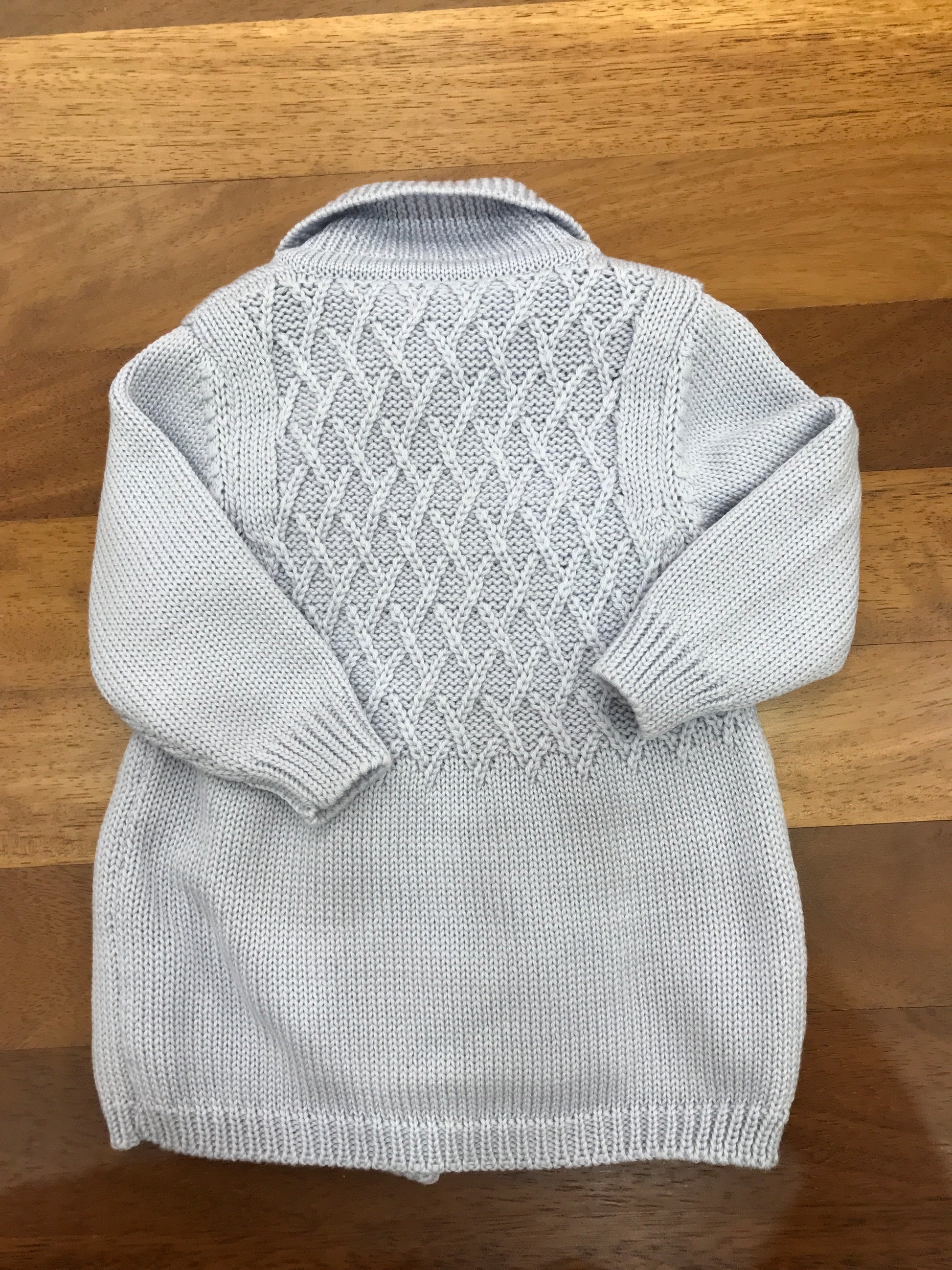 Cappotto in lana di colore celeste, caratterizzato da un delicato punto smock sul davanti e sul retro, con collo alla coreana e chiusura frontale tramite bottoncini.