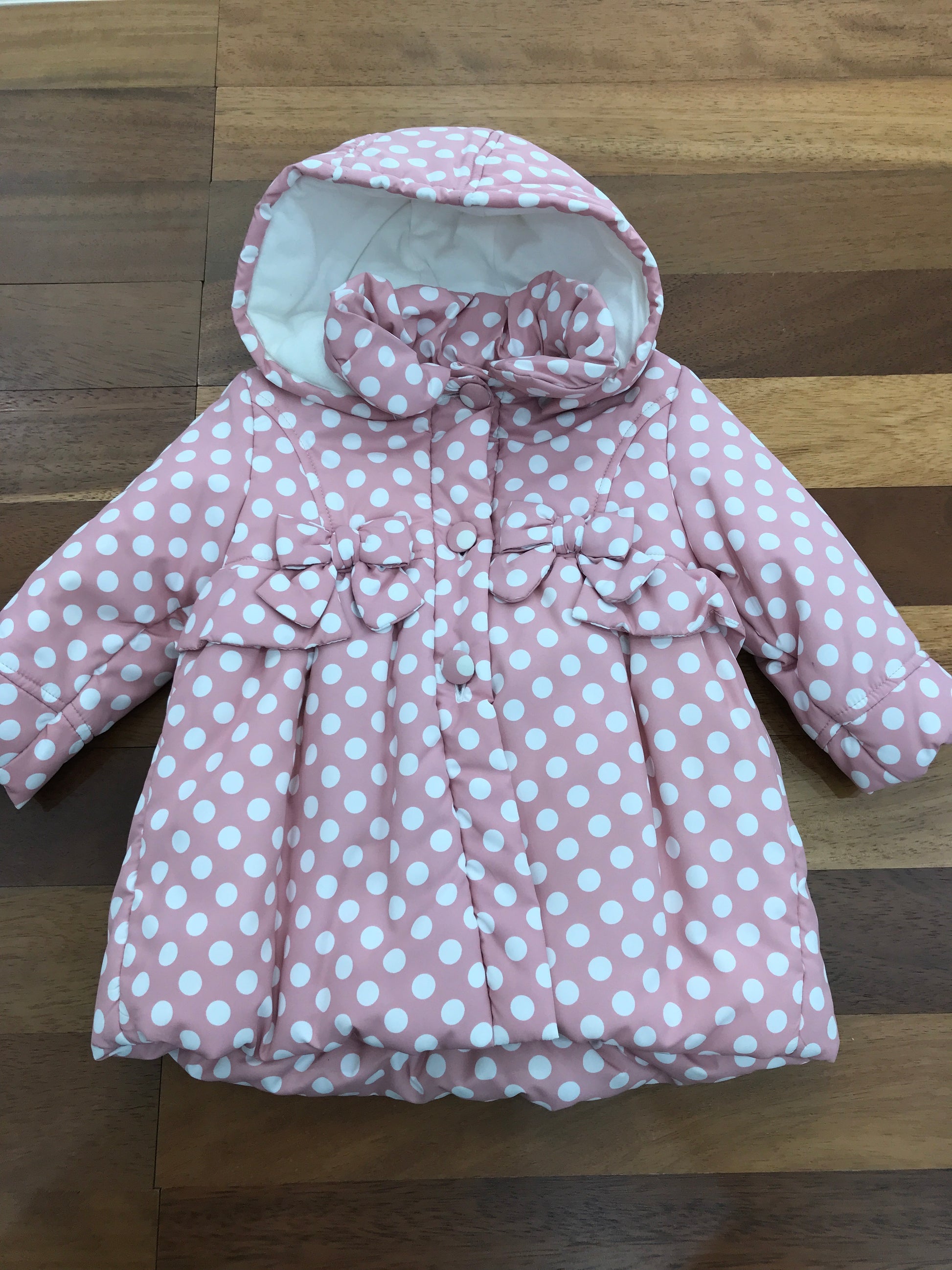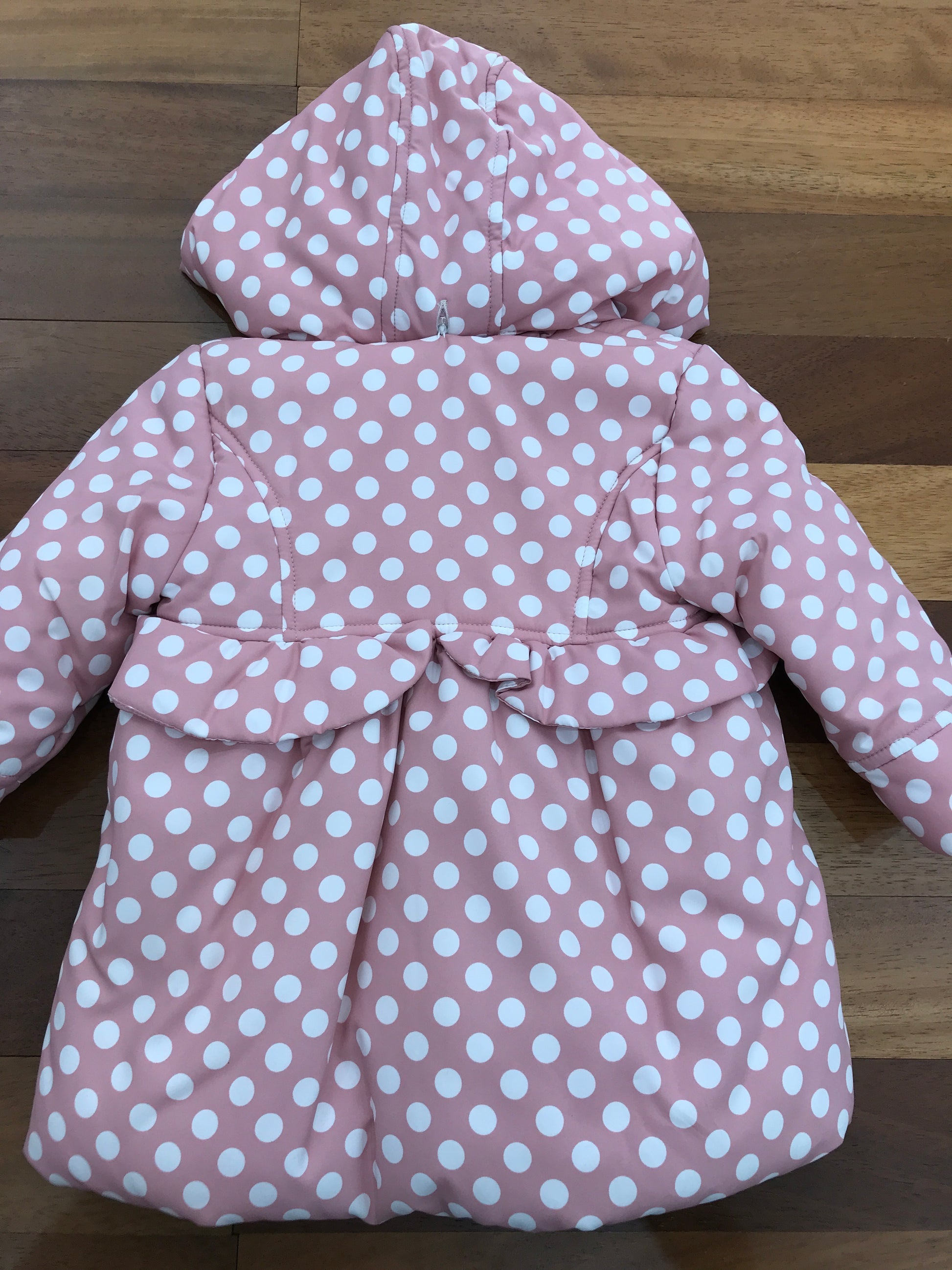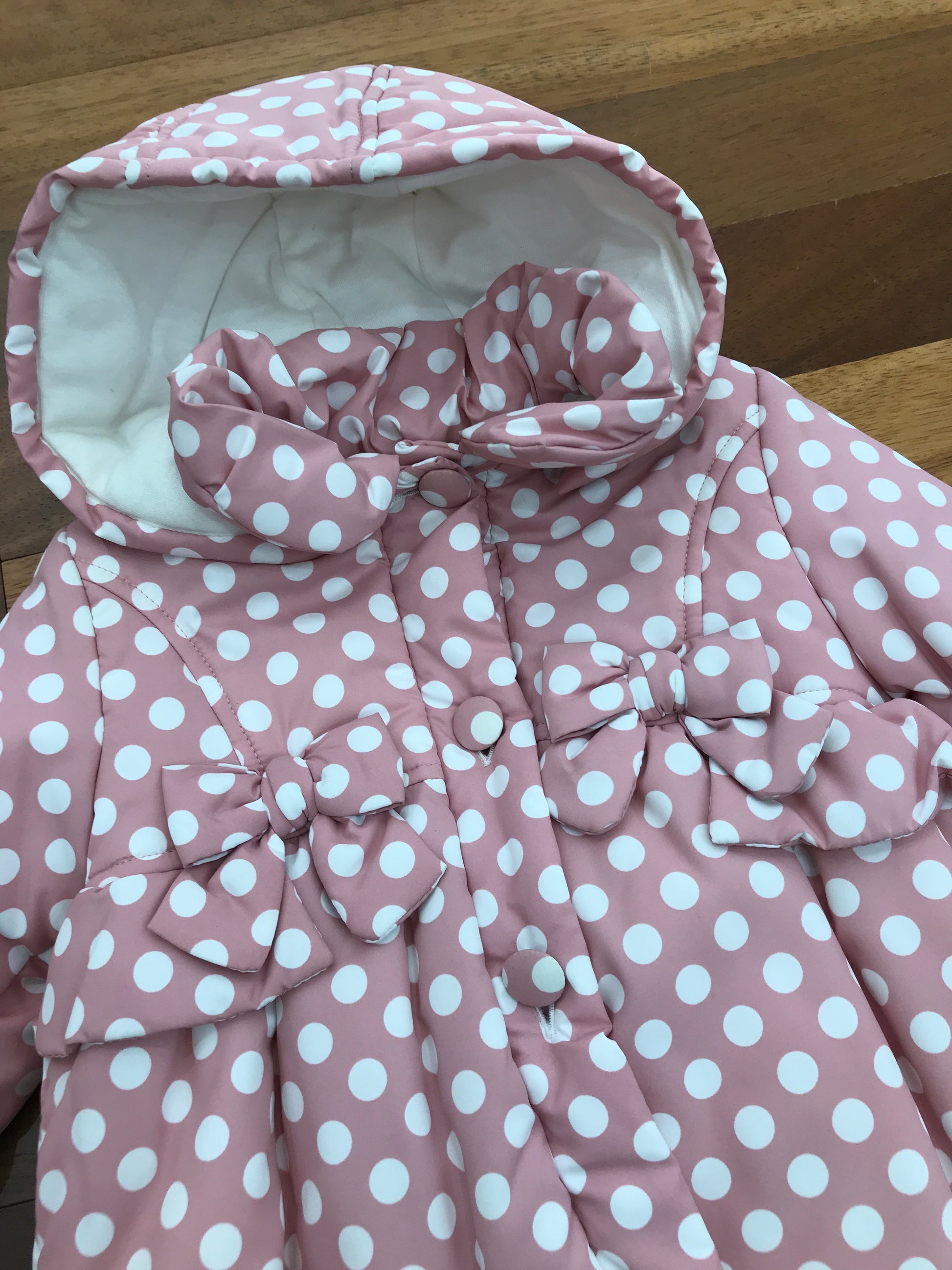 Giubbotto impermeabile in rosa con dettagli raffinati e funzionali. Caratterizzato da un taglio a campana che garantisce libertà di movimento, è dotato di cappuccio protettivo e impreziosito da volant eleganti sul davanti e sul retro. Due piccoli fiocchi decorativi sulle finte tasche completano il design, mentre la struttura impermeabile assicura protezione affidabile dalle intemperie. Ideale per le giornate piovose, combina praticità e stile con una silhouette femminile e sofisticata.