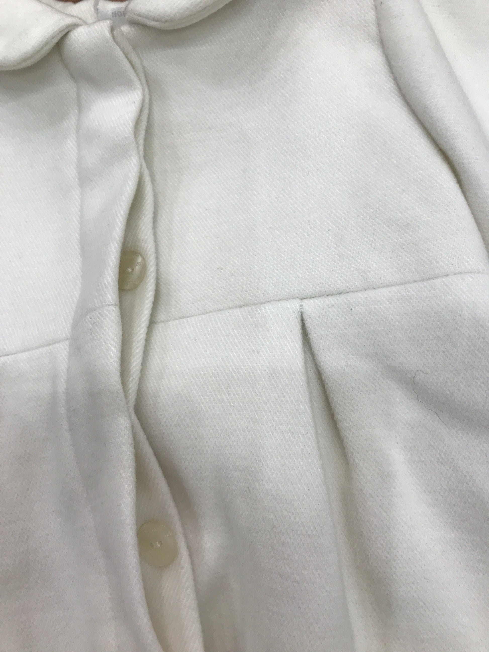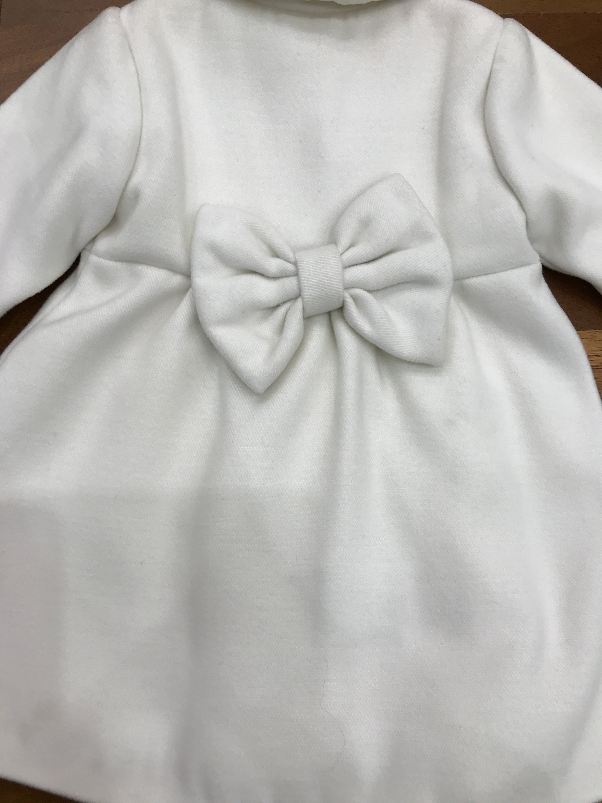 Delicato cappottino in tonalità panna, sapientemente confezionato per la bambola. Caratterizzato da una chiusura funzionale con bottoncini e impreziosito da un raffinato fiocco centrale sul retro, che conferisce un tocco di eleganza senza compromessi al capo.
