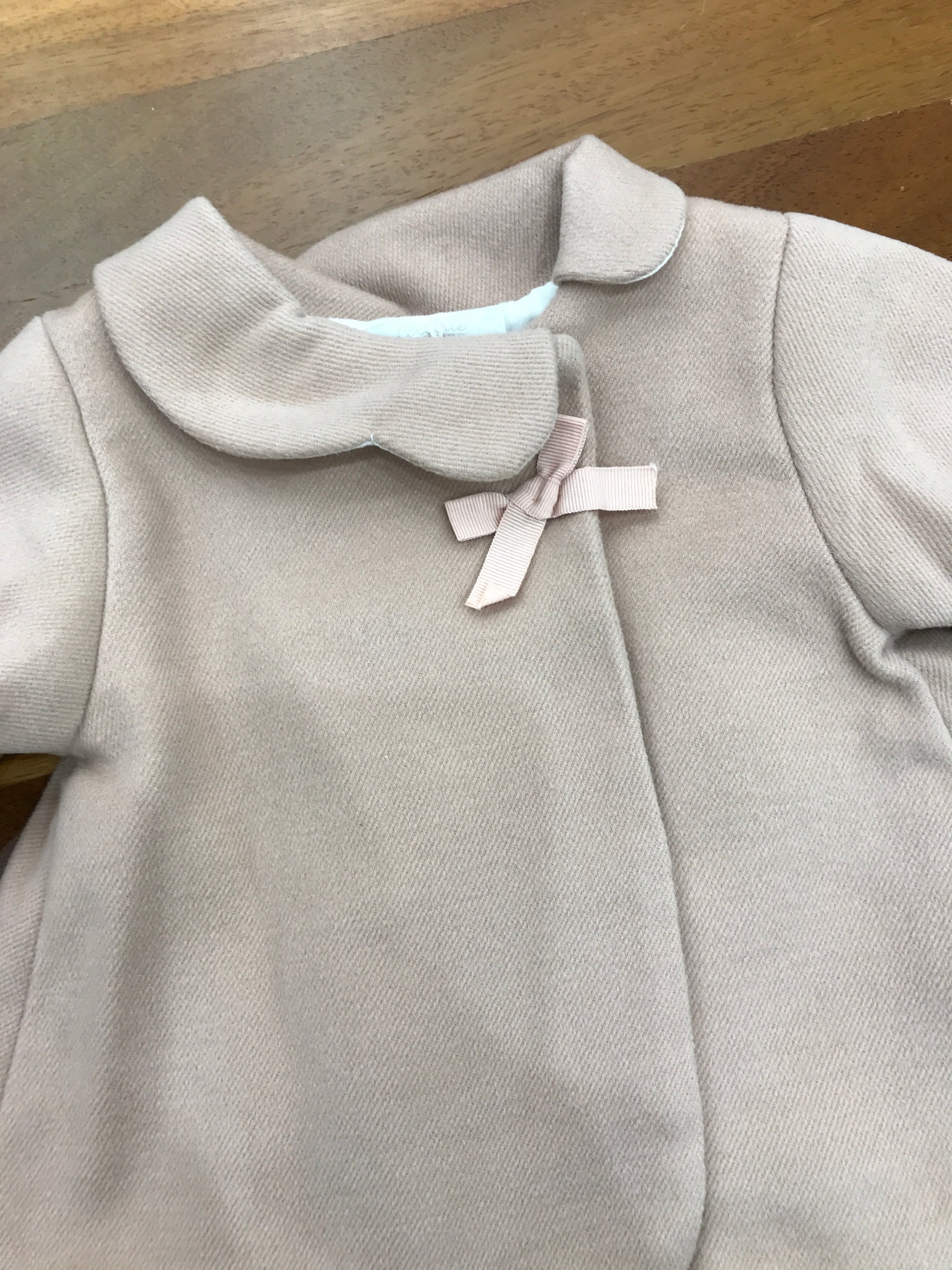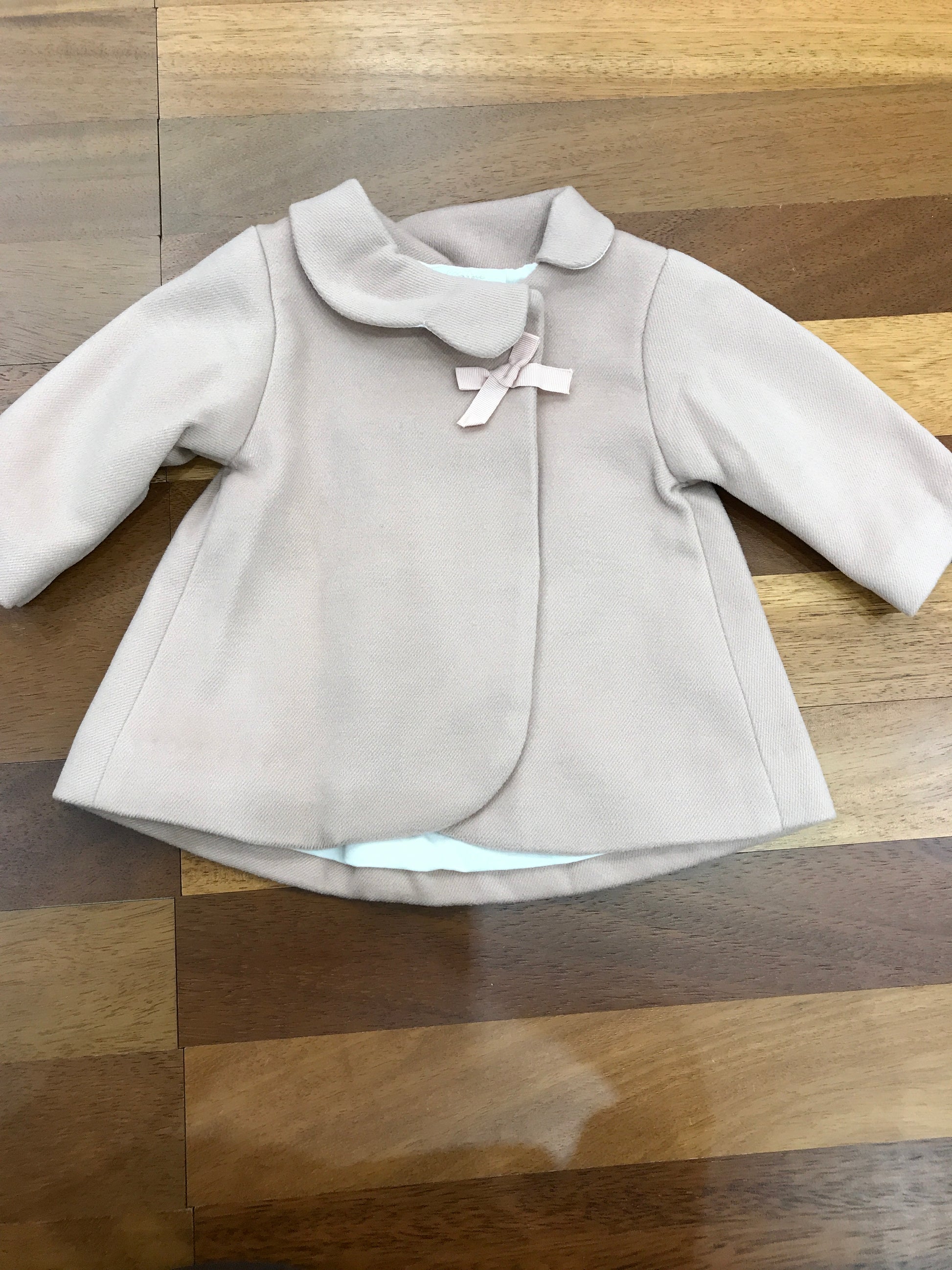 Elegante cappottino in tonalità rosa antico, arricchito da una delicata chiusura interna con bottoncini e un raffinato fiocchetto rosa-blu posizionato sul davanti. Un capo sofisticato che unisce praticità e stile, perfetto per le piccole fashioniste che desiderano un tocco di eleganza nei loro outfit quotidiani.