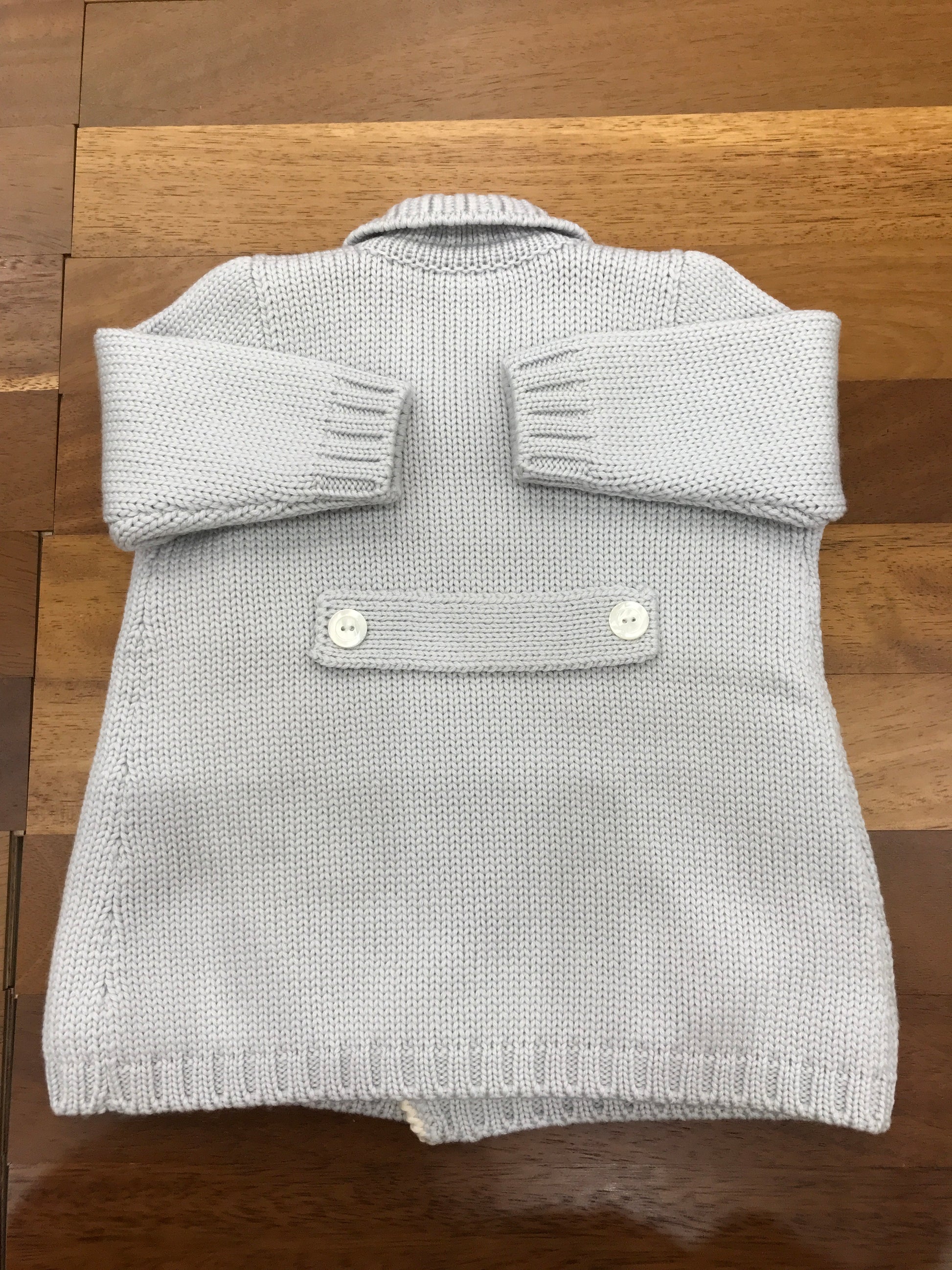 Cappotto celeste in lana, caratterizzato da un mezzo collo e chiusura frontale con bottoni. Presenta pratiche taschine anteriori e un dettaglio martin gala sul retro.