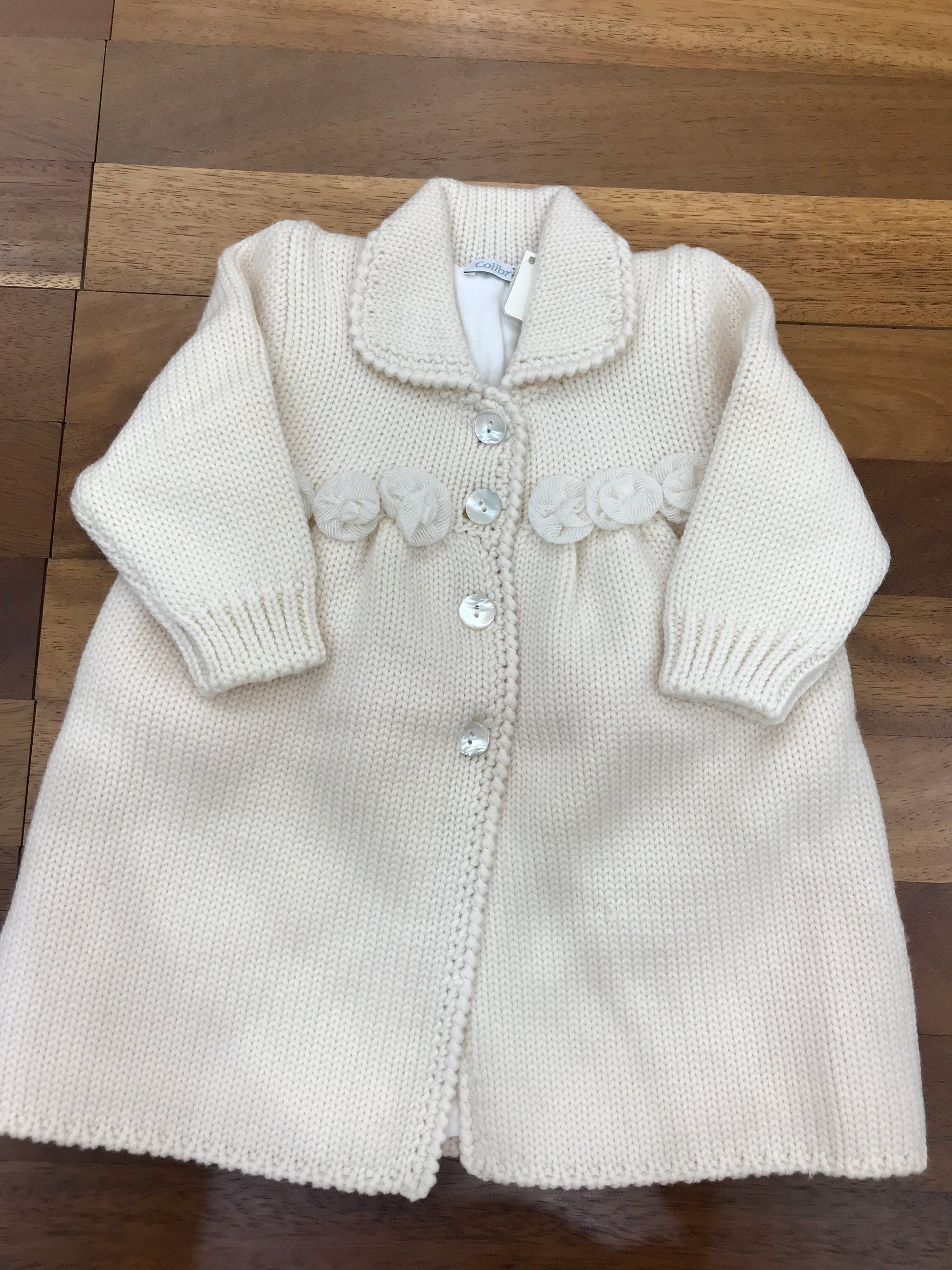 Cappotto color panna realizzato in lana, decorato con fiori tono su tono applicati sulla parte frontale a livello del petto.