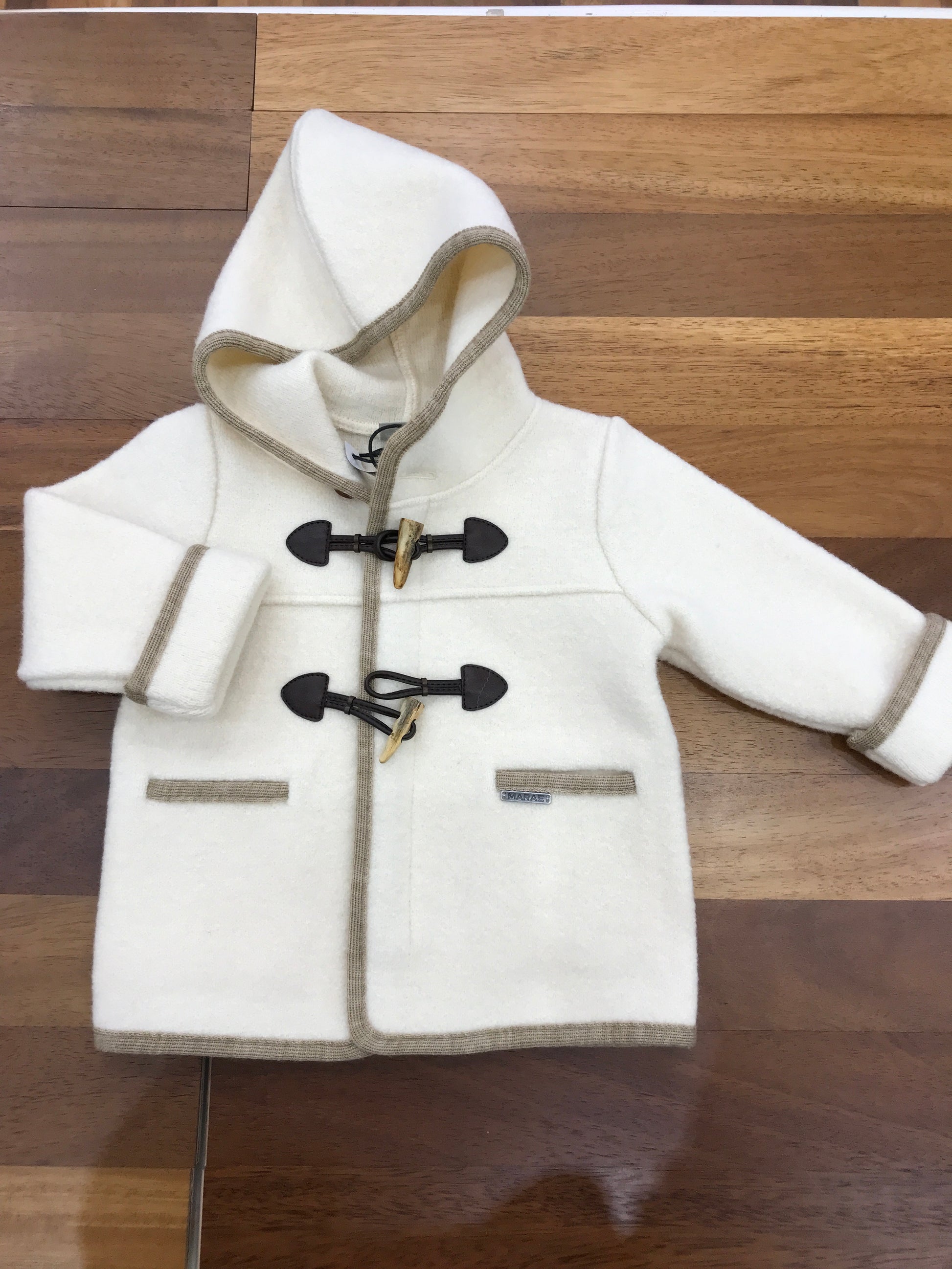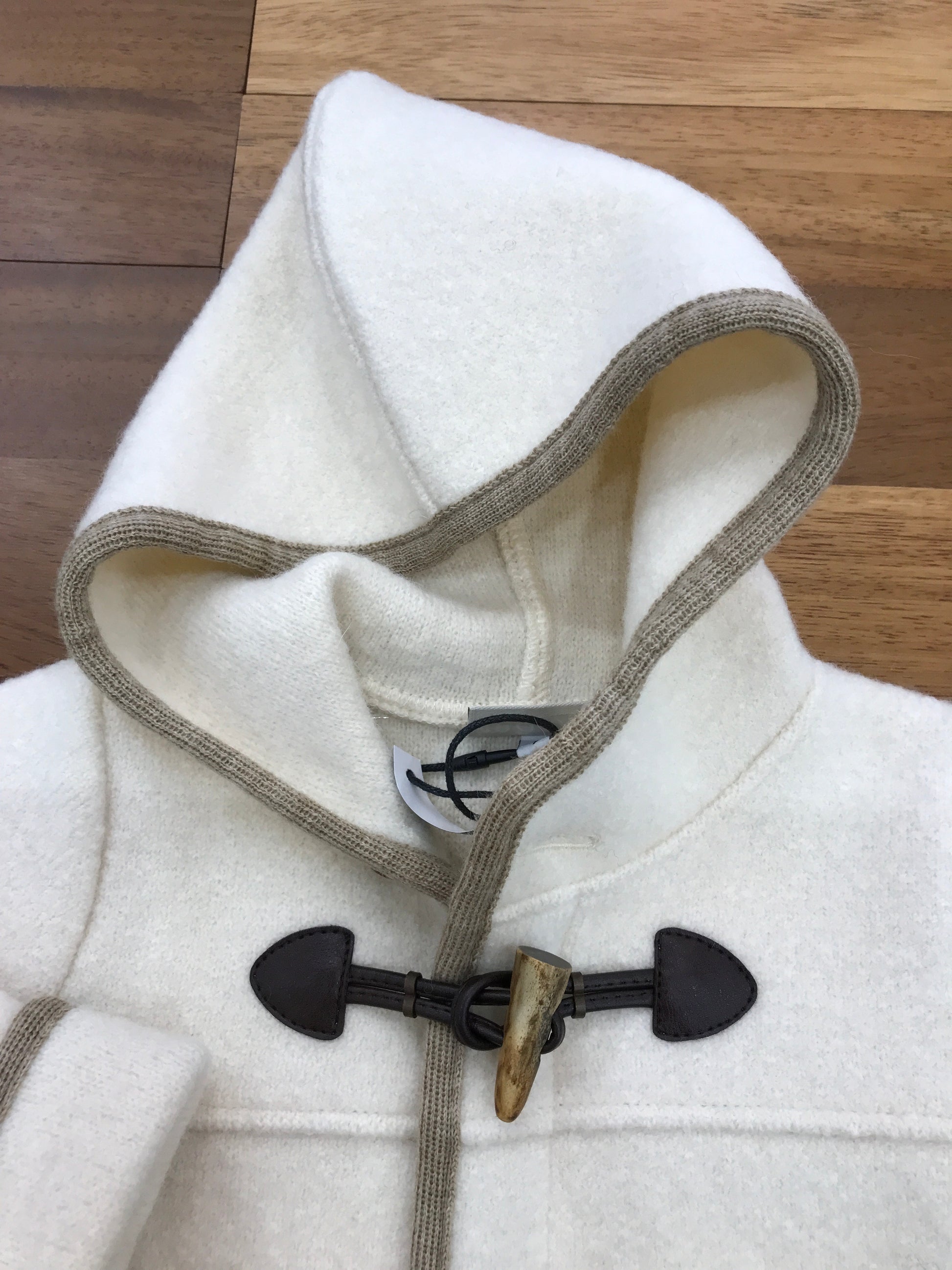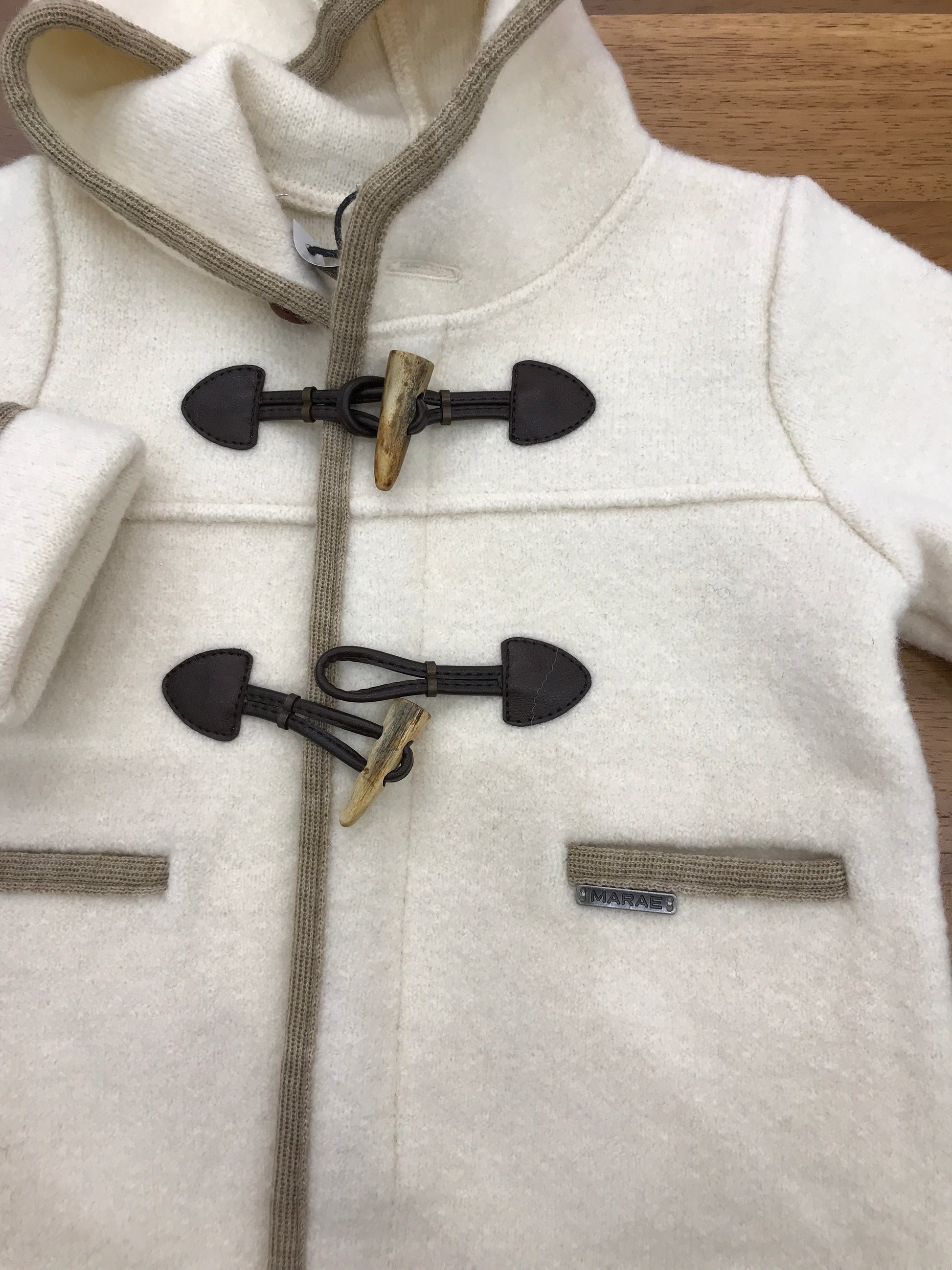 Cappotto in lana cotta color panna, caratterizzato da alamari frontali, cappuccio e comode tasche anteriori. I polsini, il bordo del cappuccio e quello delle tasche sono rifiniti in beige, per un dettaglio raffinato e distintivo.