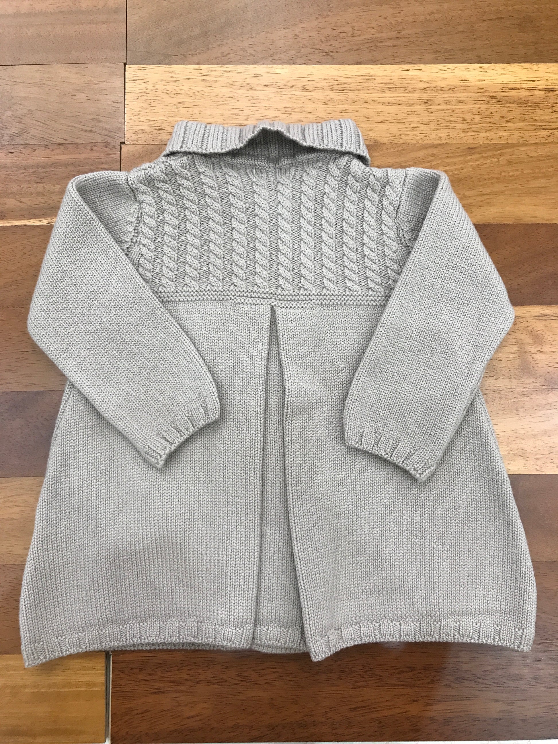 Questo cappotto in lana color tortora è caratterizzato da un mezzo collo elegante e dettagli di trecce sul petto. La chiusura frontale è impreziosita da piccoli bottoncini, mentre sul retro si ripete la lavorazione a trecce, conferendo un tocco di raffinatezza artigianale.