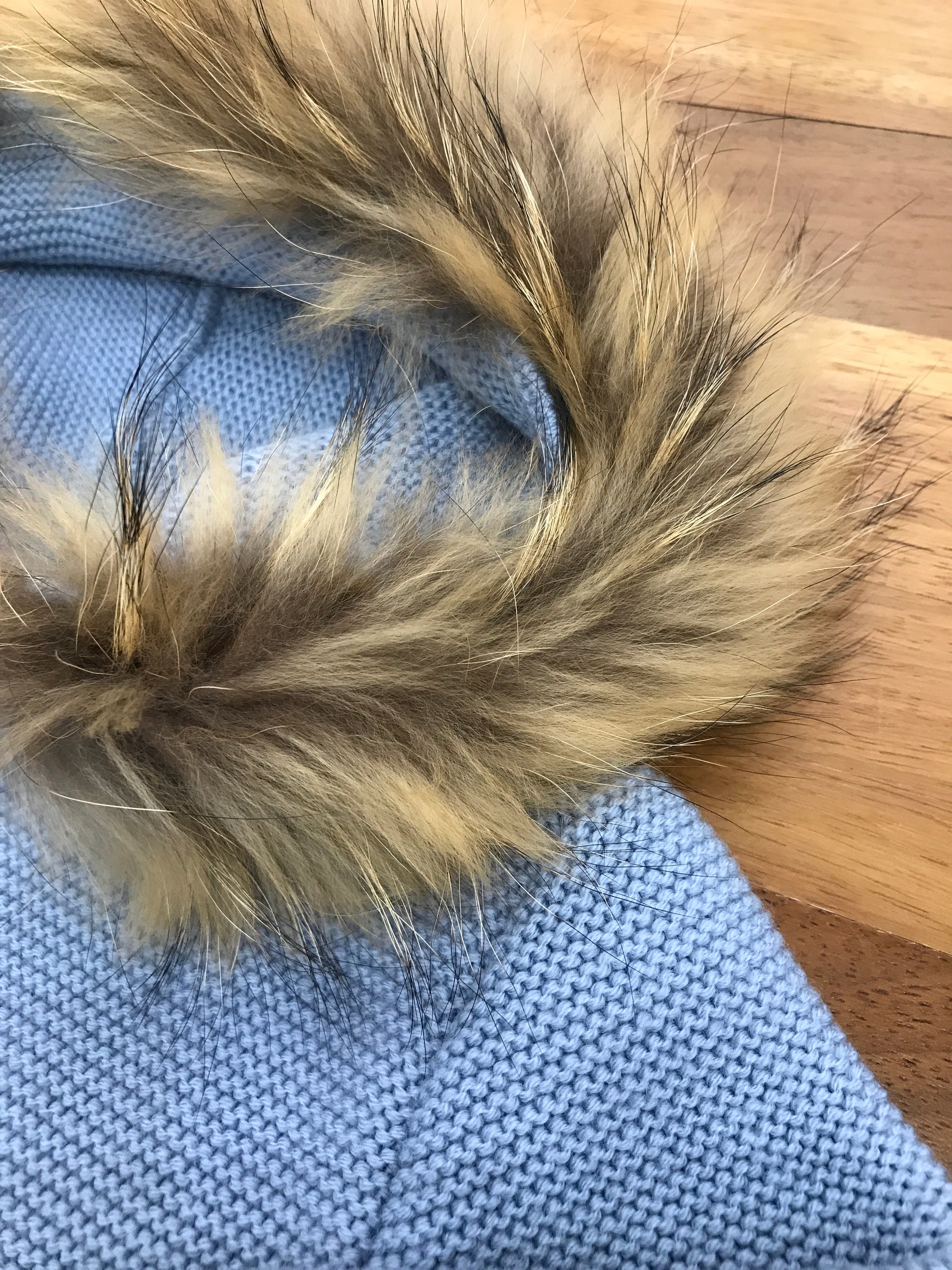 Questo cappotto celeste presenta bottoni in legno sulla parte anteriore e un cappuccio dotato di pelliccia removibile, unendo funzionalità e stile raffinato.