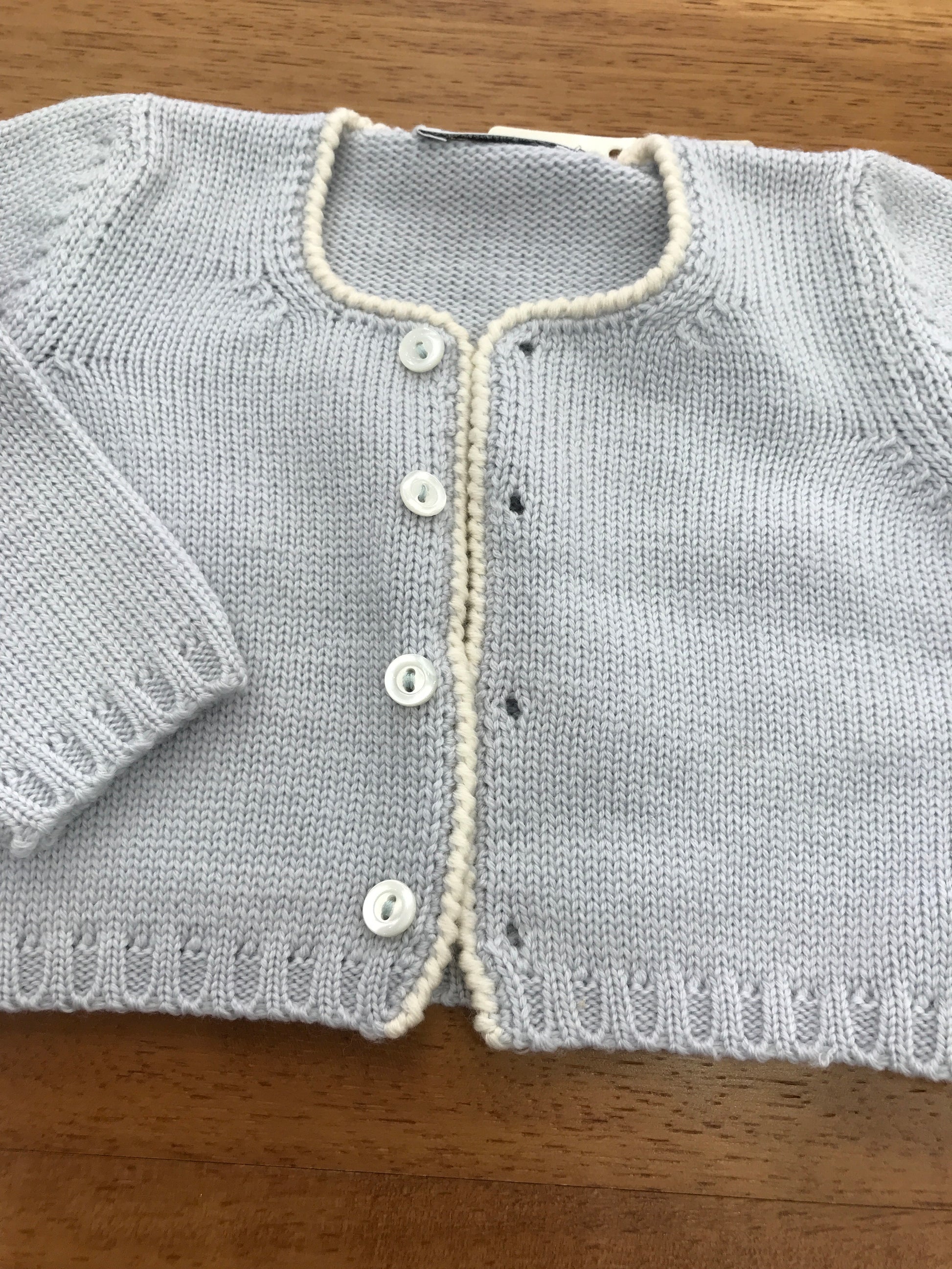 Cardigan celeste realizzato in lana, arricchito da raffinati ricami panna ai bordi e dotato di una chiusura frontale con quattro bottoni.