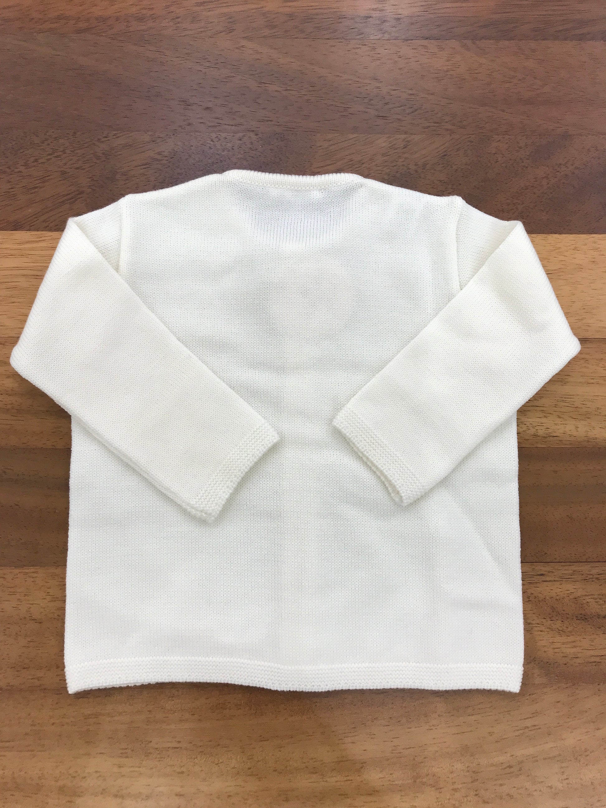 Questo cardigan in lana di colore panna presenta un design essenziale ed elegante, caratterizzato da una chiusura frontale con sei bottoni che garantisce una vestibilità comoda e sicura. Ideale per mantenere il bambino caldo senza rinunciare allo stile classico.