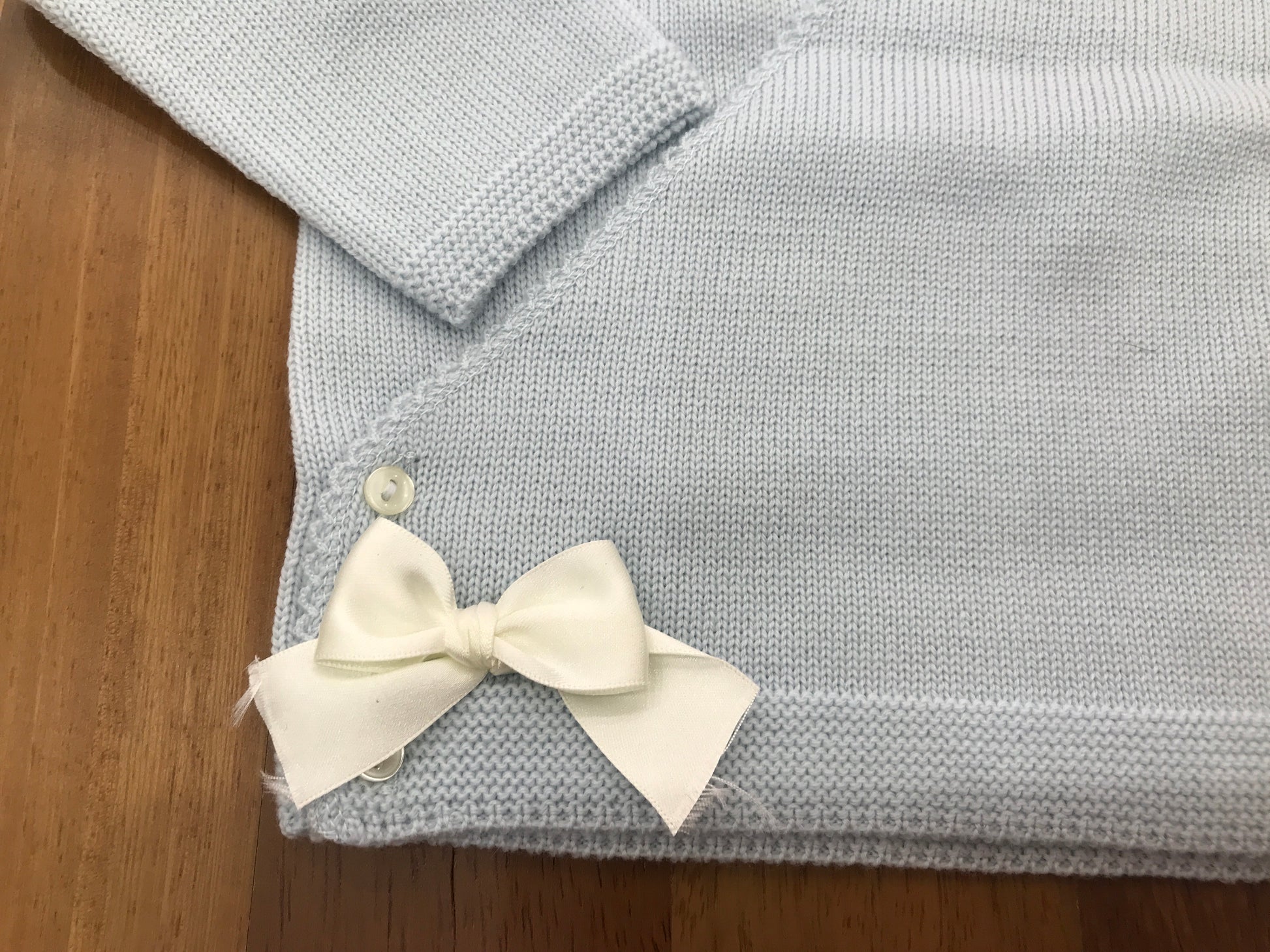 Questo cardigan in lana colore celeste presenta una raffinata chiusura ad incrocio, impreziosita da due piccoli fiocchetti bianchi posizionati alle estremità laterali. Il design è pensato per garantire comfort e stile delicato, ideale per i più piccoli, unendo praticità e un tocco elegante nei dettagli.
