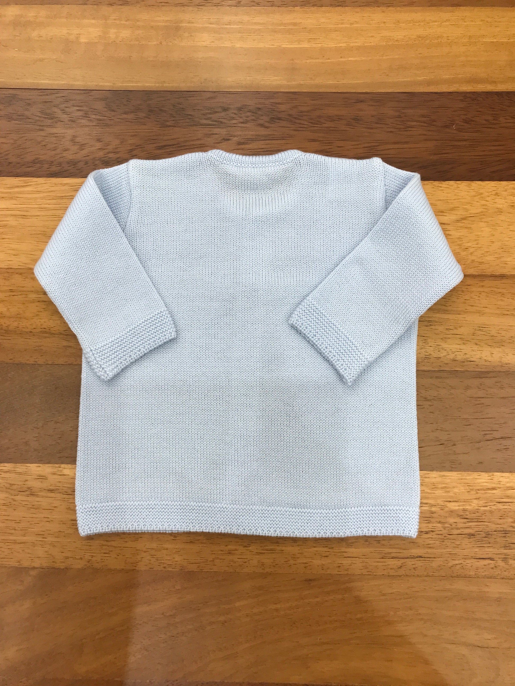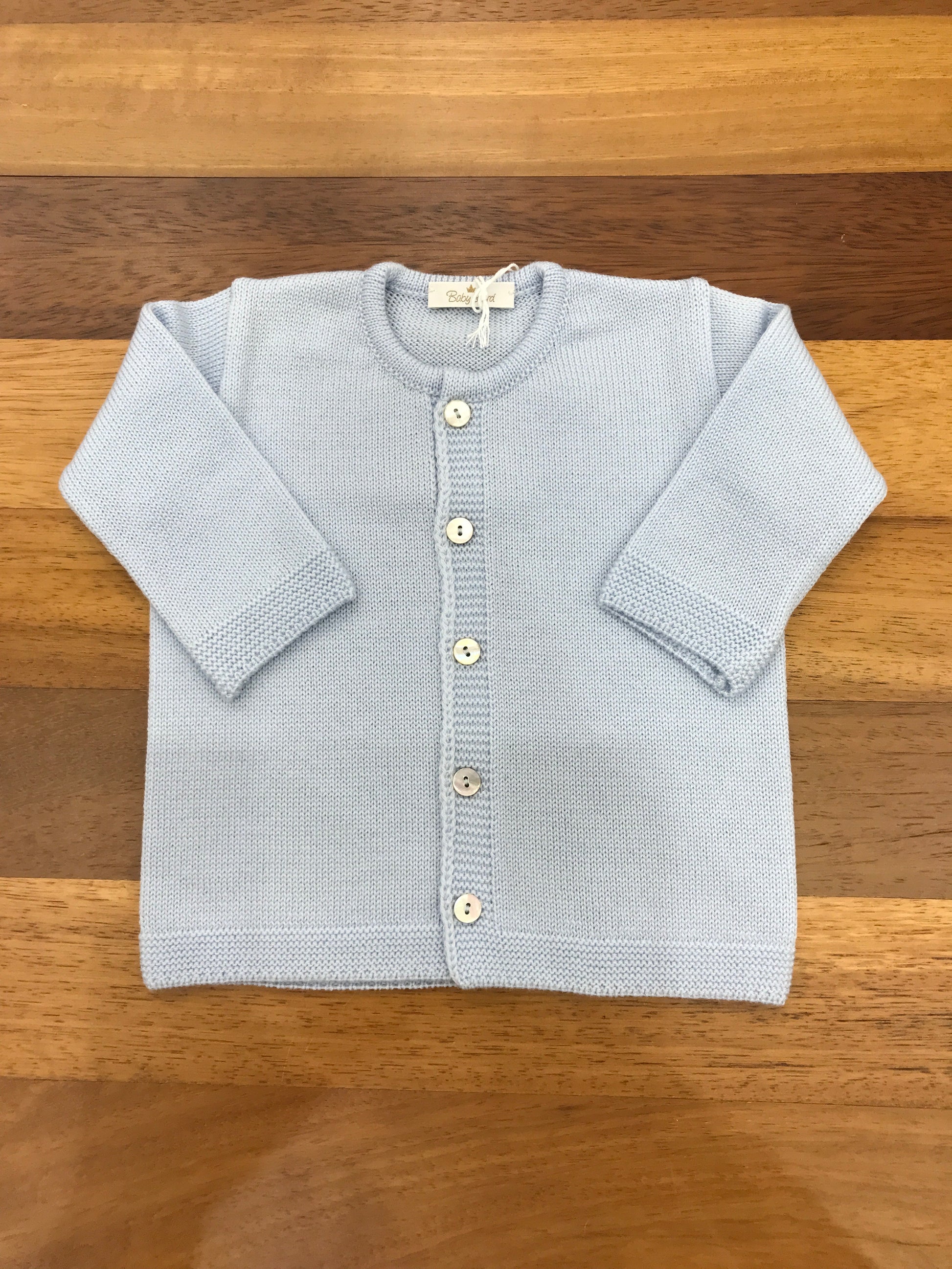 Cardigan in morbida lana color celeste, dotato di una chiusura frontale con cinque eleganti bottoncini. Questo capo d’abbigliamento essenziale garantisce comfort e praticità, ideale per completare con stile il guardaroba del tuo bambino.