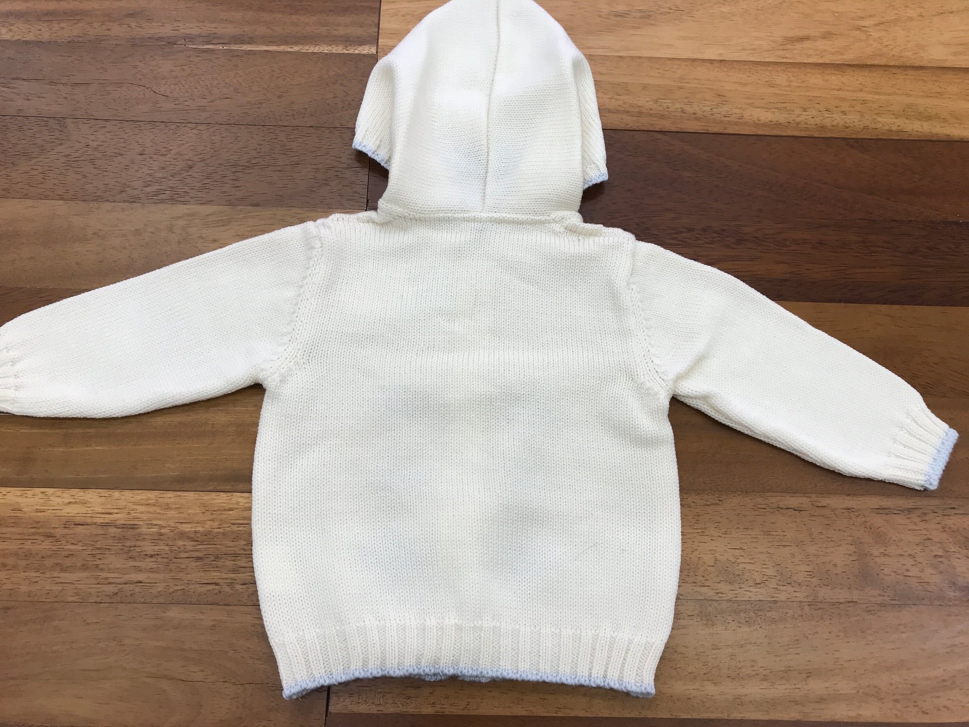 Questo cardigan in lana color panna per bebè presenta una chiusura pratica con zip e un comodo cappuccio per proteggere dal freddo. Sul davanti, è arricchito da una decorazione di rombi, disposti in gruppi di tre su ciascun lato, che conferiscono un tocco originale e raffinato al capo, unendo funzionalità e stile in un unico prodotto di alta qualità.