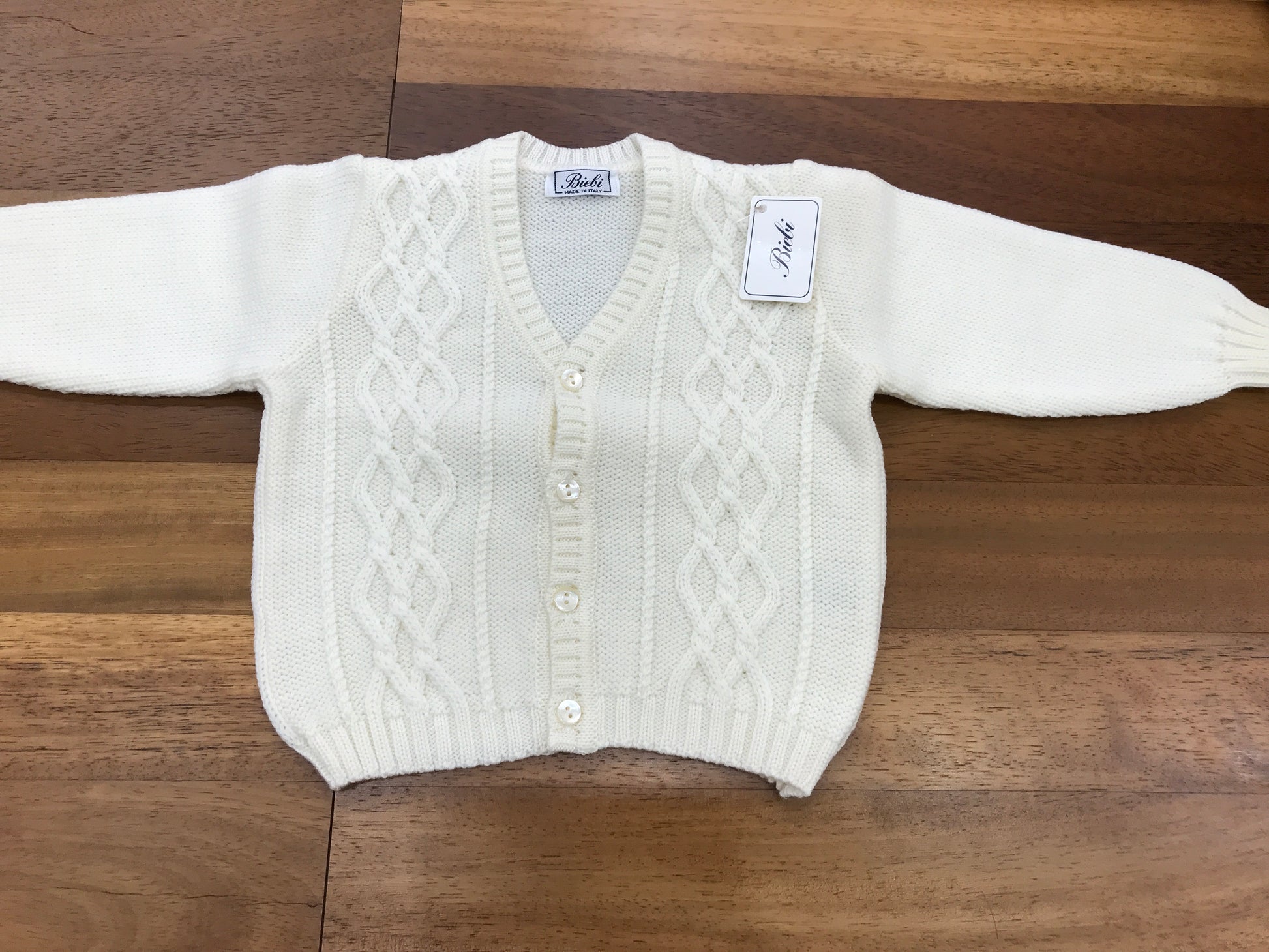 Cardigan in lana color panna caratterizzato da uno scollo e da una lavorazione doppia a rombi sulla parte frontale. Questo capo elegante è completato da quattro piccoli bottoncini che permettono una chiusura fine e curata, ideale per chi cerca un equilibrio tra stile tradizionale e dettagli raffinati.