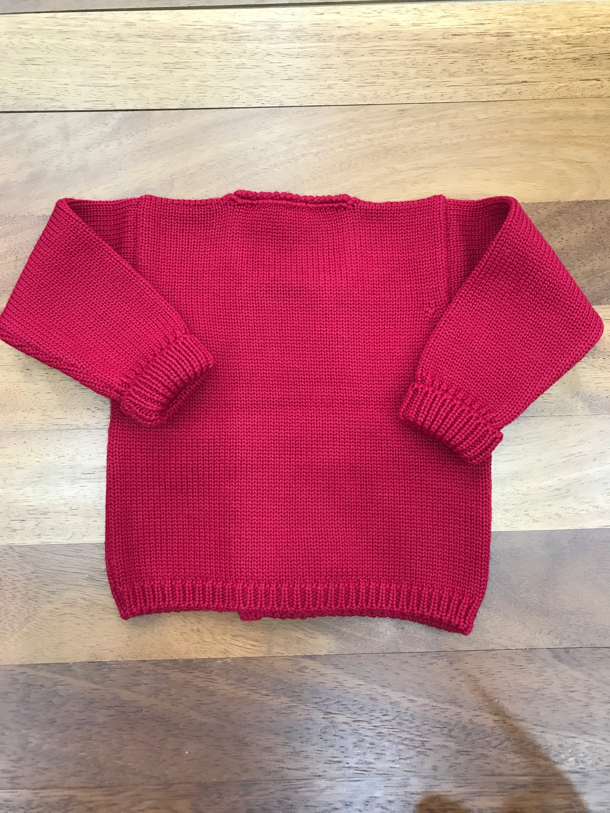 Cardigan rosso in lana, caratterizzato da un collo quadrato, taschino sul lato e bottoncini frontali.