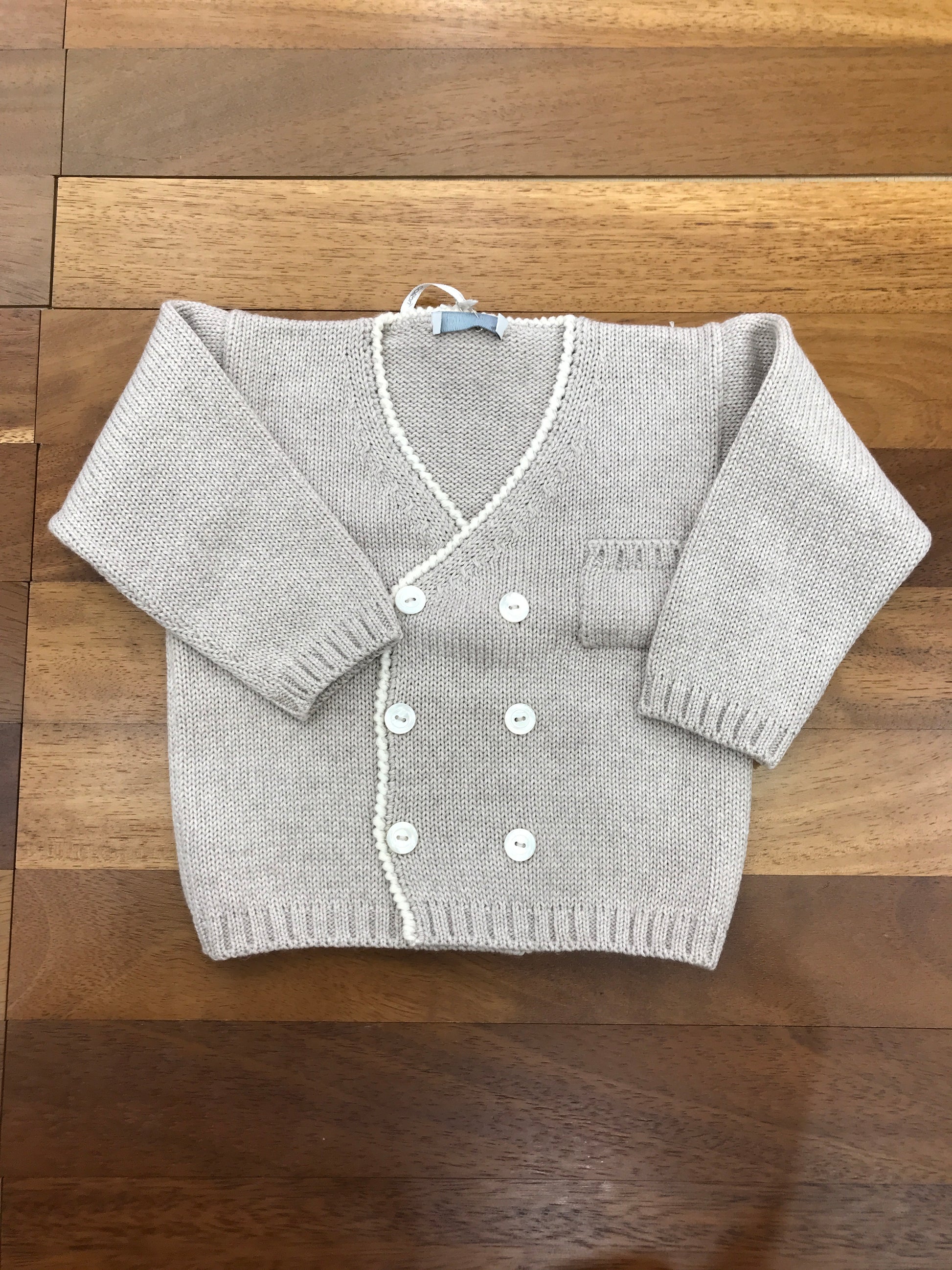 Cardigan in lana color tortora, caratterizzato da un collo con ricamo panna, bottoni frontali e un piccolo taschino laterale sul davanti.