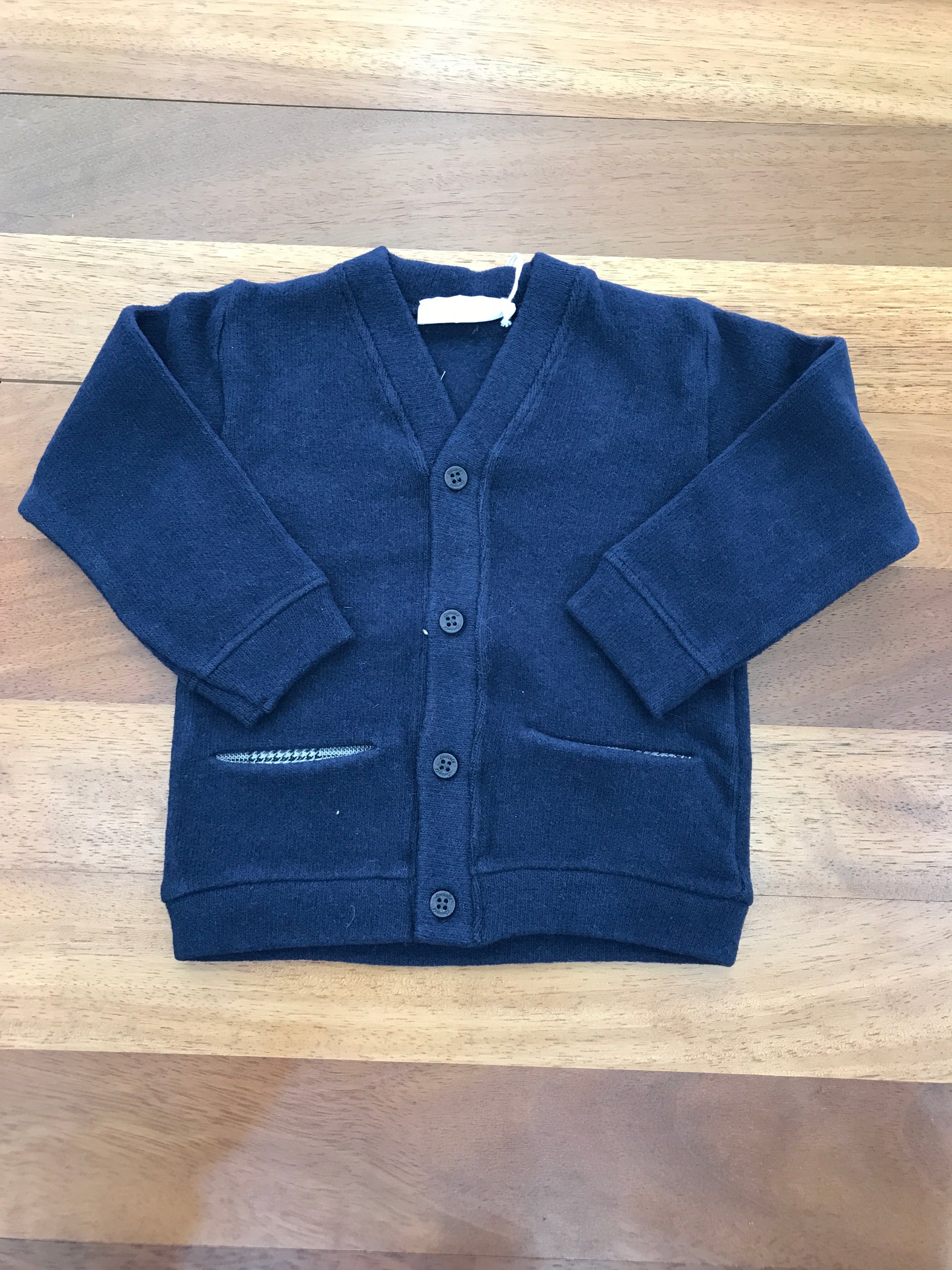 Cardigan in lana blu scuro, dotato di tasche anteriori e chiusura con quattro bottoni.