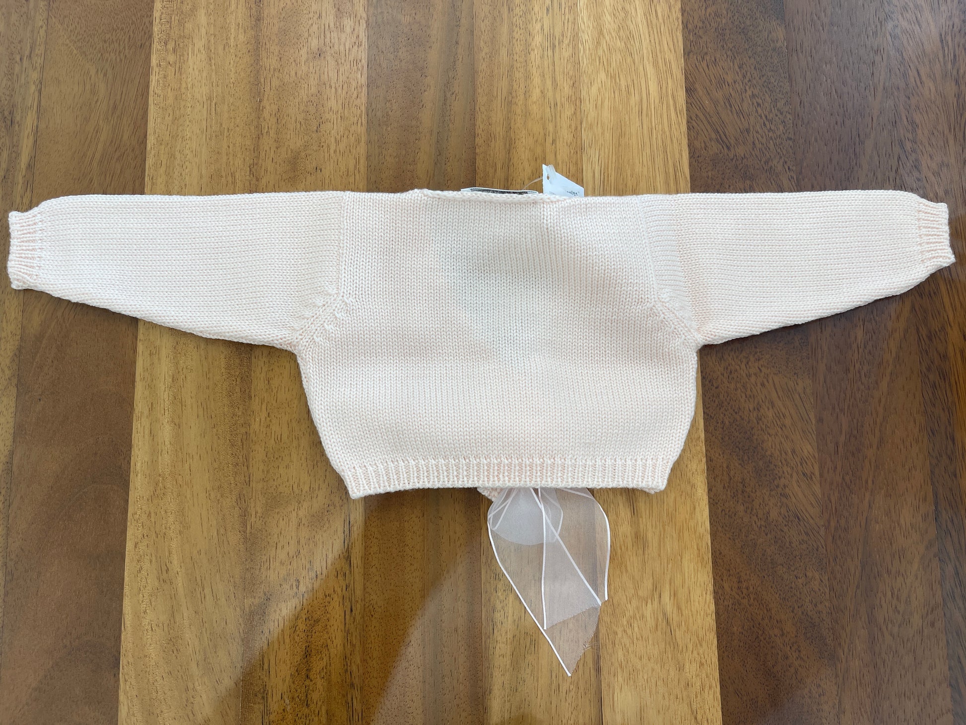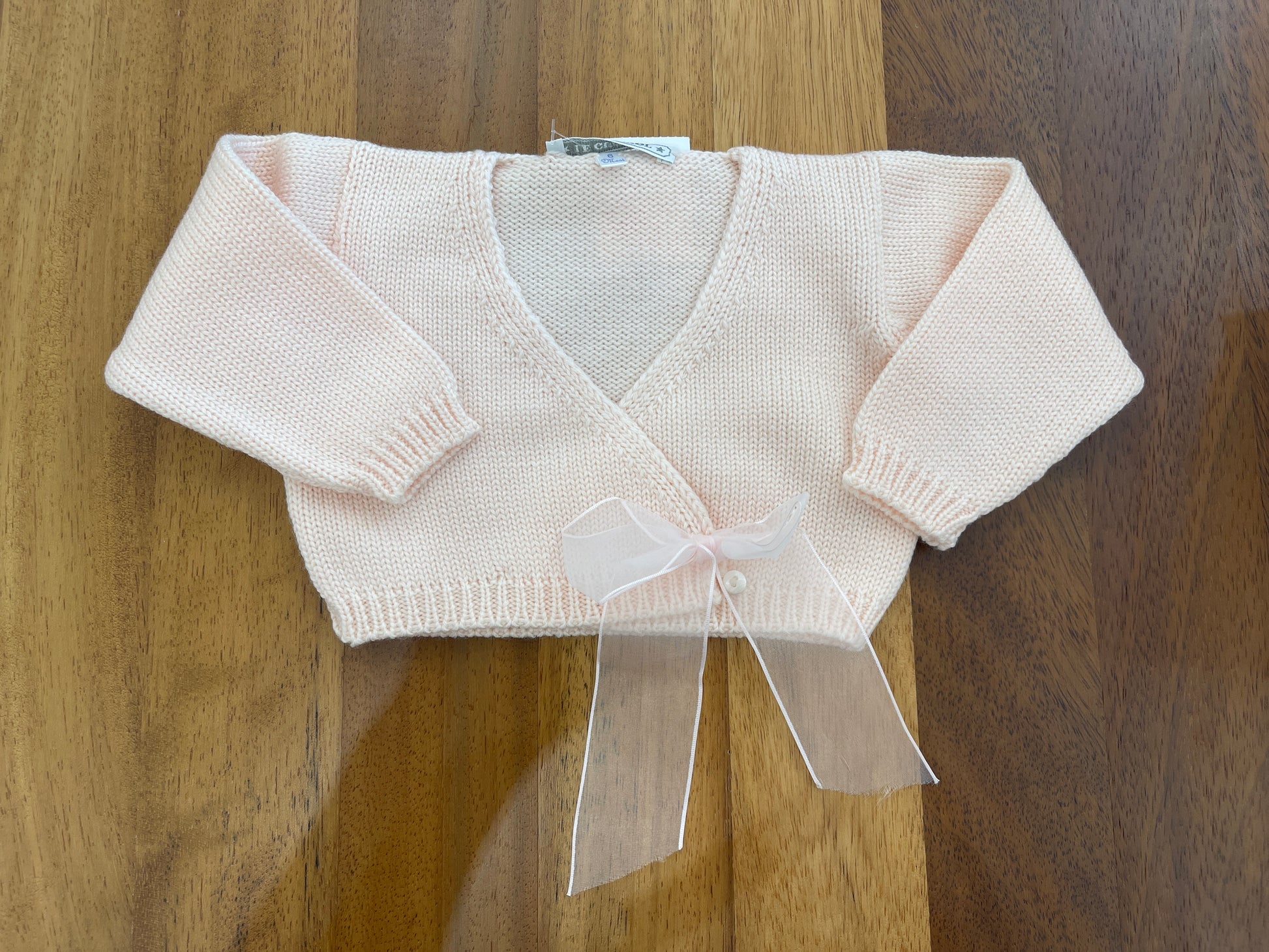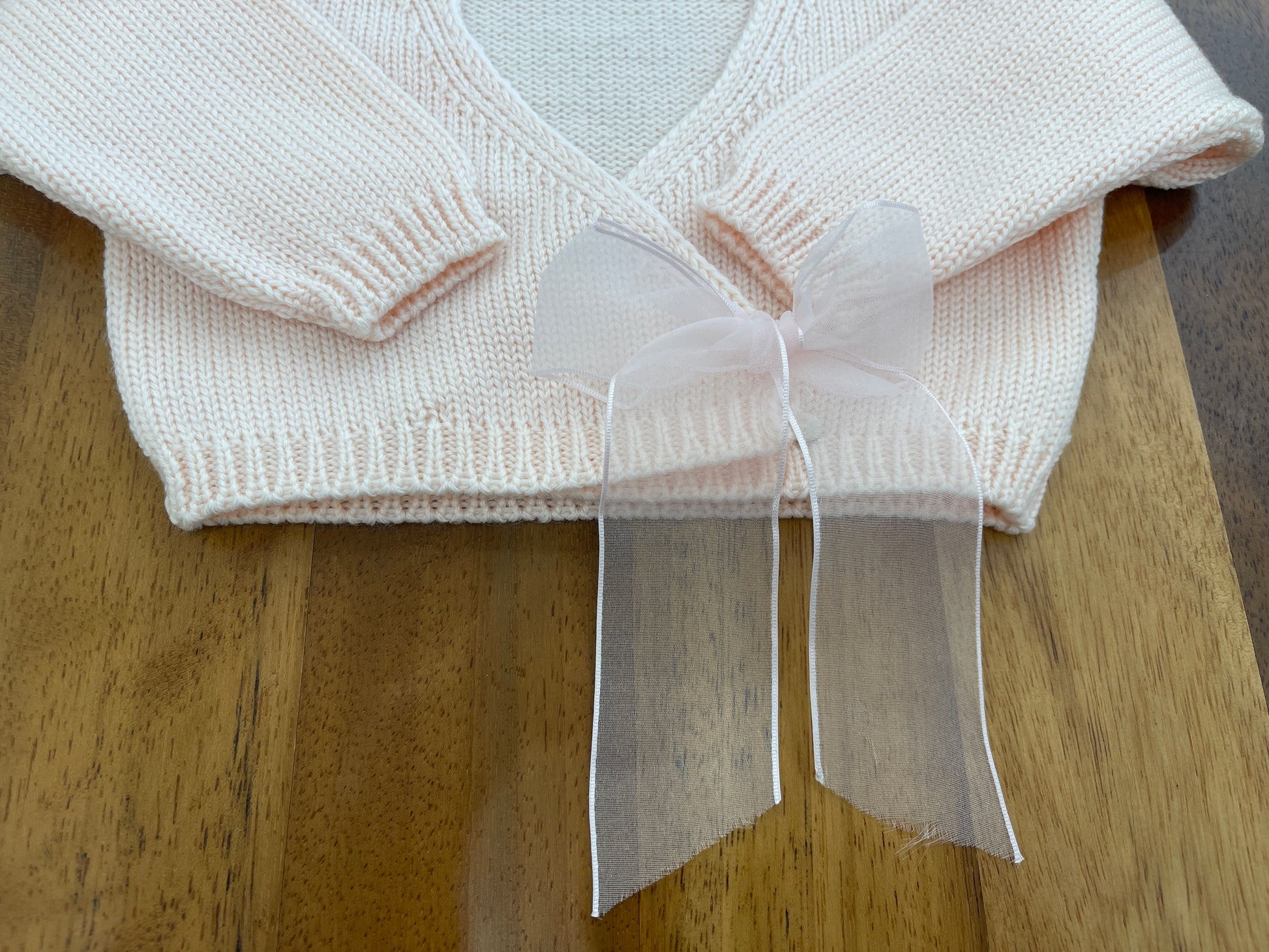 Cardigan in lana rosa con chiusura a incrocio, valorizzata da un piccolo bottoncino impreziosito da un delicato fiocchetto in organza.