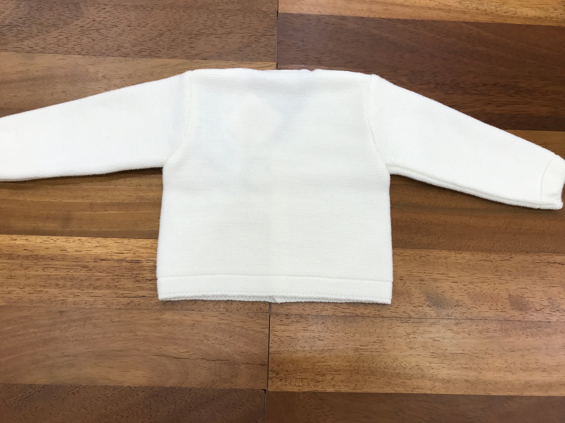 Cardigan in lana color panna, caratterizzato da una chiusura con tre bottoncini piccoli e raffinati. Presenta dettagli a punto sul davanti che aggiungono un tocco di eleganza e lavorazione artigianale, rendendolo un capo sofisticato e versatile per diverse occasioni.