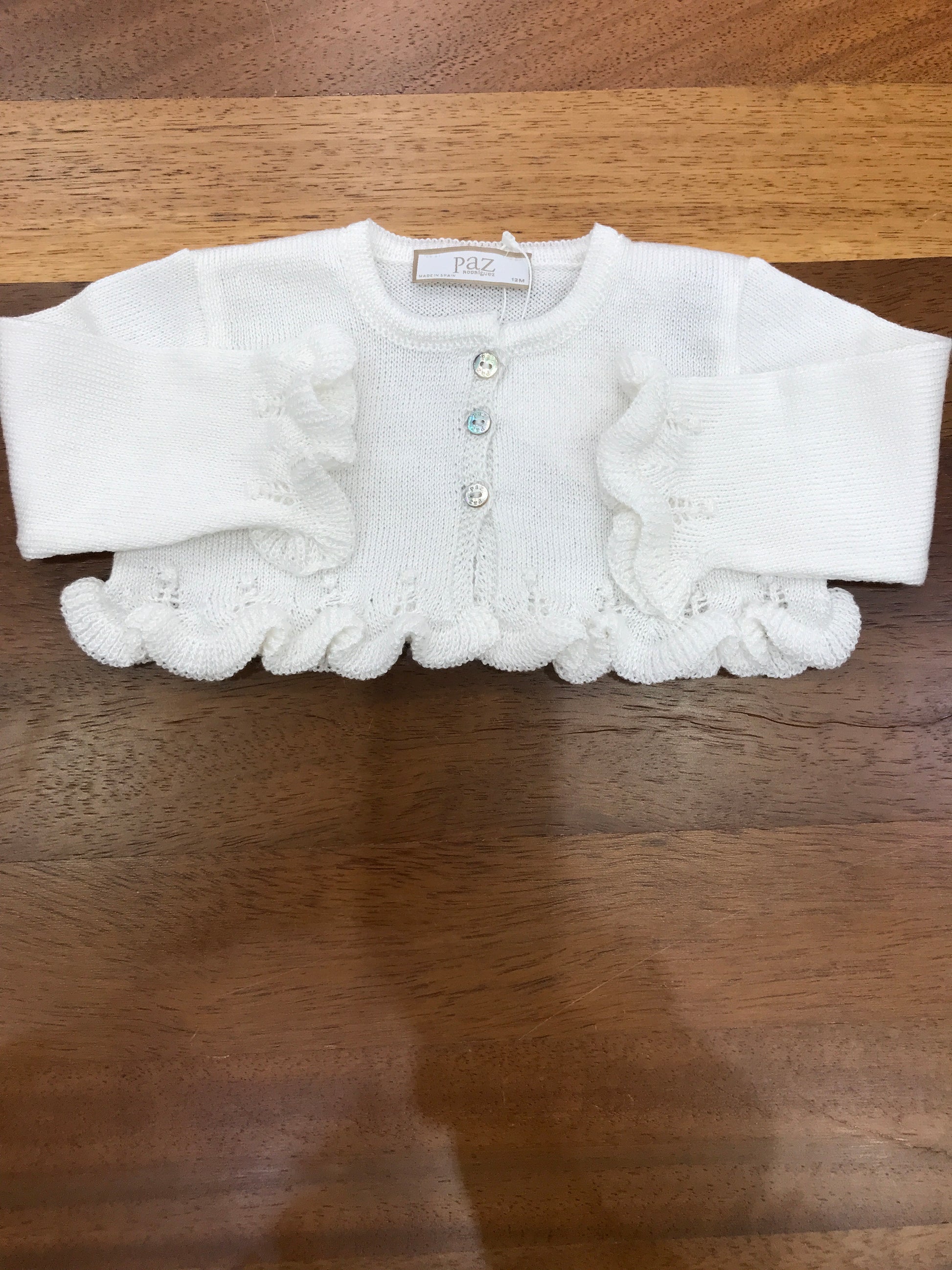 Elegante cardigan Paz Rodriguez in cotone bianco con maniche lunghe rifinite da un delicato smerlato ai polsini. Chiusura frontale con tre bottoncini discreti che garantiscono praticità e stile. Un capo versatile e raffinato, perfetto per completare il guardaroba con sobria eleganza.