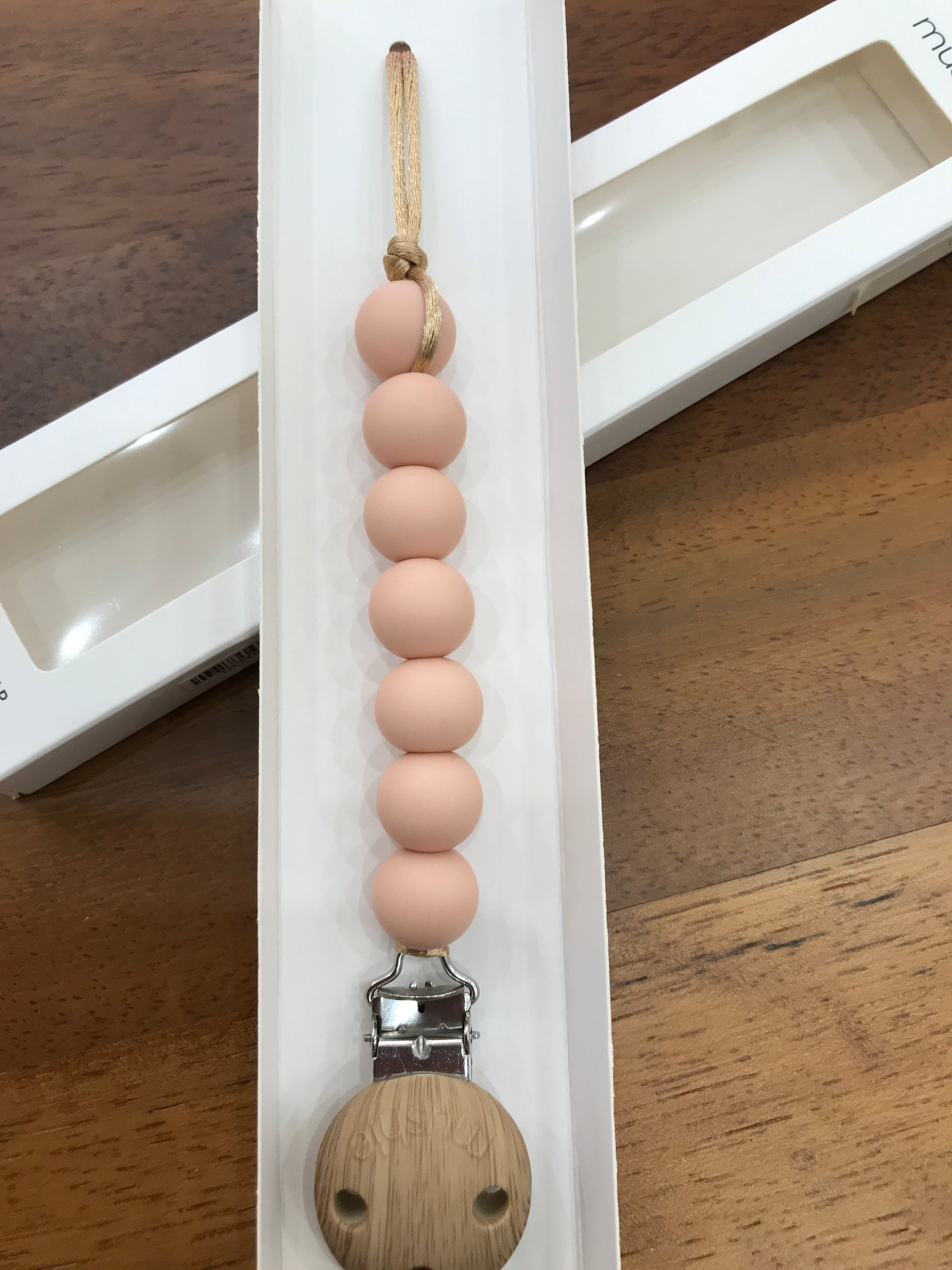 Questa catenina per ciuccio, realizzata in silicone resistente e sicuro, presenta una tonalità rosa elegante. Progettata per garantire praticità e igiene, mantiene il ciuccio sempre a portata di mano, evitando che cada o si perda durante l’uso quotidiano.