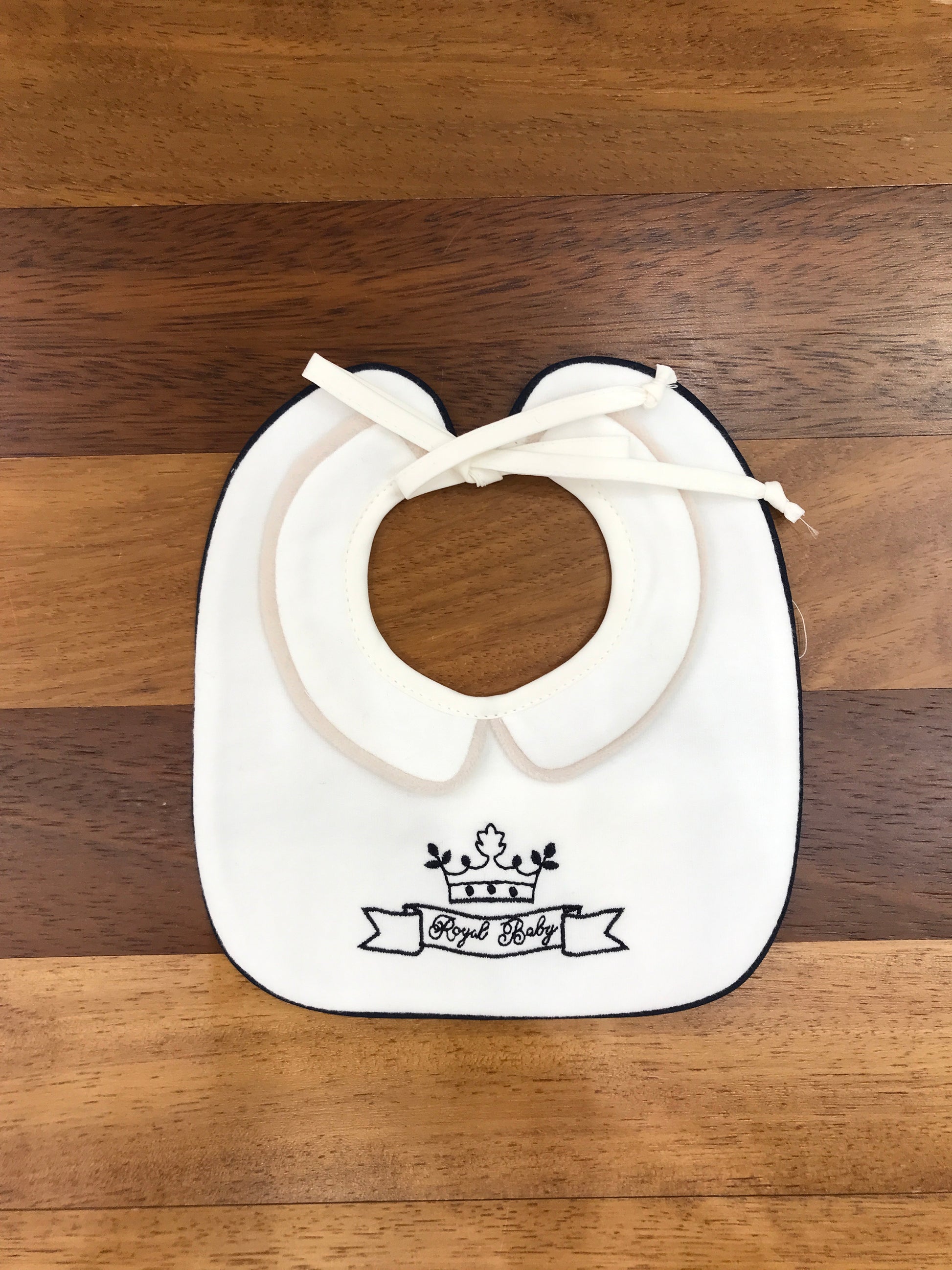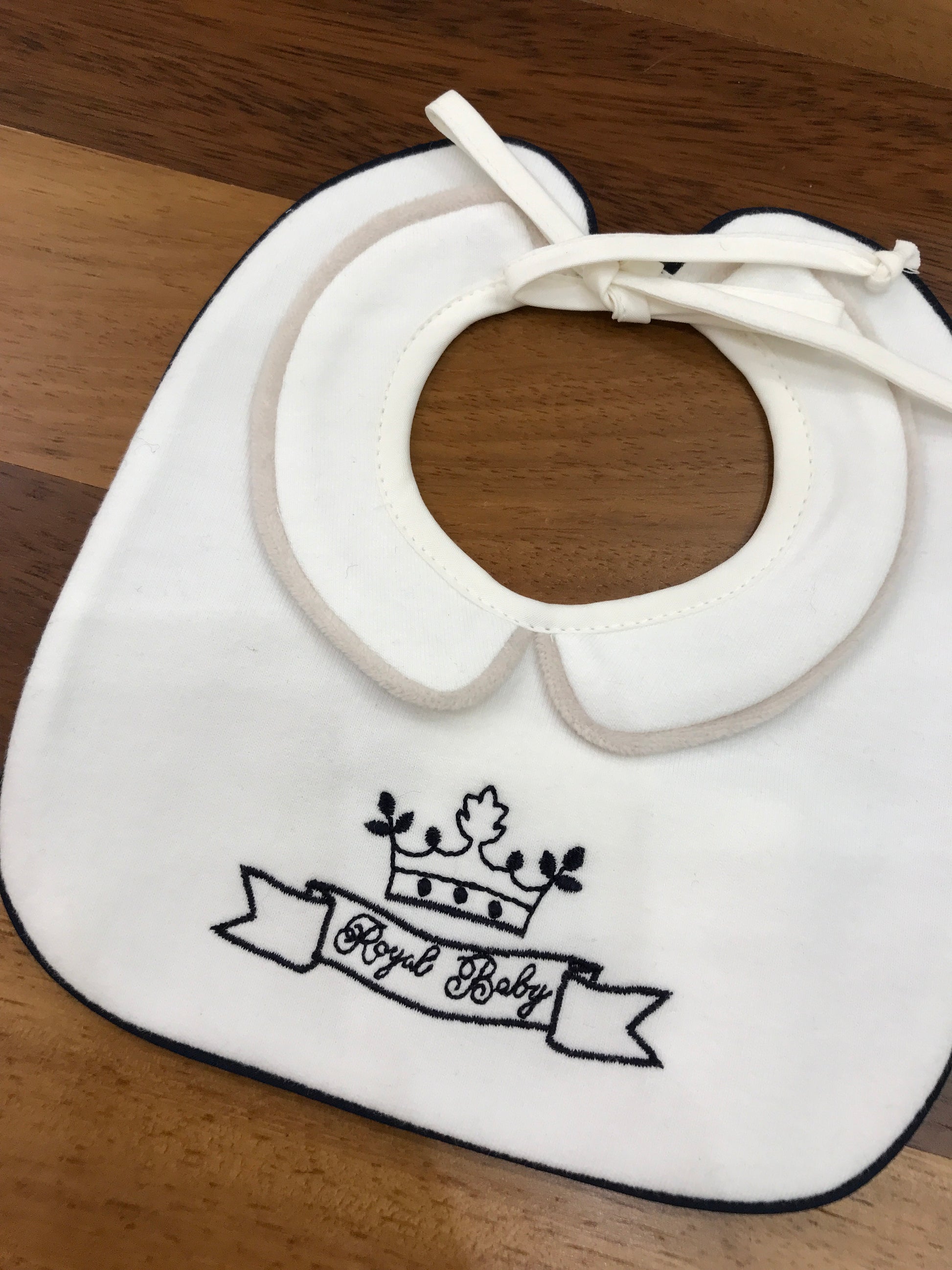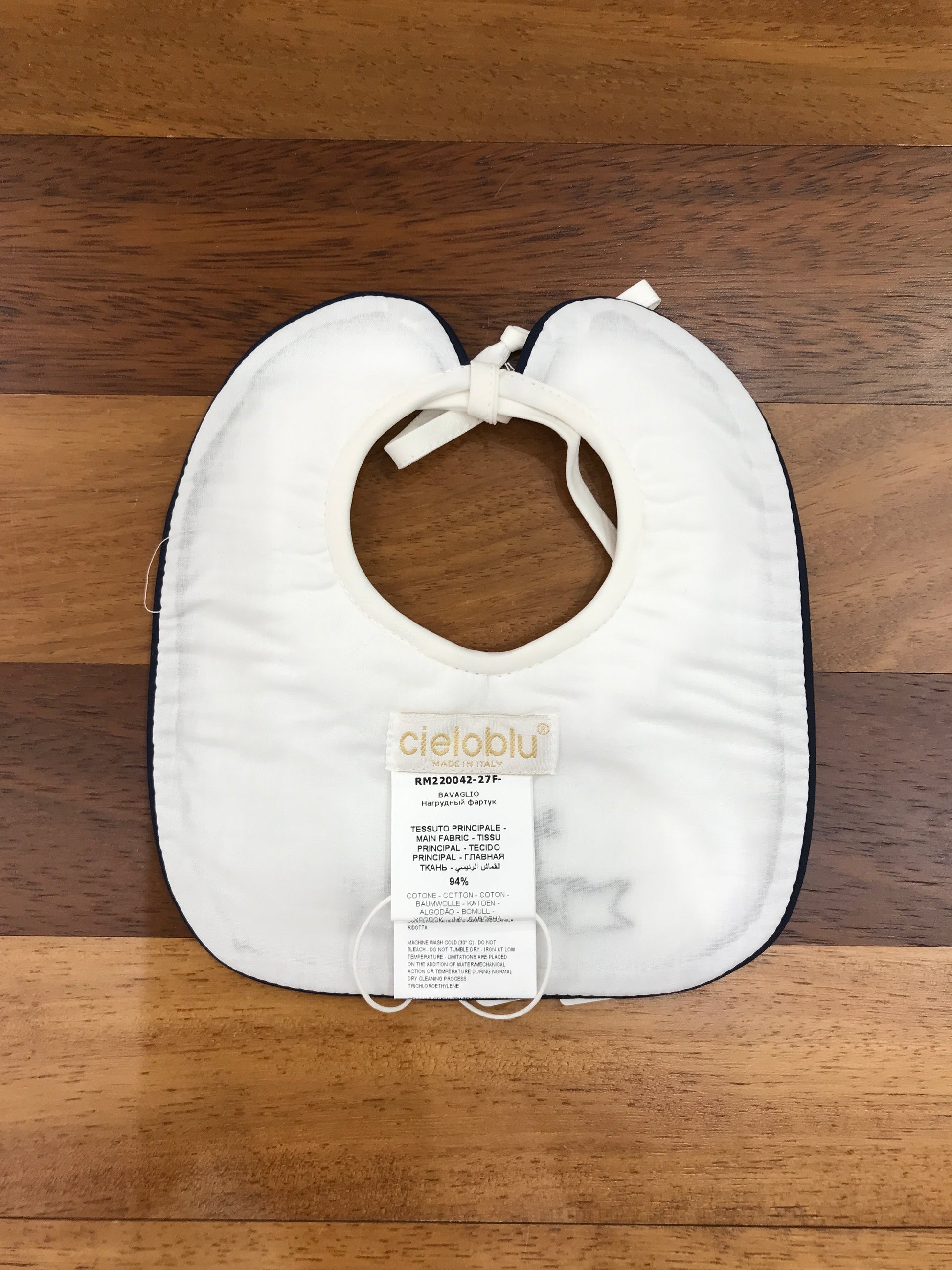Bavaglino in cotone bianco con elegante bordatura blu scuro e ricamo tono su tono sulla parte anteriore. Un accessorio pratico e raffinato per i più piccoli, realizzato con attenzione ai dettagli e alla qualità dei materiali.