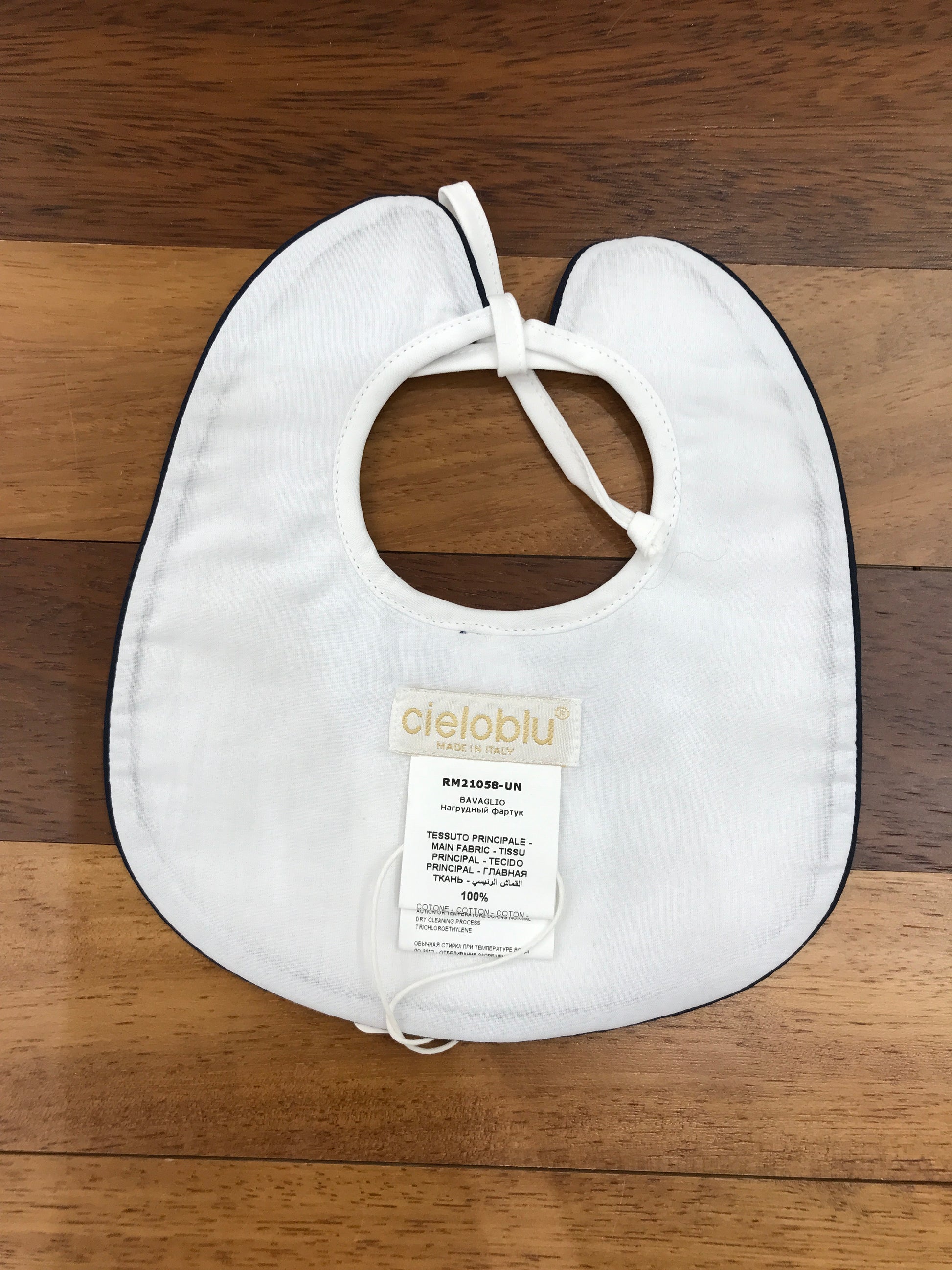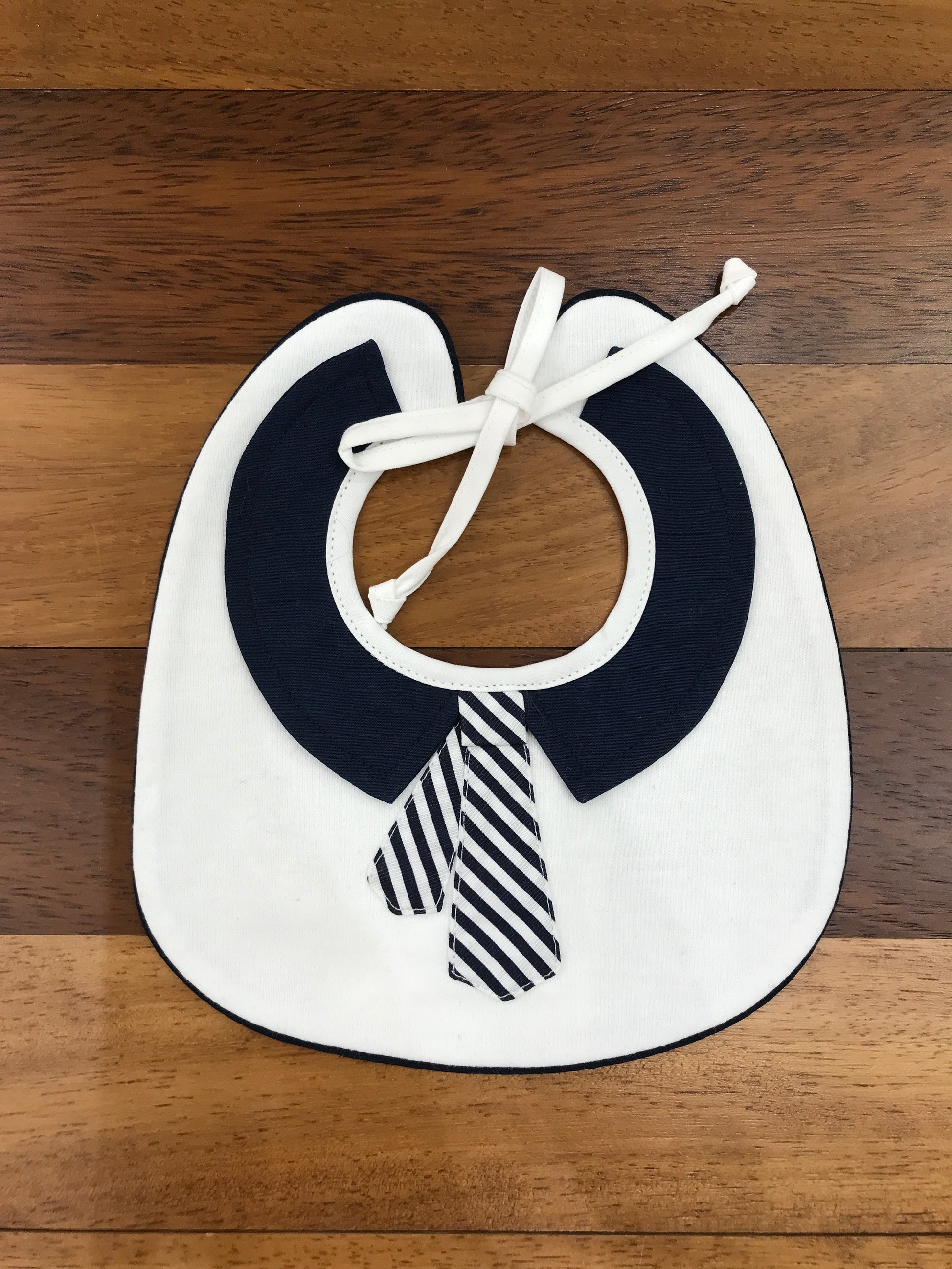Elegante bavetta in puro cotone con finitura bianca e accenti blu, arricchita da una sofisticata finta cravatta a righe bianche e blu. Un accessorio versatile che combina praticità e stile, perfetto per occasioni speciali e momenti quotidiani. La qualità del cotone garantisce morbidezza e traspirabilità, mentre i dettagli ricercati la rendono un capo di carattere per il guardaroba del piccolo.