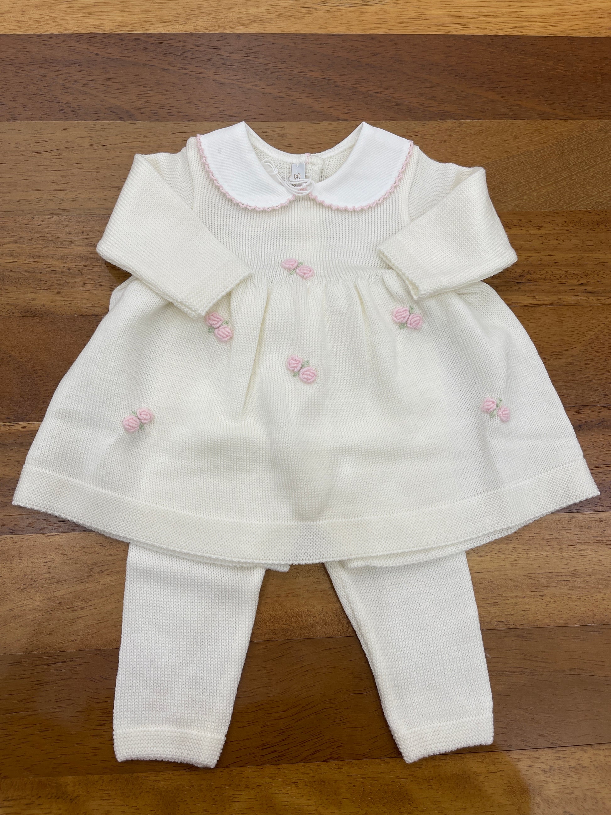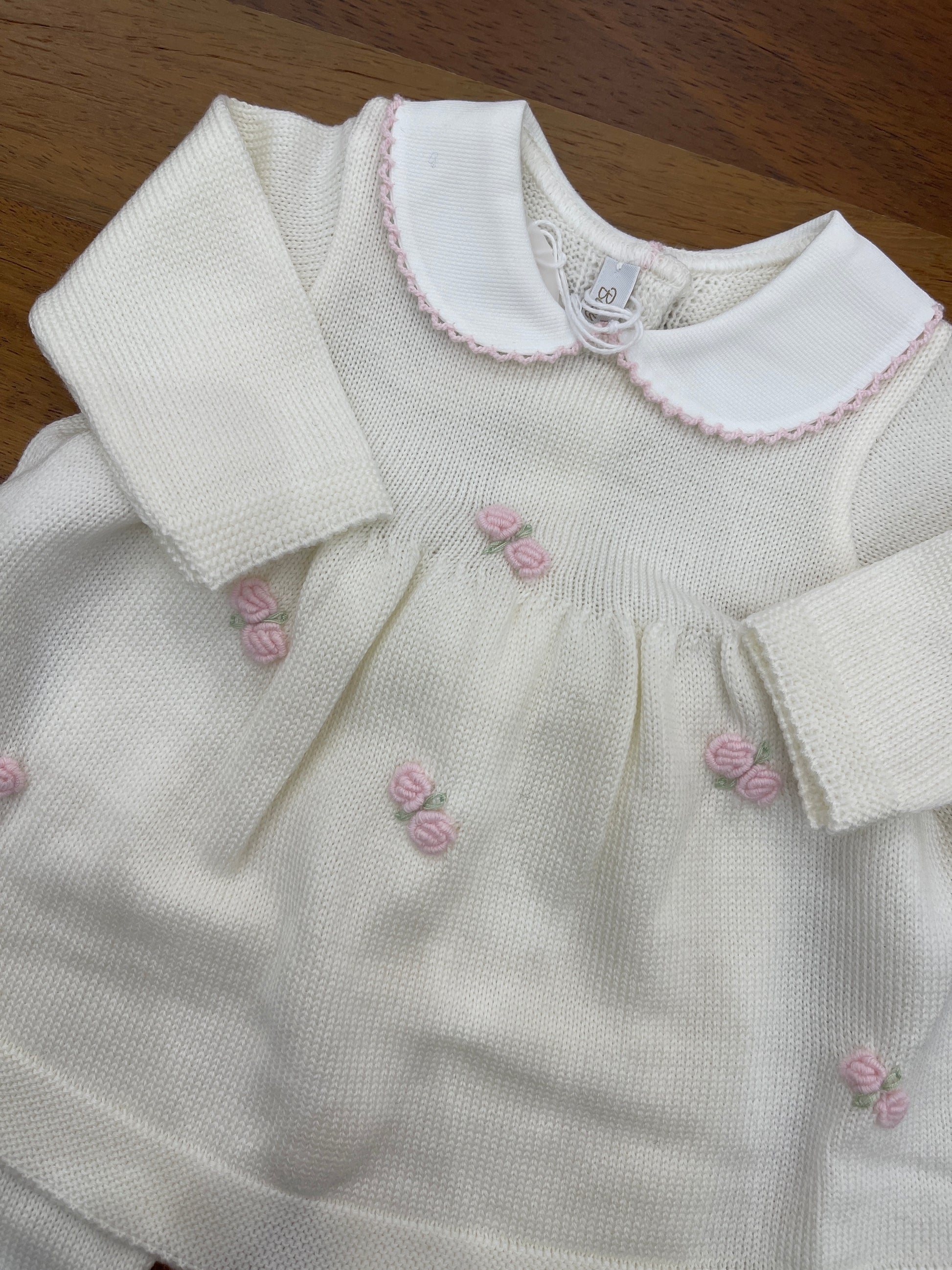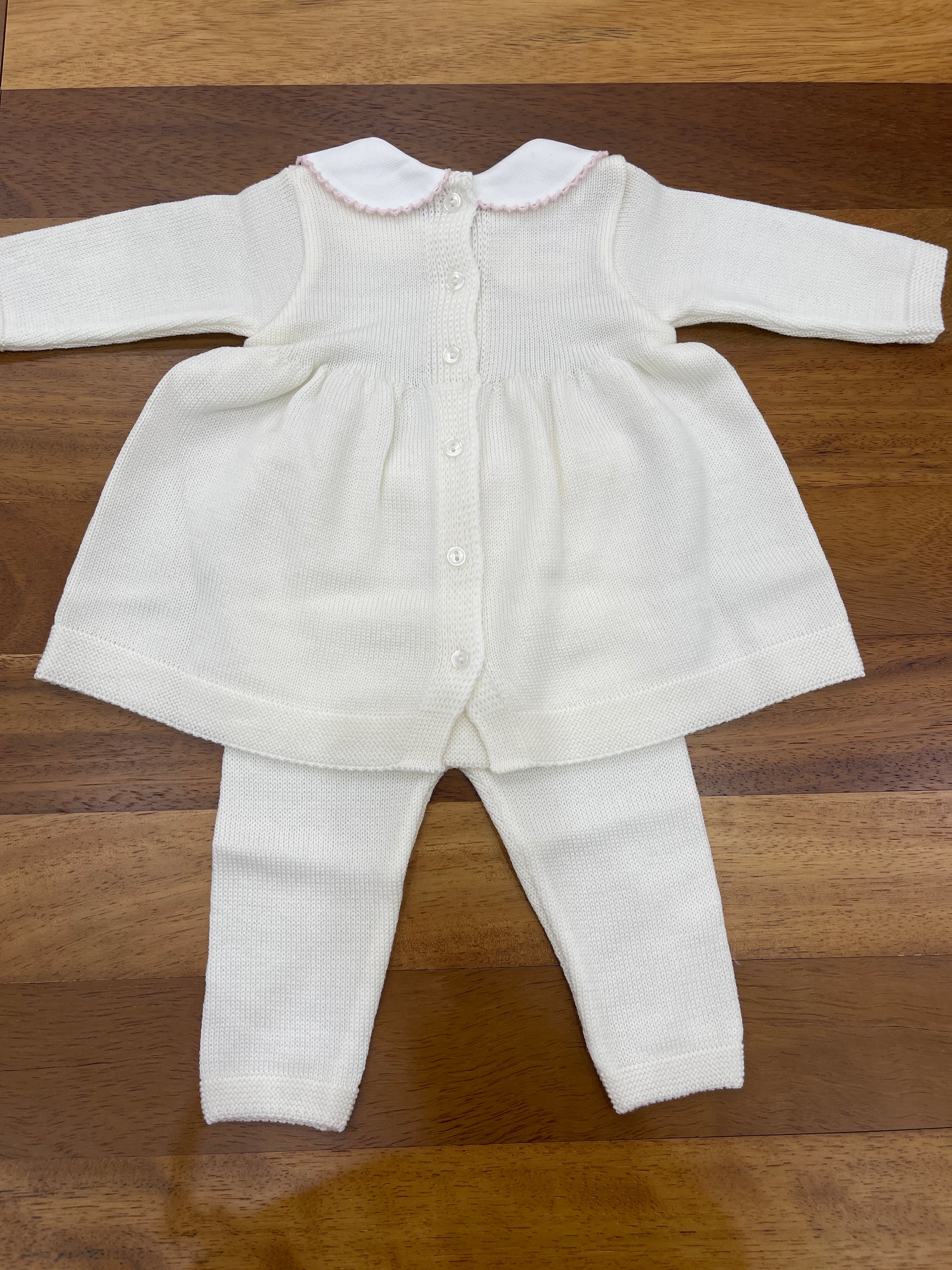 Completo in lana composto da due pezzi, con pantaloni semplici. La parte superiore è decorata con fiocchetti ricamati e presenta un colletto bianco impreziosito da un ricamo rosa.