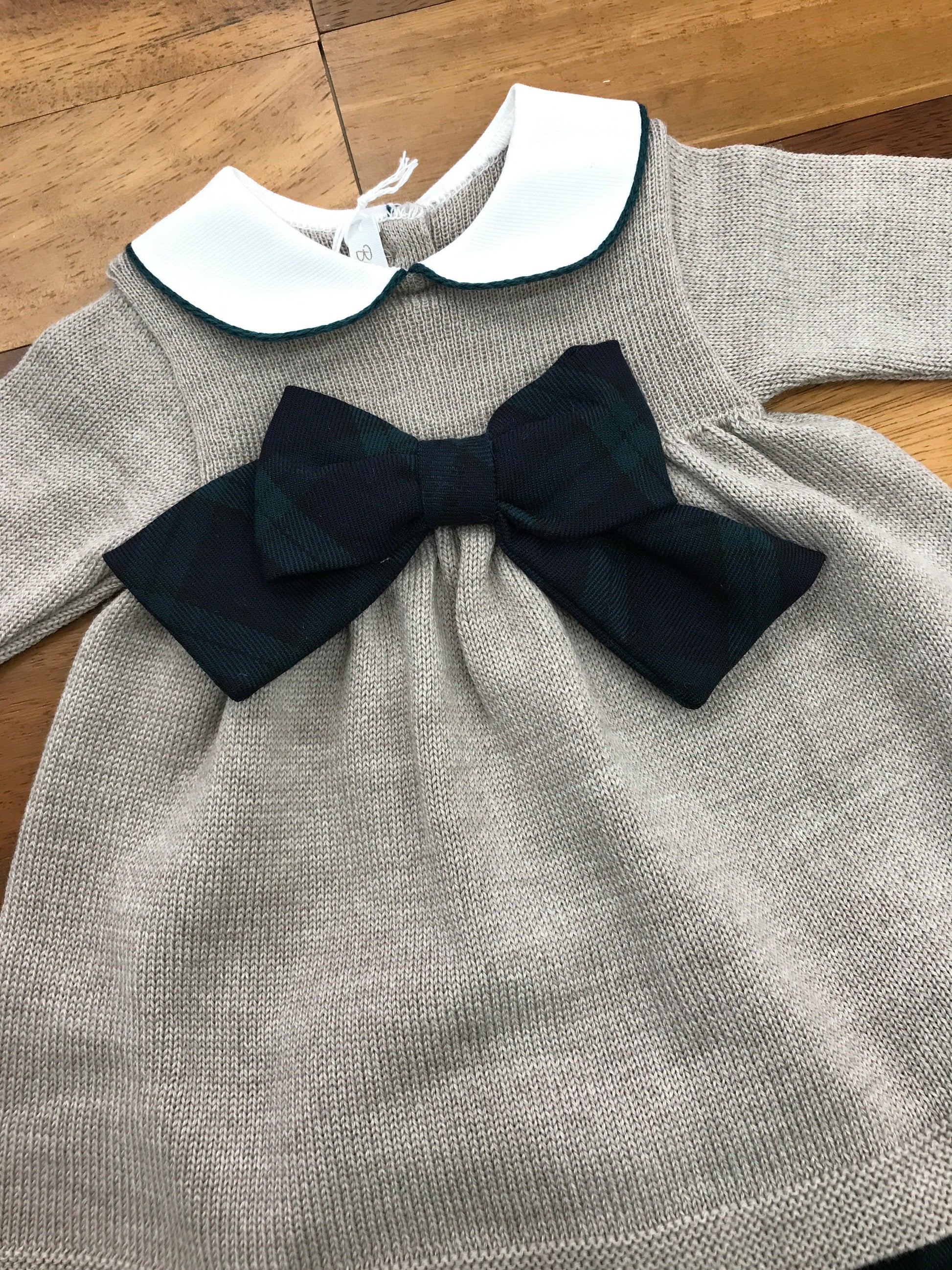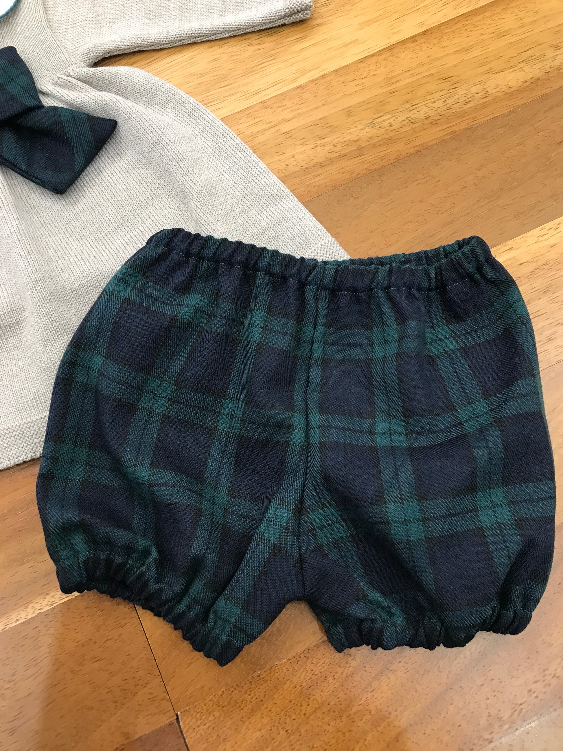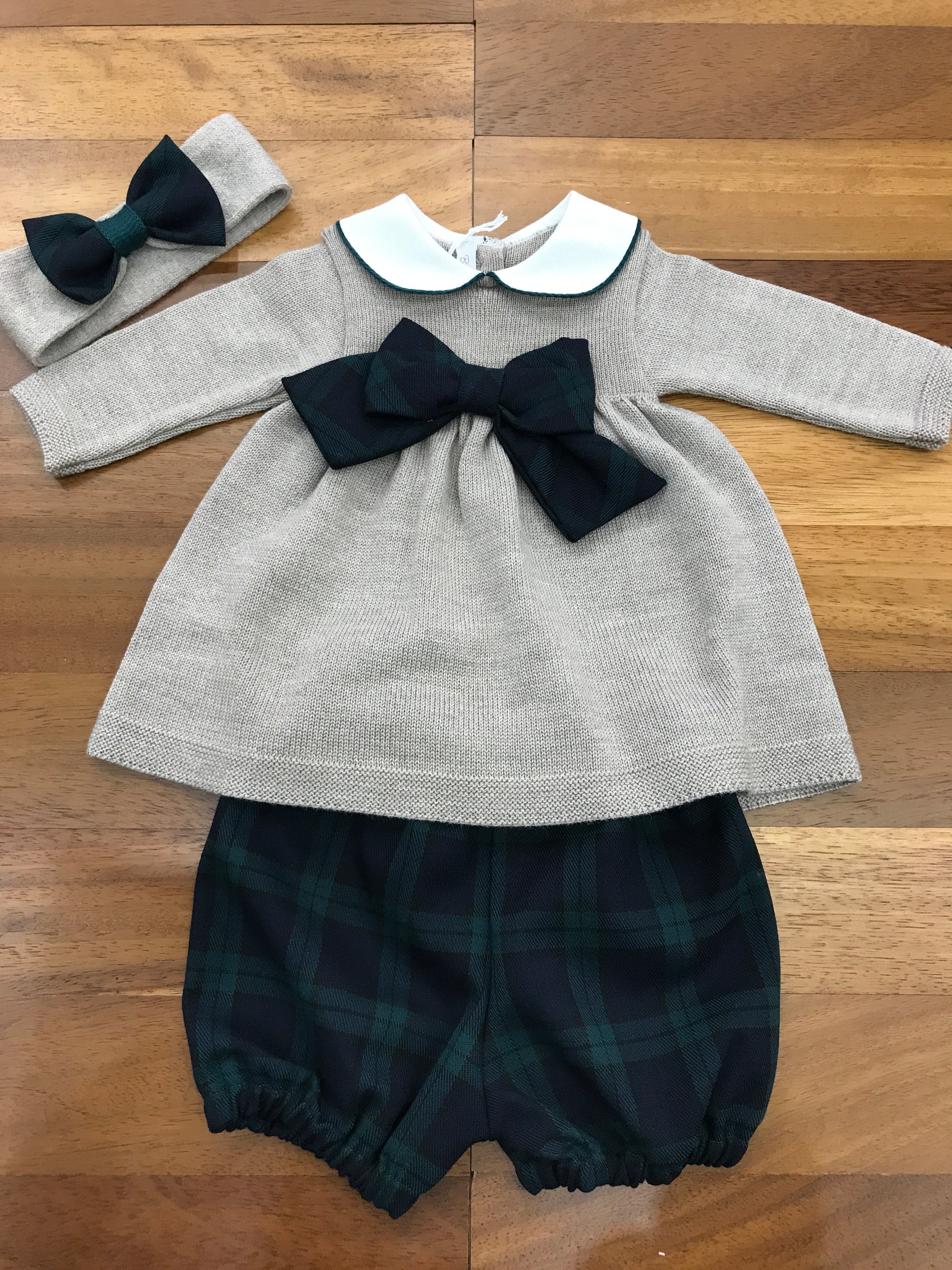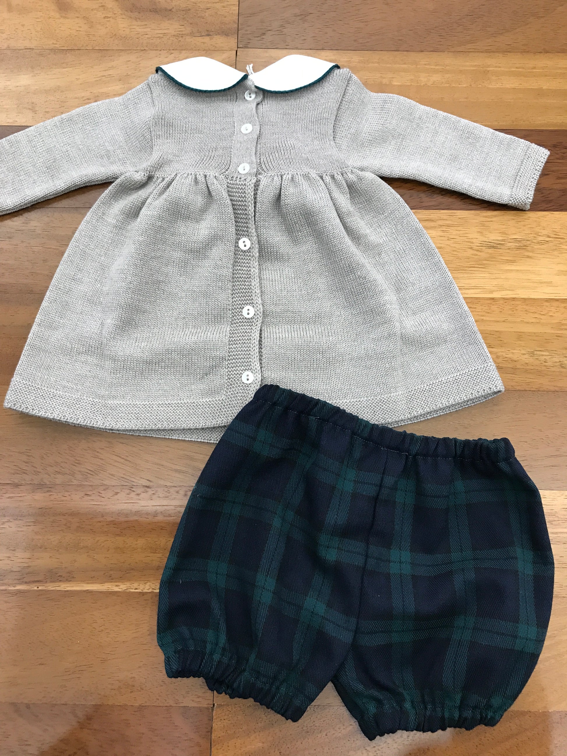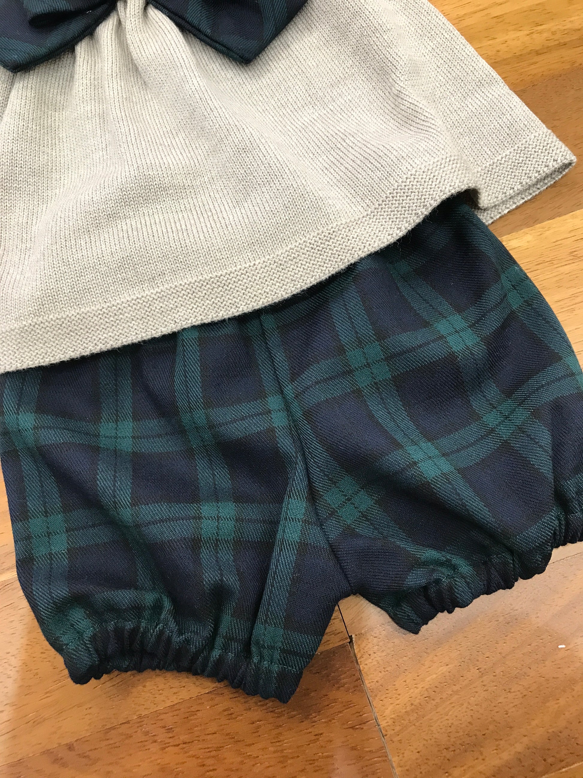 Completino realizzato in lana con tonalità torotra e verde scozzese, caratterizzato da un fiocco scozzese verde al centro. La parte inferiore è una culotte verde scozzese, mentre il colletto bianco è rifinito con dettagli in verde scozzese.