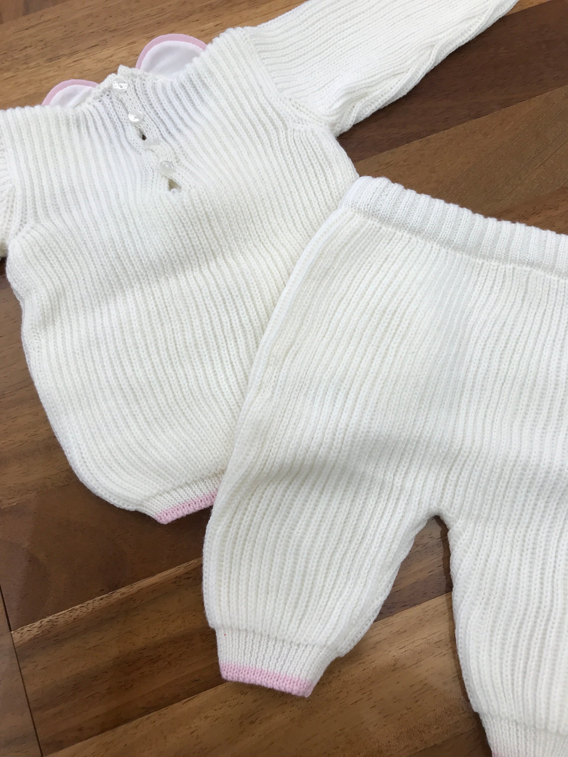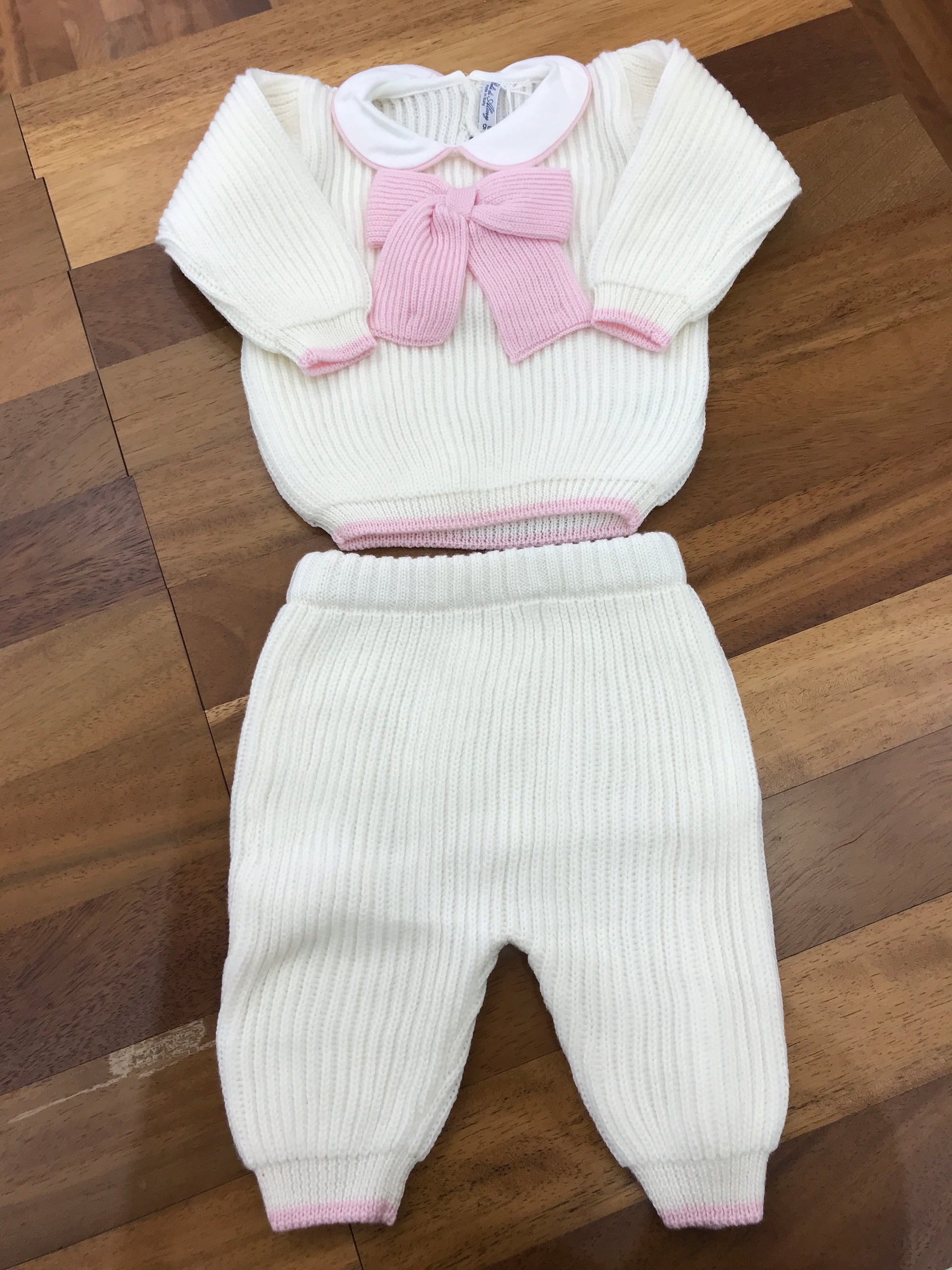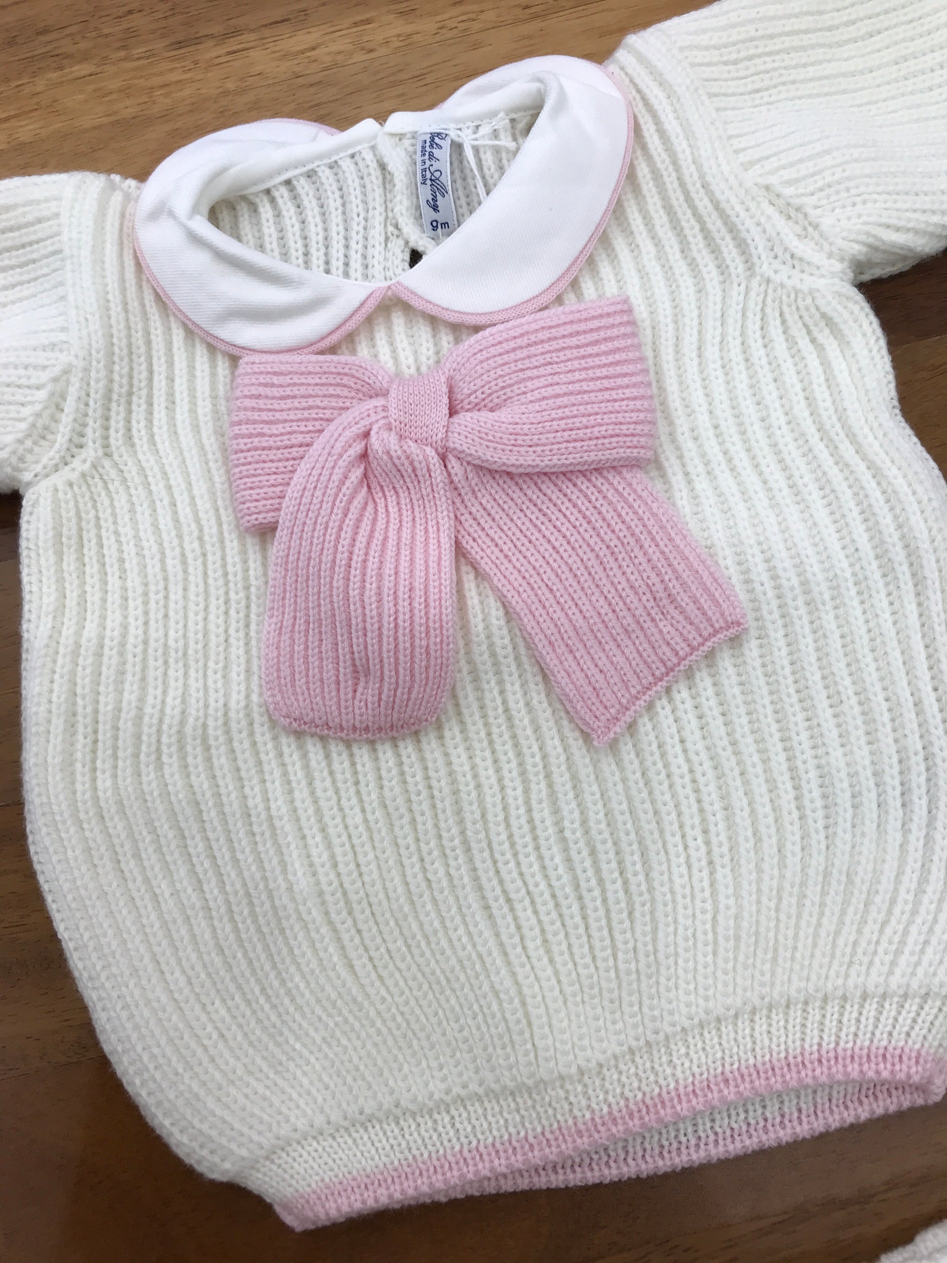 Set due pezzi in lana a costine per bebè, con un grande fiocco rosa centrale, colletto bianco, dettagli sulle maniche, rifinitura a piede e bordo maglia con linea rosa ricamata.