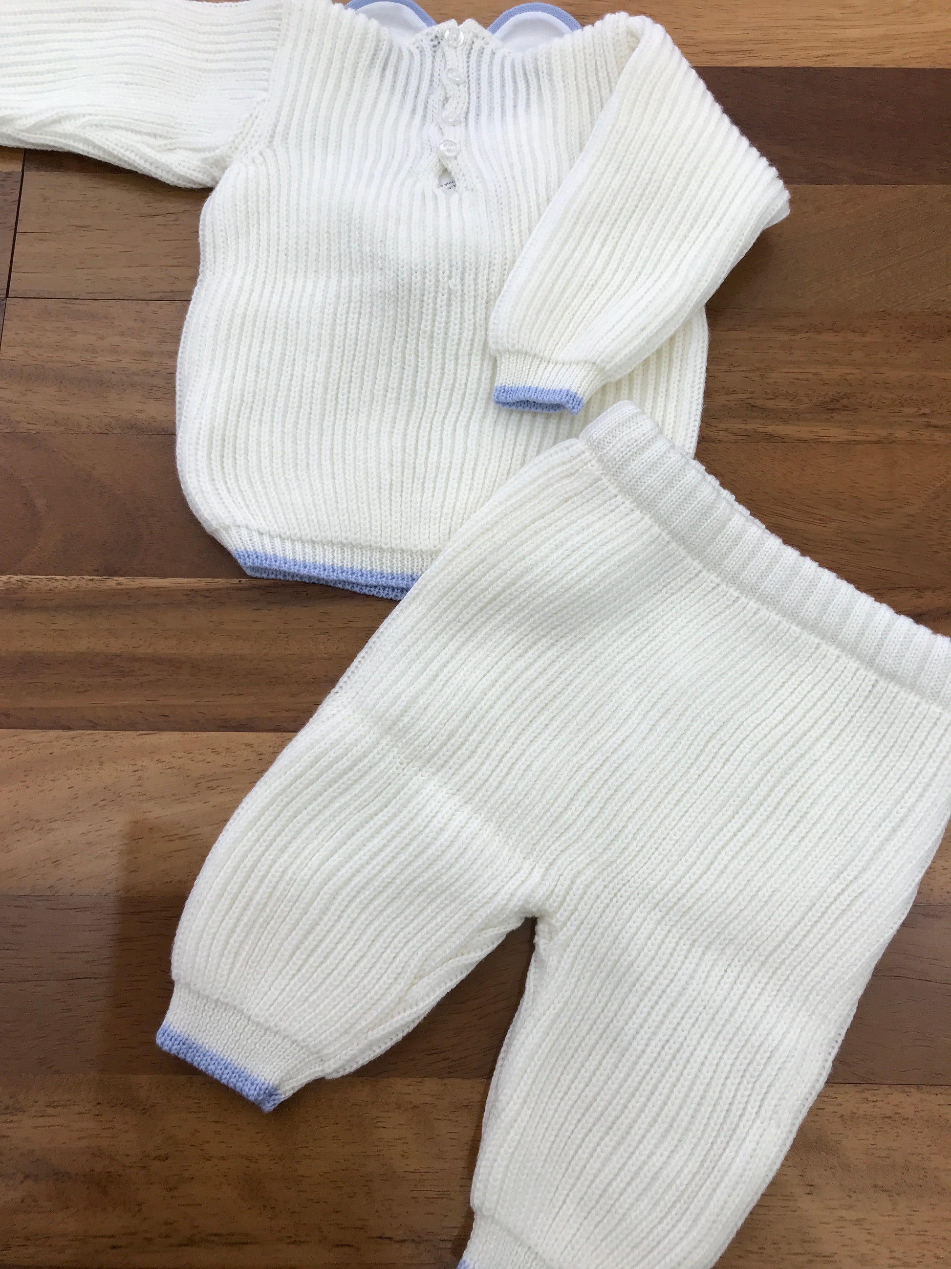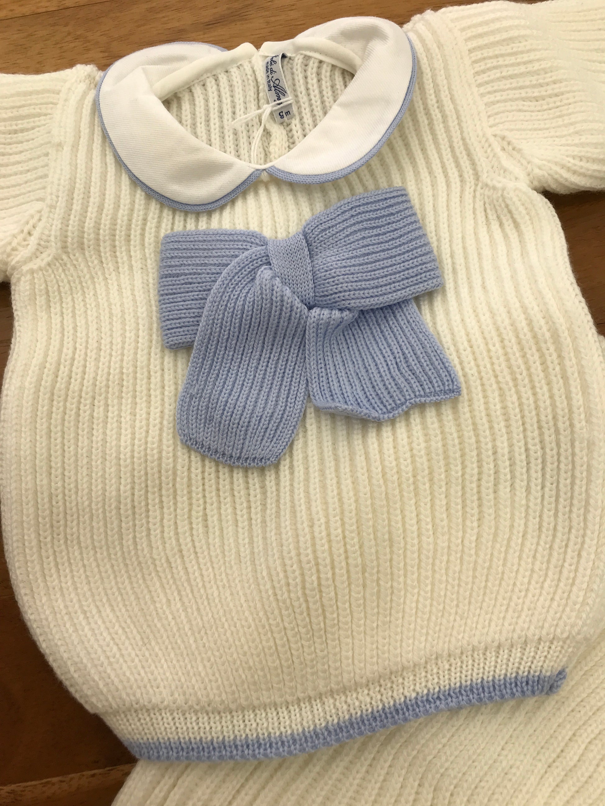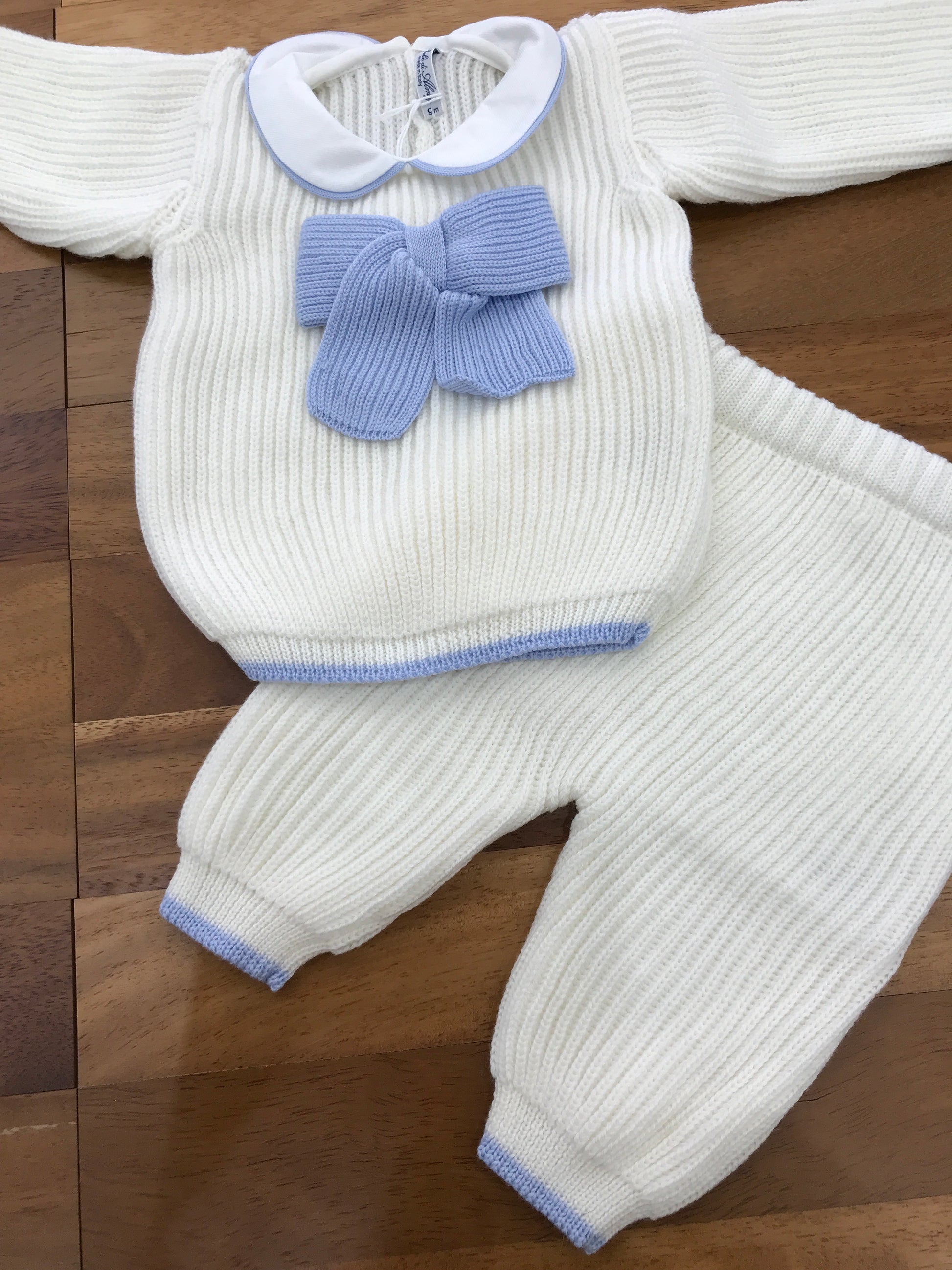 Set due pezzi in lana a costine per bebè, con un grande fiocco rosa centrale, colletto bianco, dettagli sulle maniche, rifinitura a piede e bordo maglia con linea rosa ricamata.