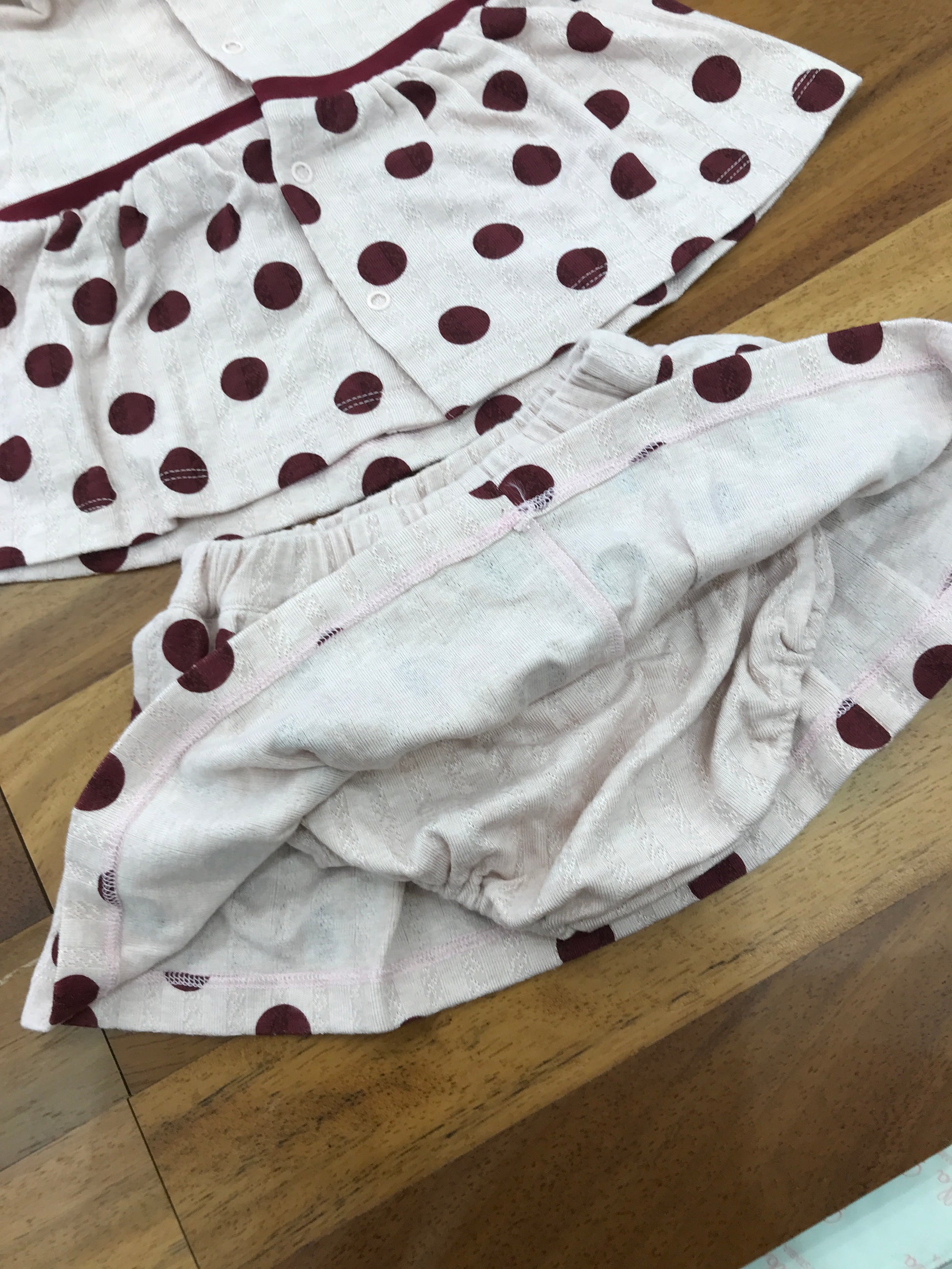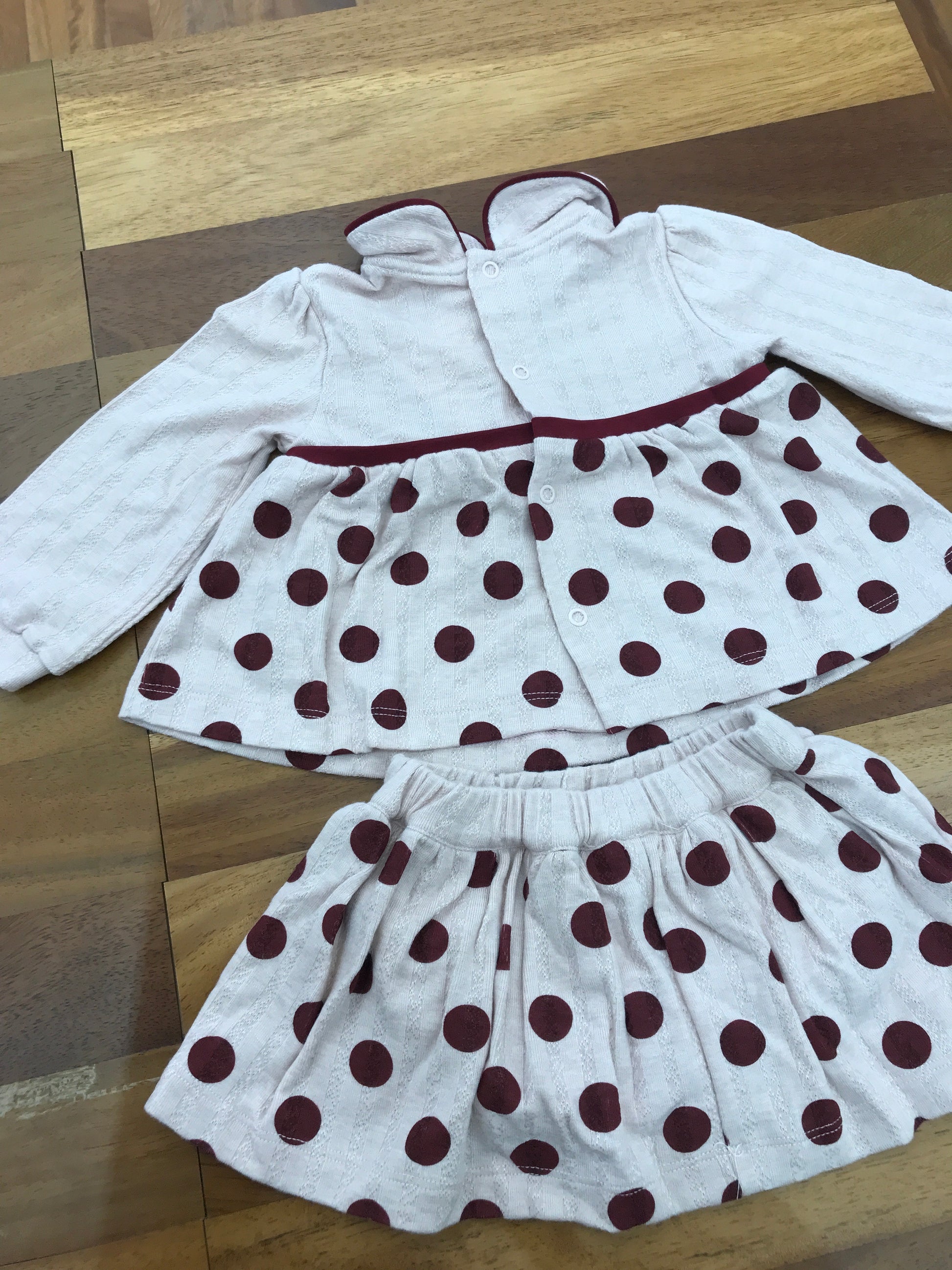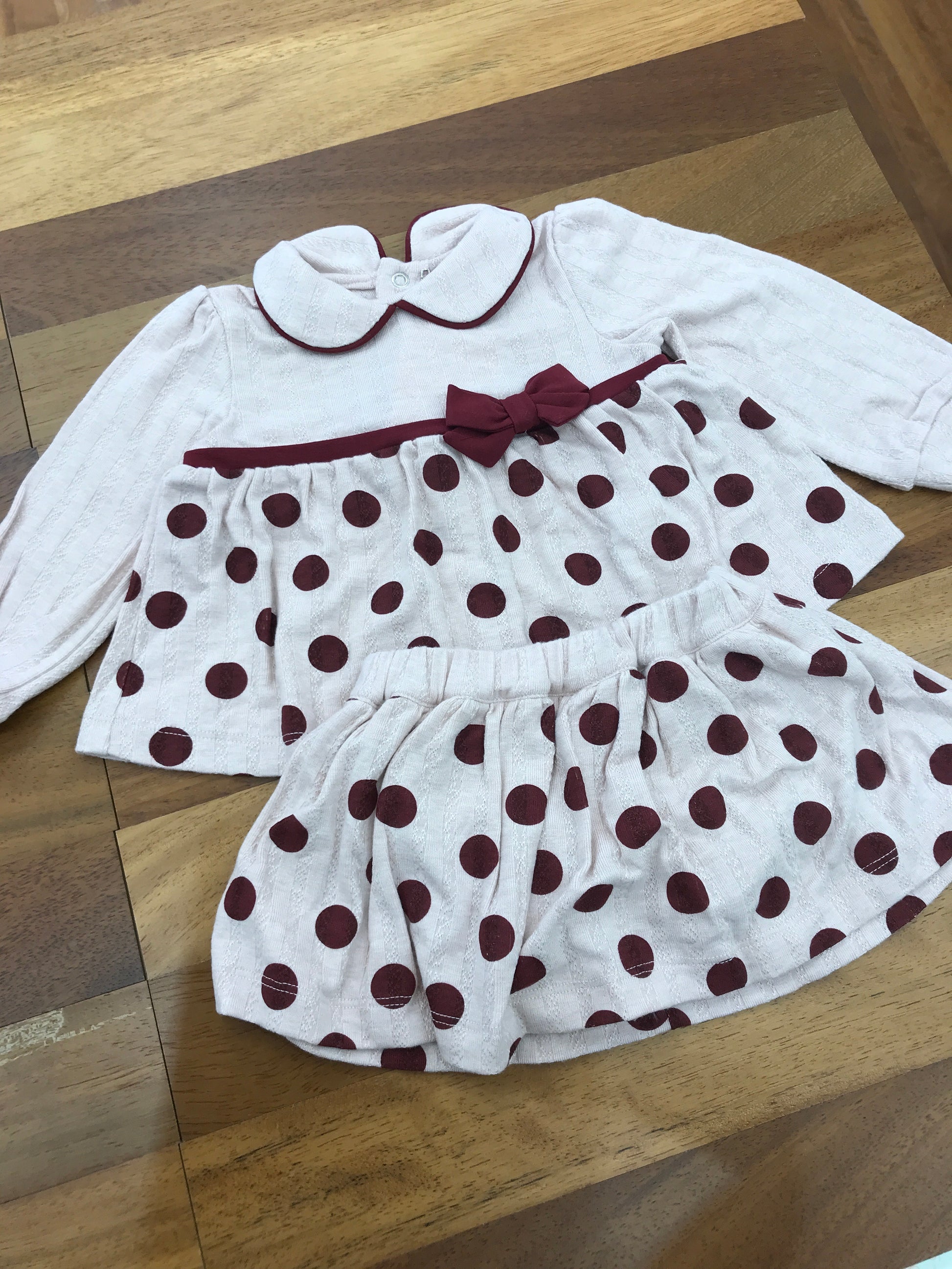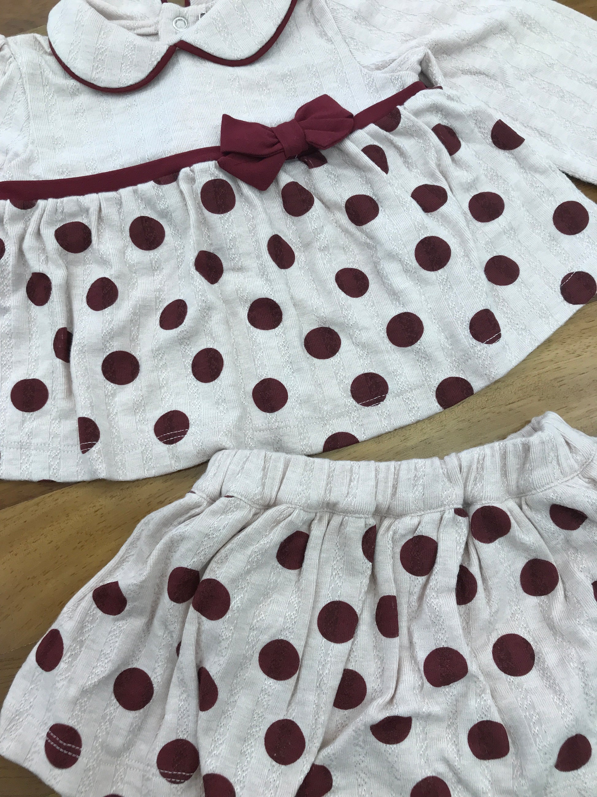 Il completino è composto da una gonnellina con una coulotte nascosta a pois bordeaux, mentre il top, anch’esso a pois, è arricchito da un fiocchetto bordeaux e da diversi ricami che si ritrovano sia sulla gonnellina sia sul sopra.