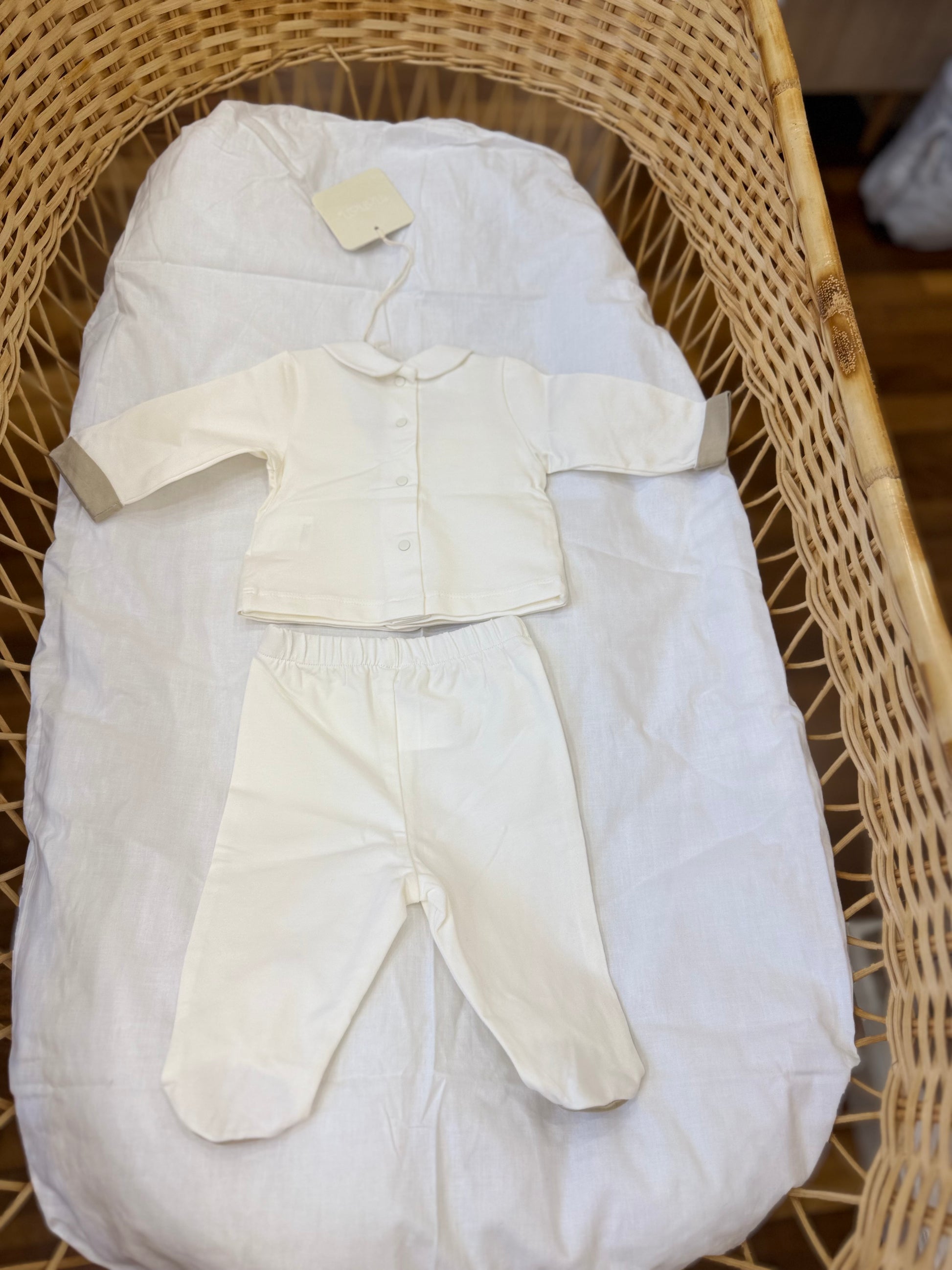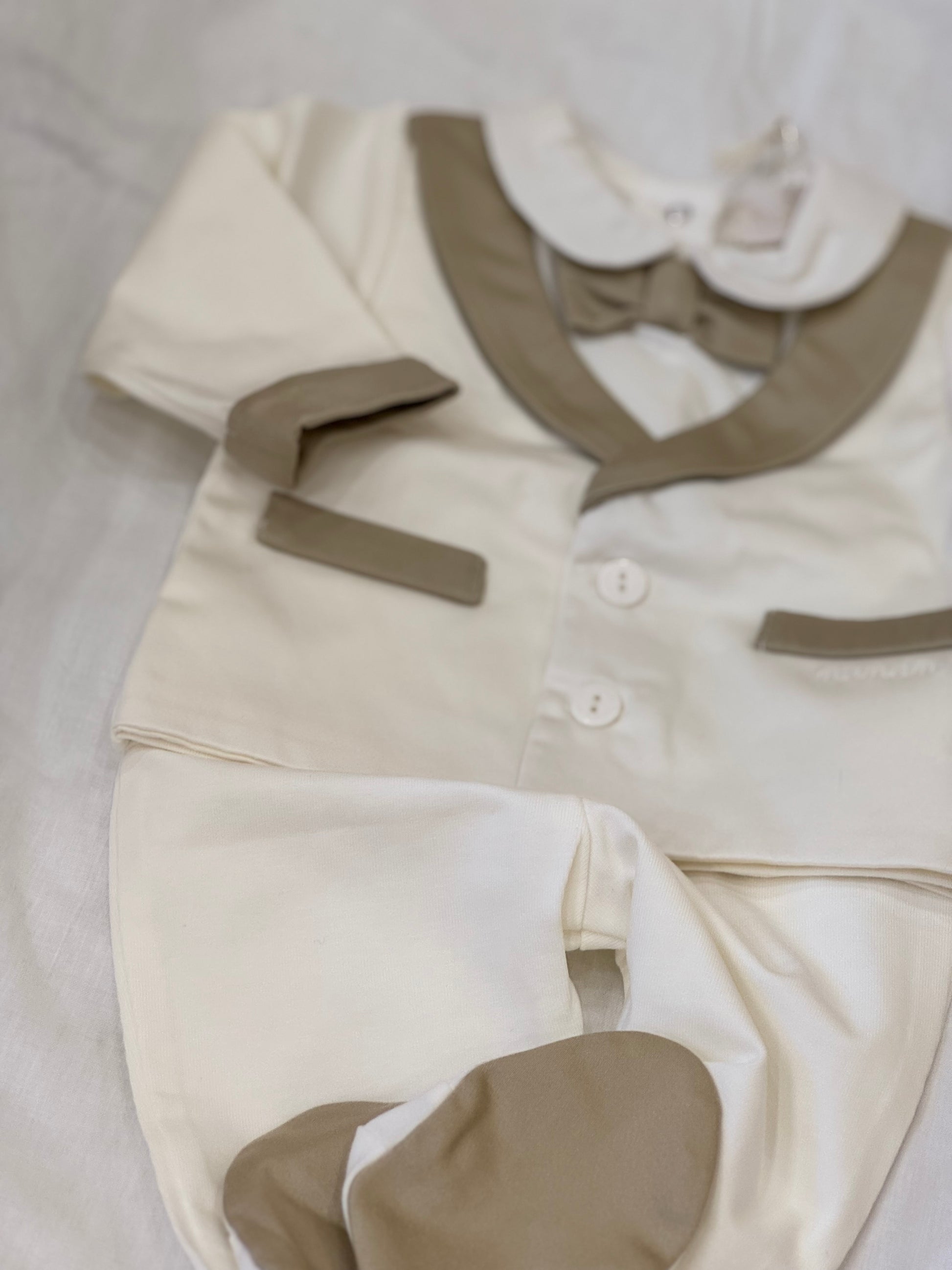 Questo completino Nanan è perfetto per le mamme che vogliono uno stile originale per i loro bambini sin dai primi giorni. Il pantalone con piedini e la maglia seguono lo stile di uno smoking, con e dettagli in beige rendendo il vostro bambino elegante e confortevole.