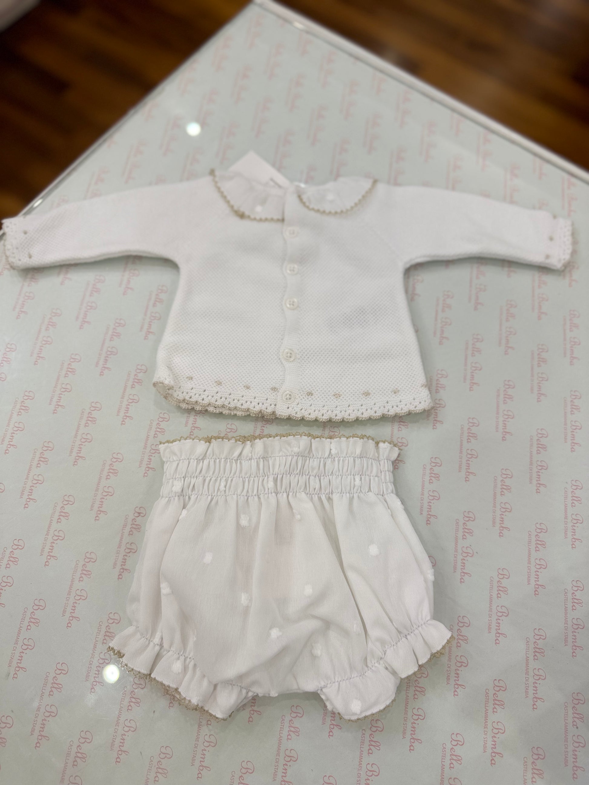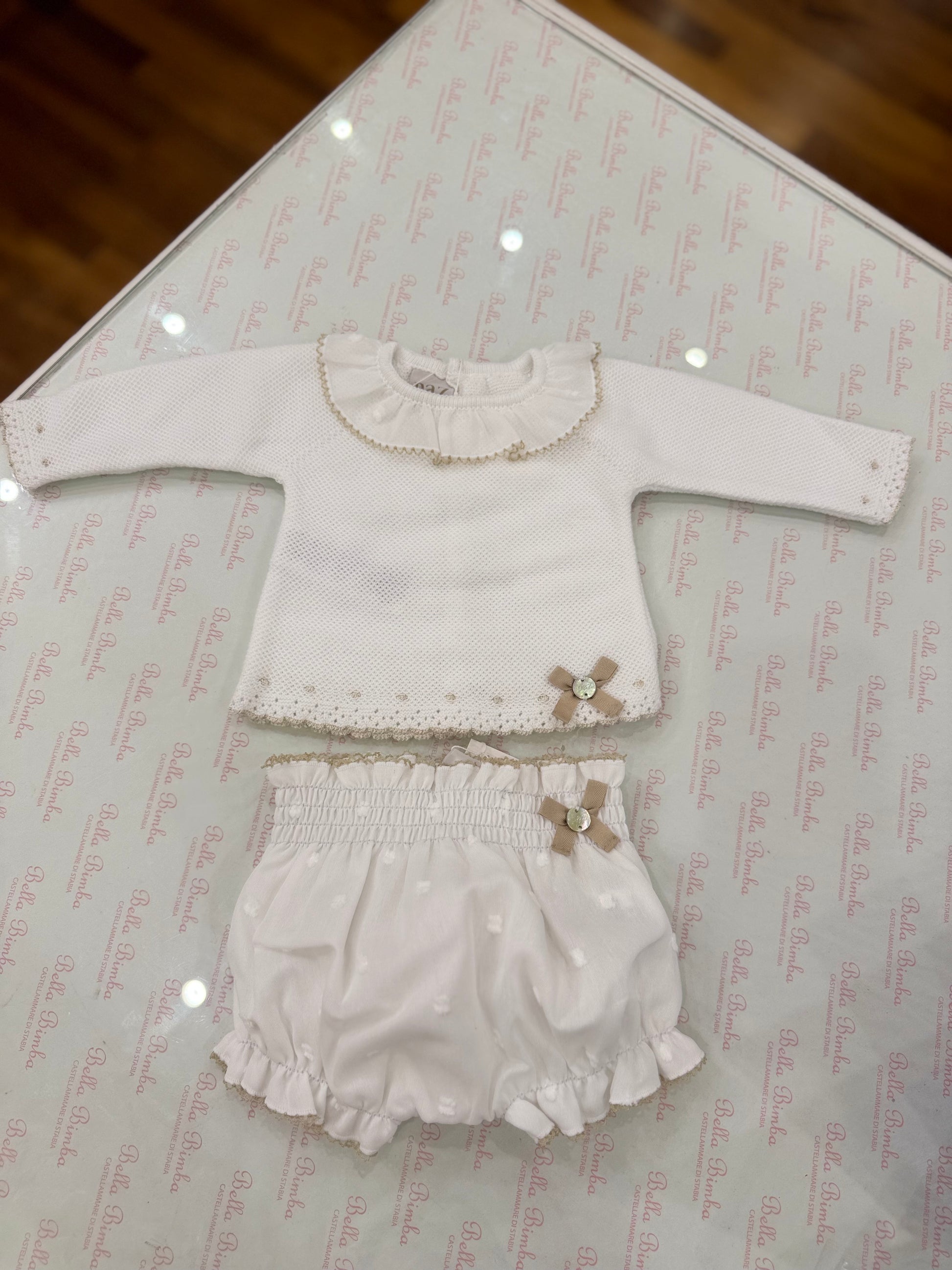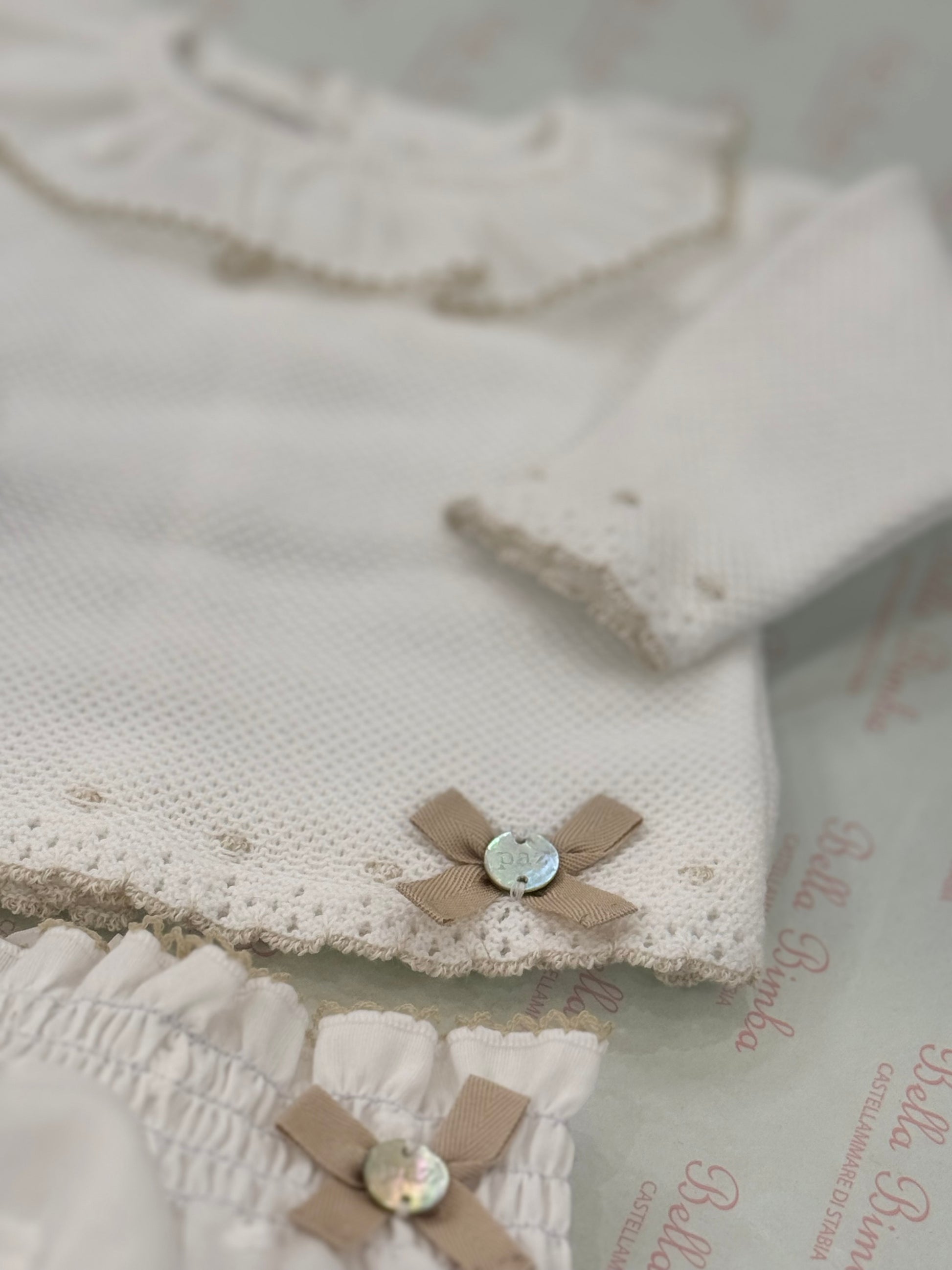Questo delizioso completino Paz Rodriguez è realizzato in filo e cotone, con dettagli color tortora che lo rendono ancora più raffinato. Ideale per le giornate più eleganti, garantisce comfort e stile grazie ai materiali di alta qualità utilizzati.