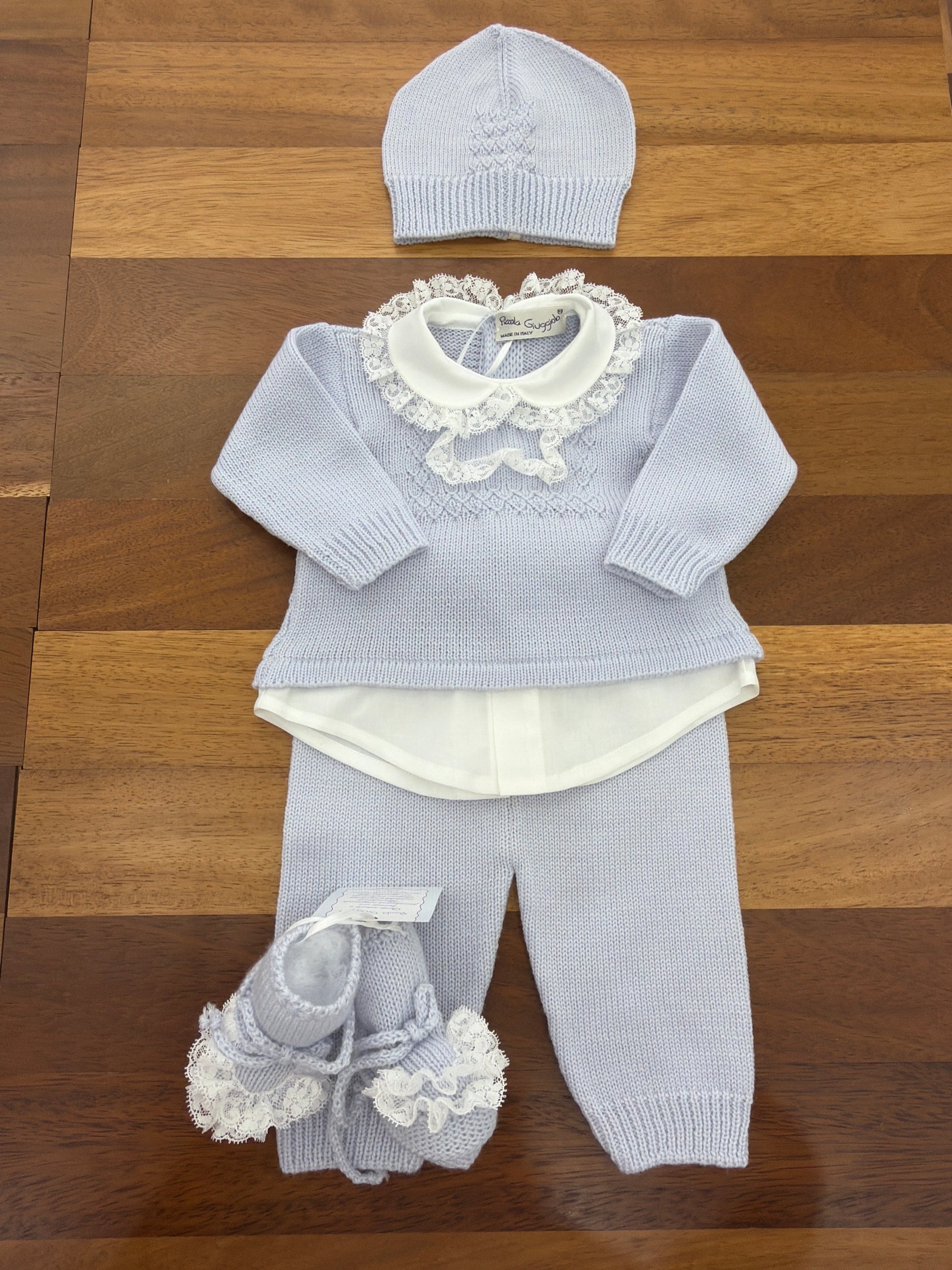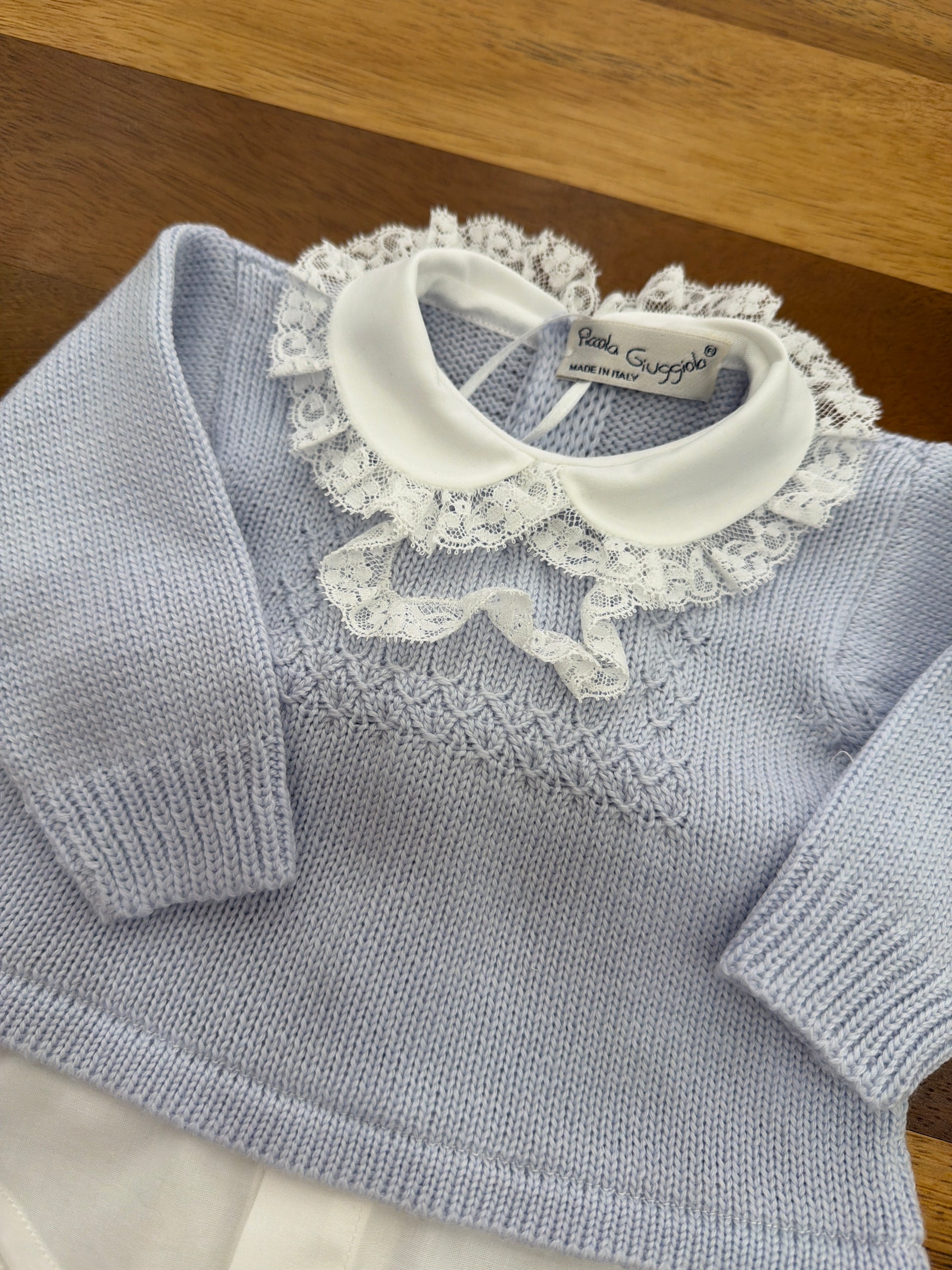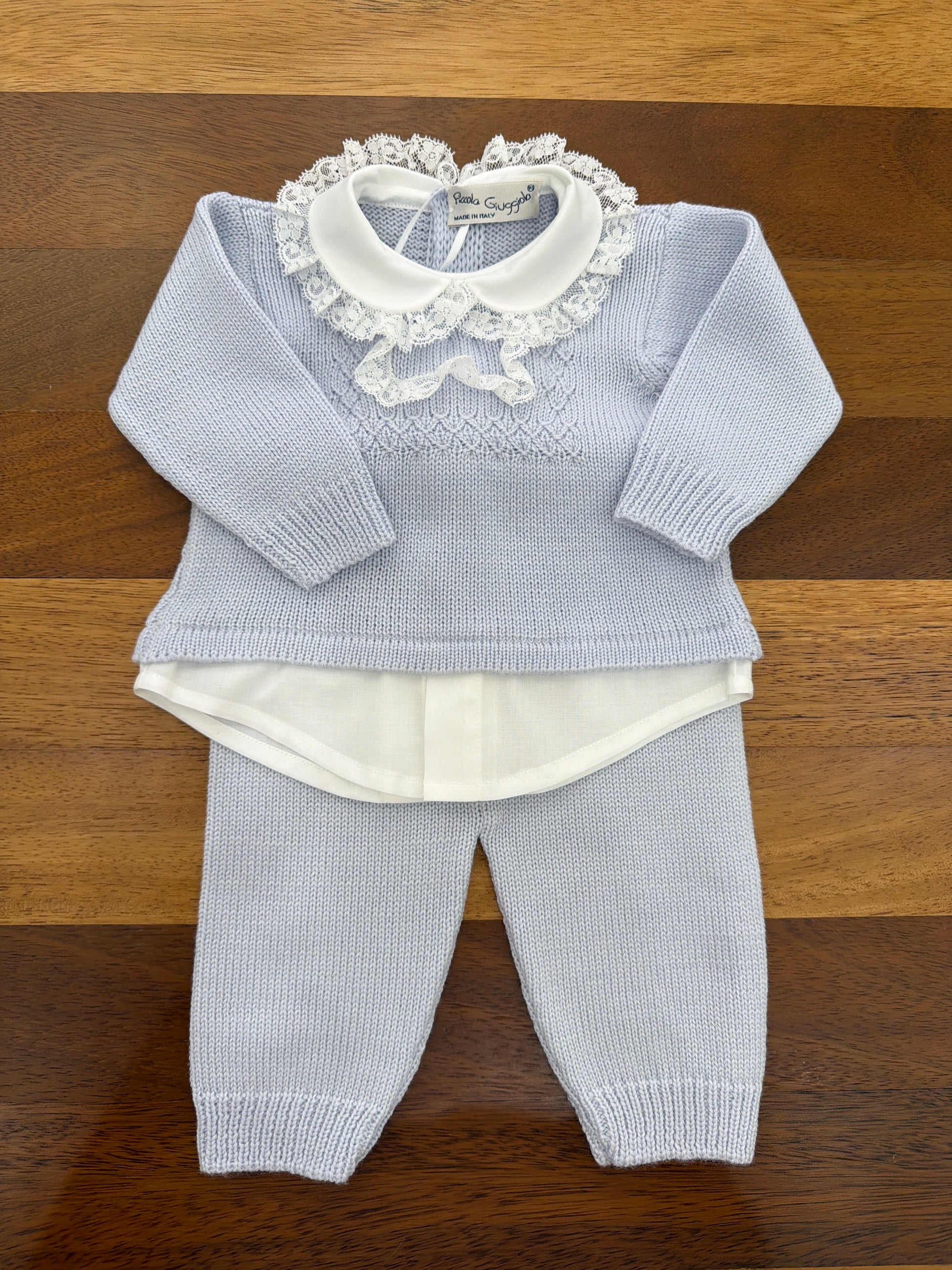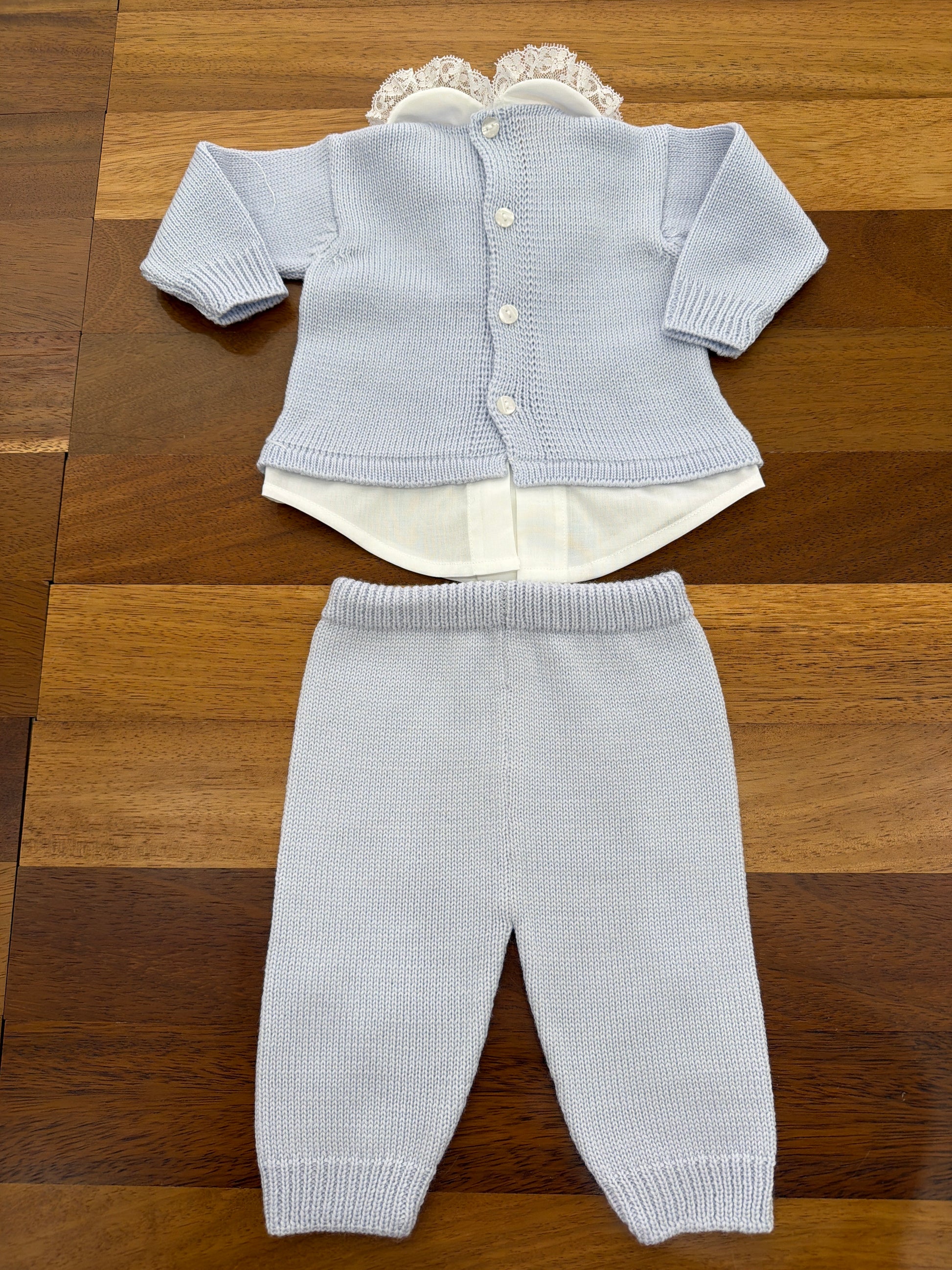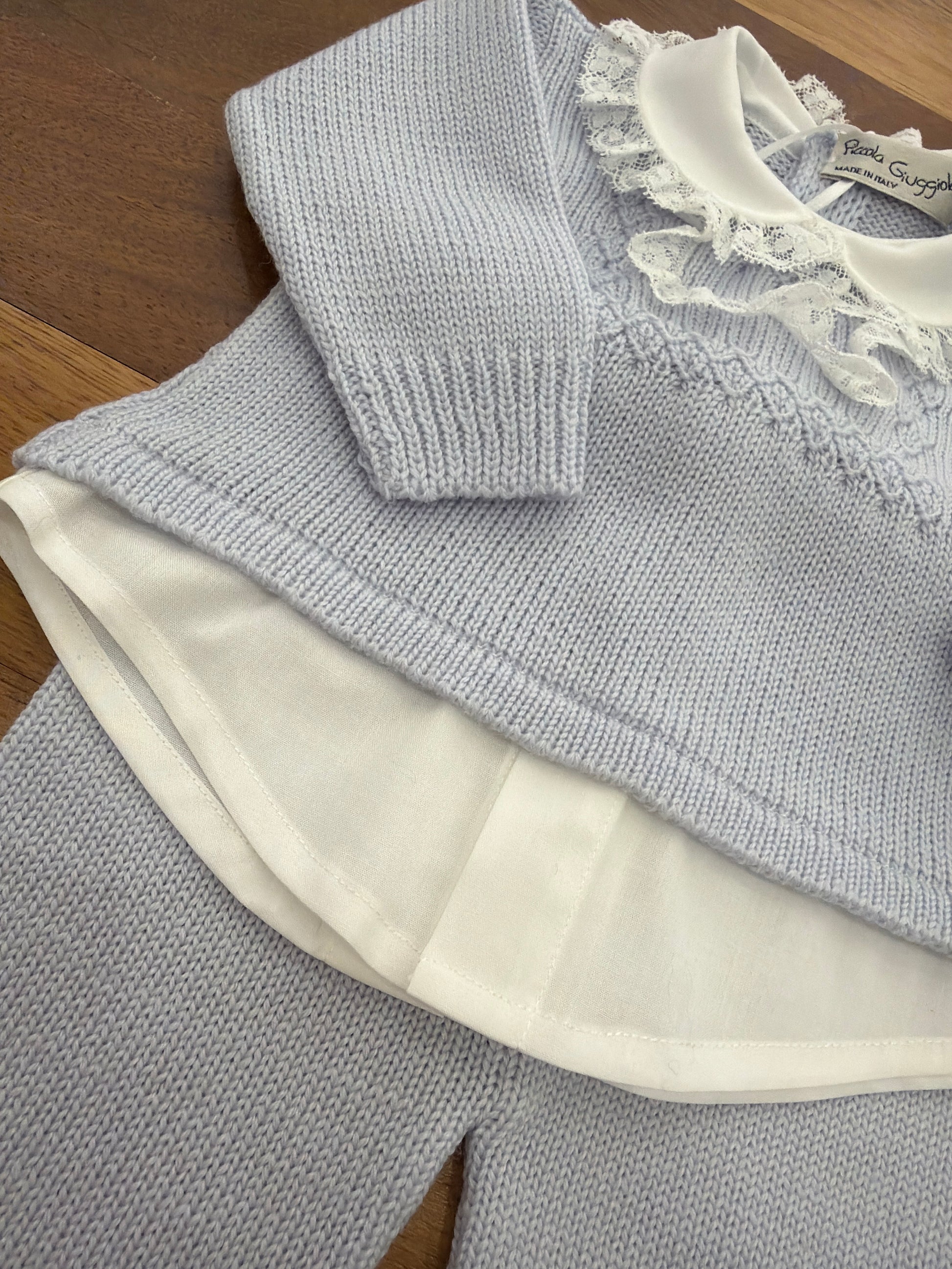 Set coordinato a due pezzi in lana color azzurro cielo, composto da pantaloni con elastico in vita per una vestibilità comoda e confortevole. La parte superiore è caratterizzata da un colletto in pizzo, dettagli artigianali a mano e un delicato inserto in pizzo sul petto. Presenta inoltre una camicia applicata sotto la maglietta, per un look raffinato e curato nei minimi dettagli.