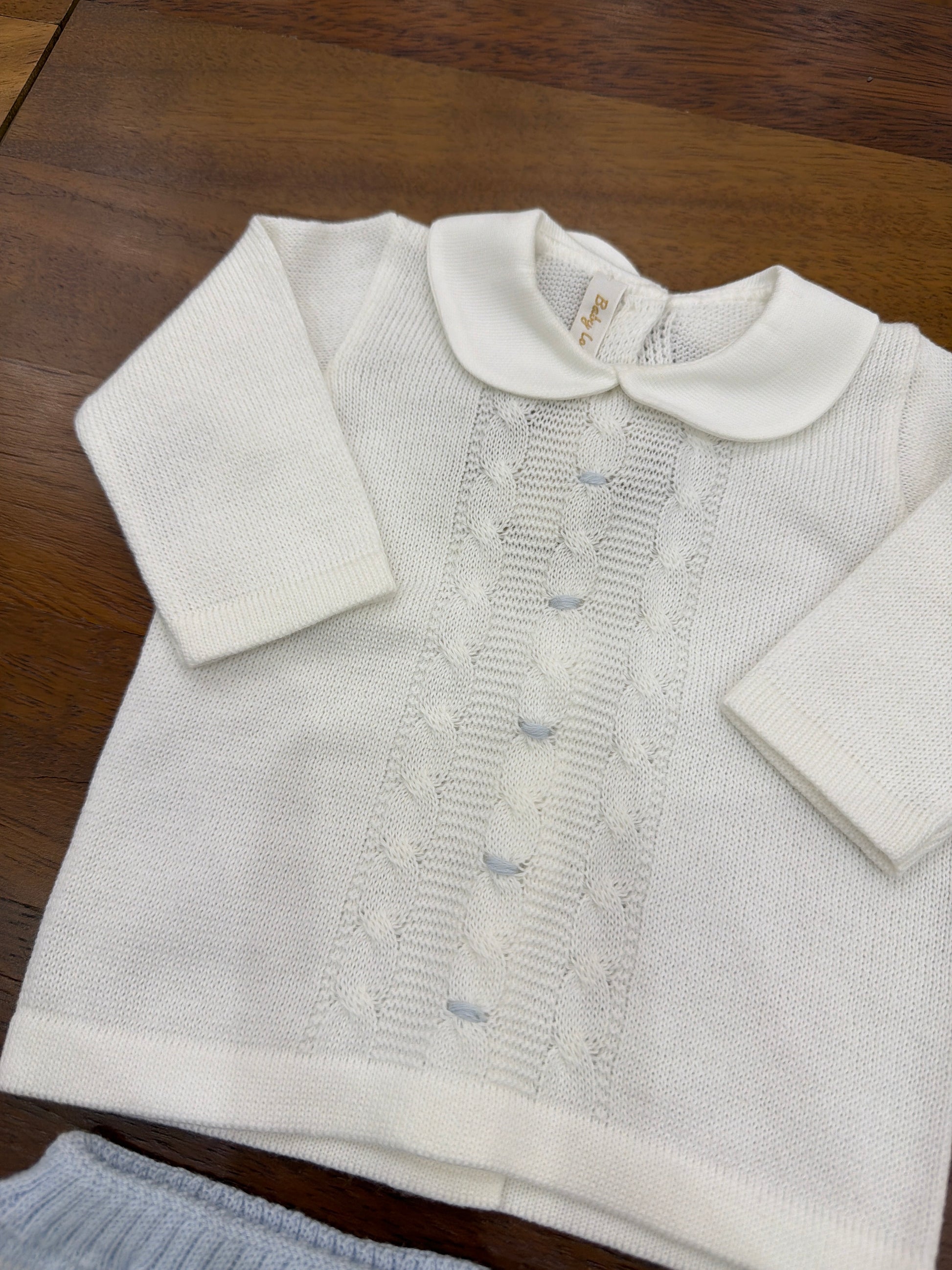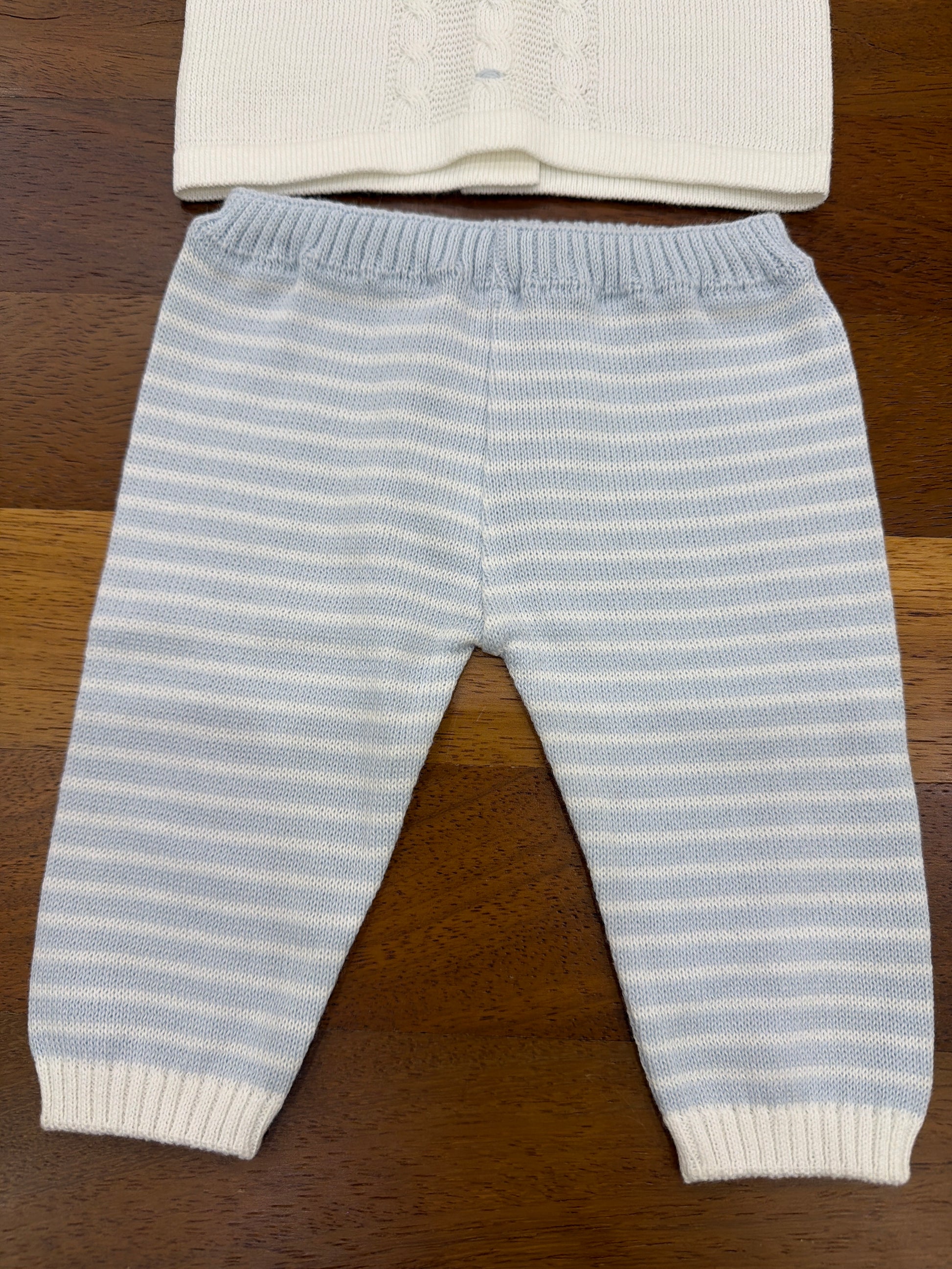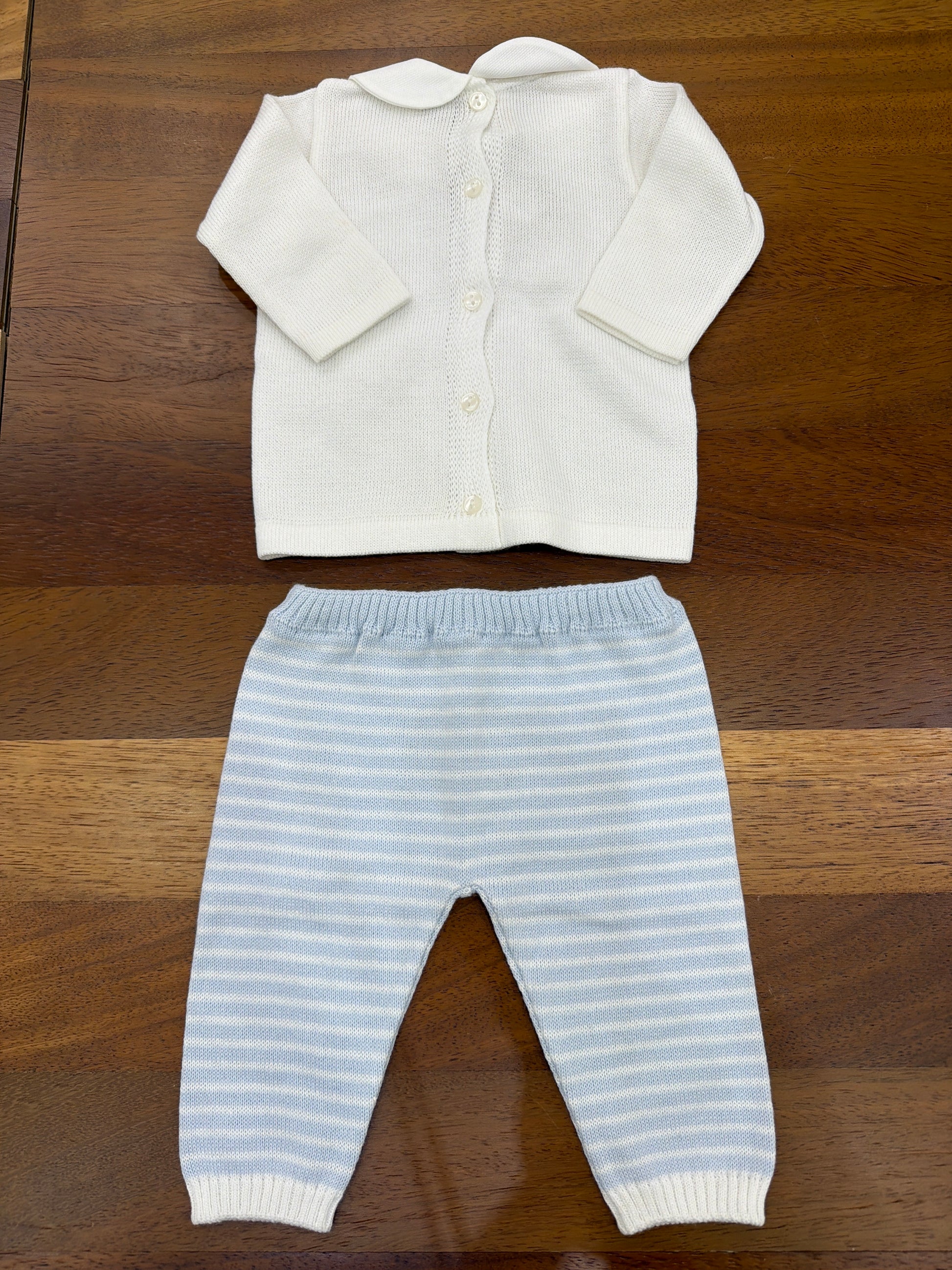 Elegante completo neonato composto da due capi coordinati: pantaloni in cotone a righe bianche e celeste abbinati a una maglia in bianco con lavorazione raffinata. Un insieme sofisticato e versatile, perfetto per occasioni speciali o per l'uso quotidiano, che garantisce comfort e stile al vostro piccolo.