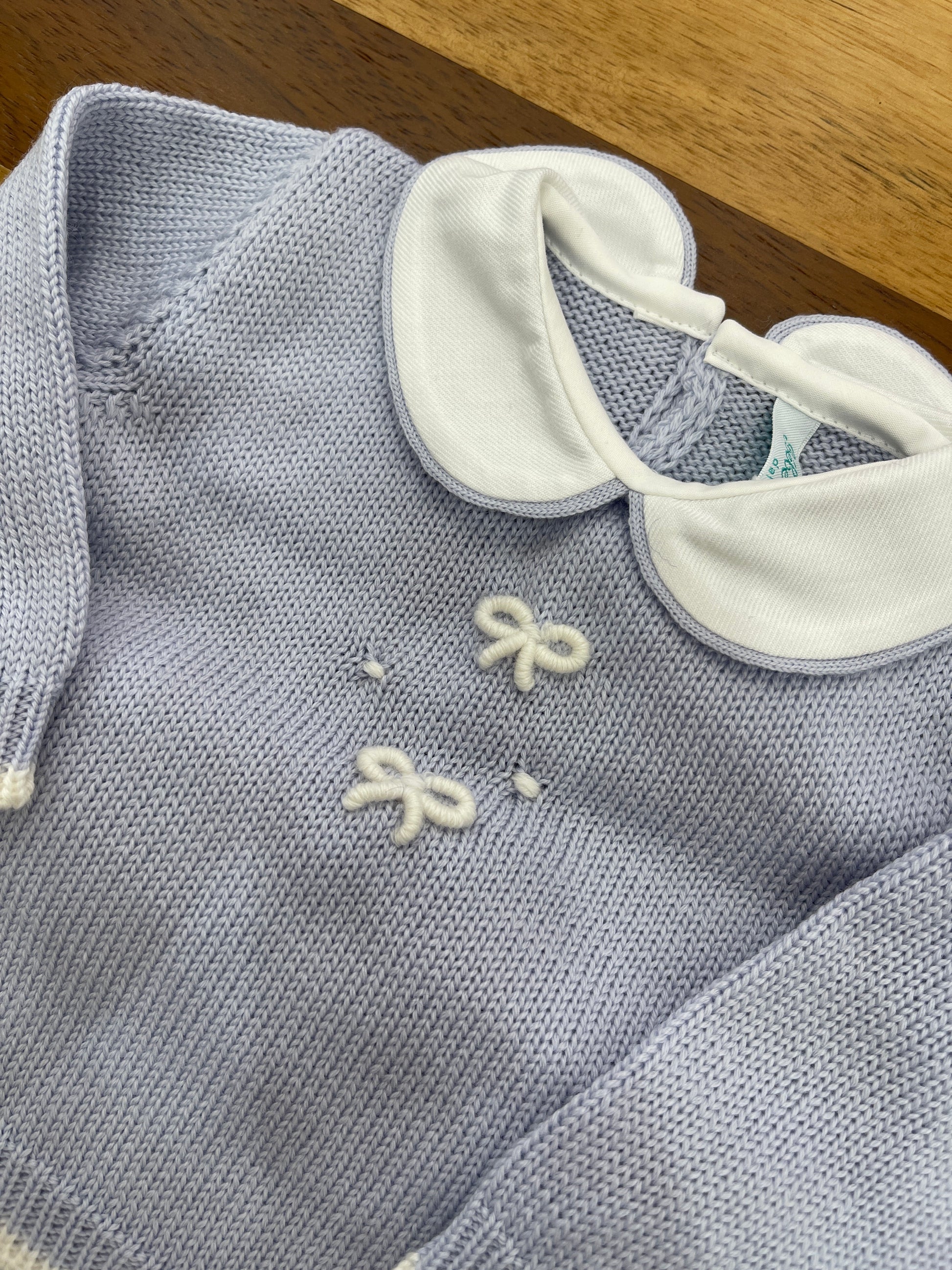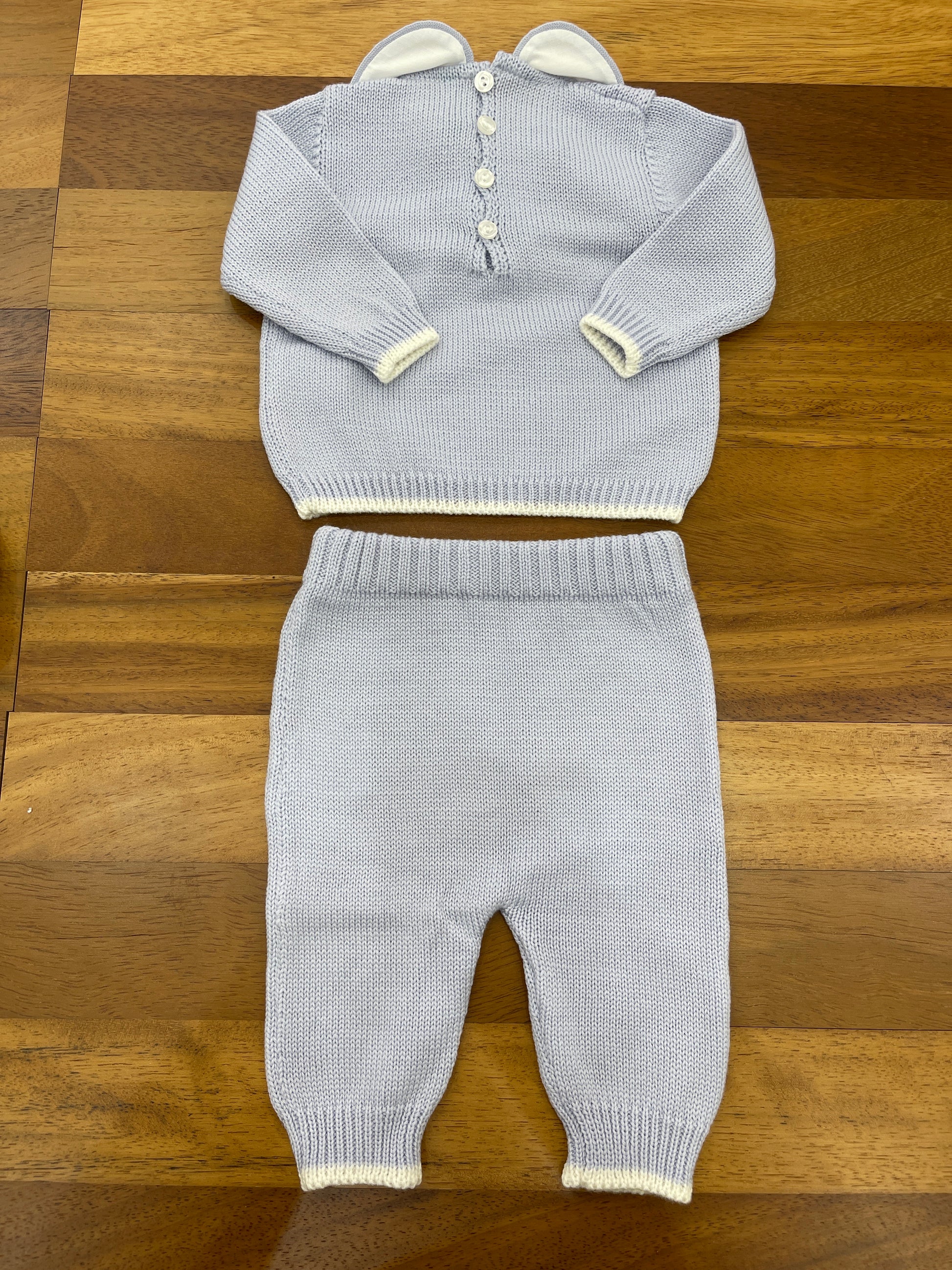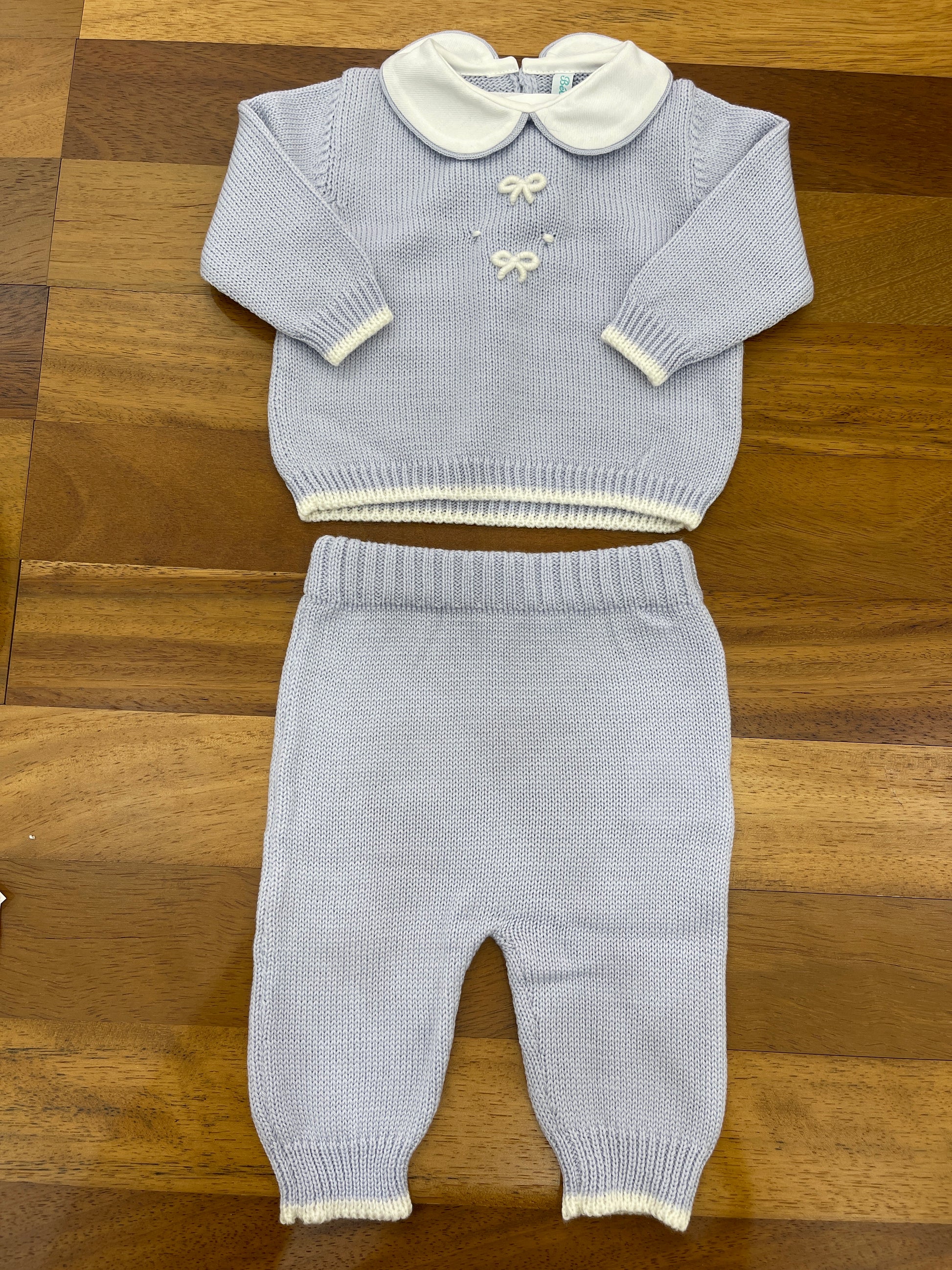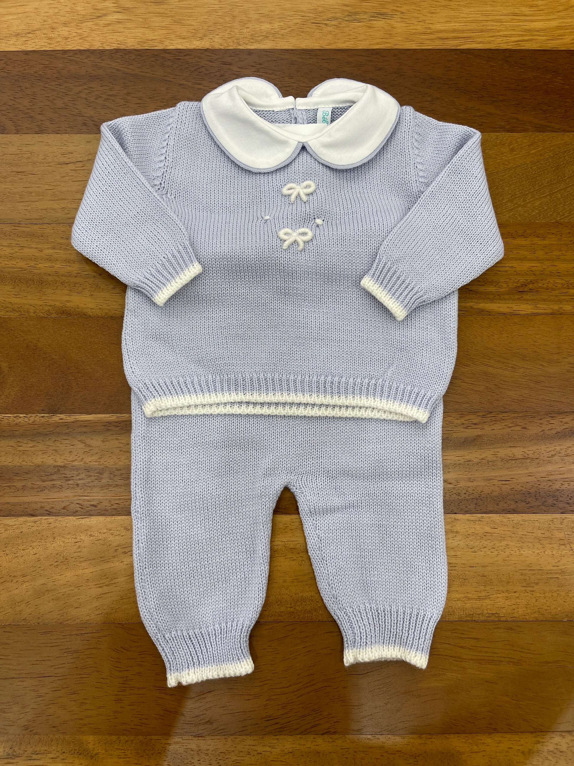 Completo in lana a due pezzi, dotato di collo tondo e arricchito da un ricamo a rilievo con motivi a fiocco sul petto.