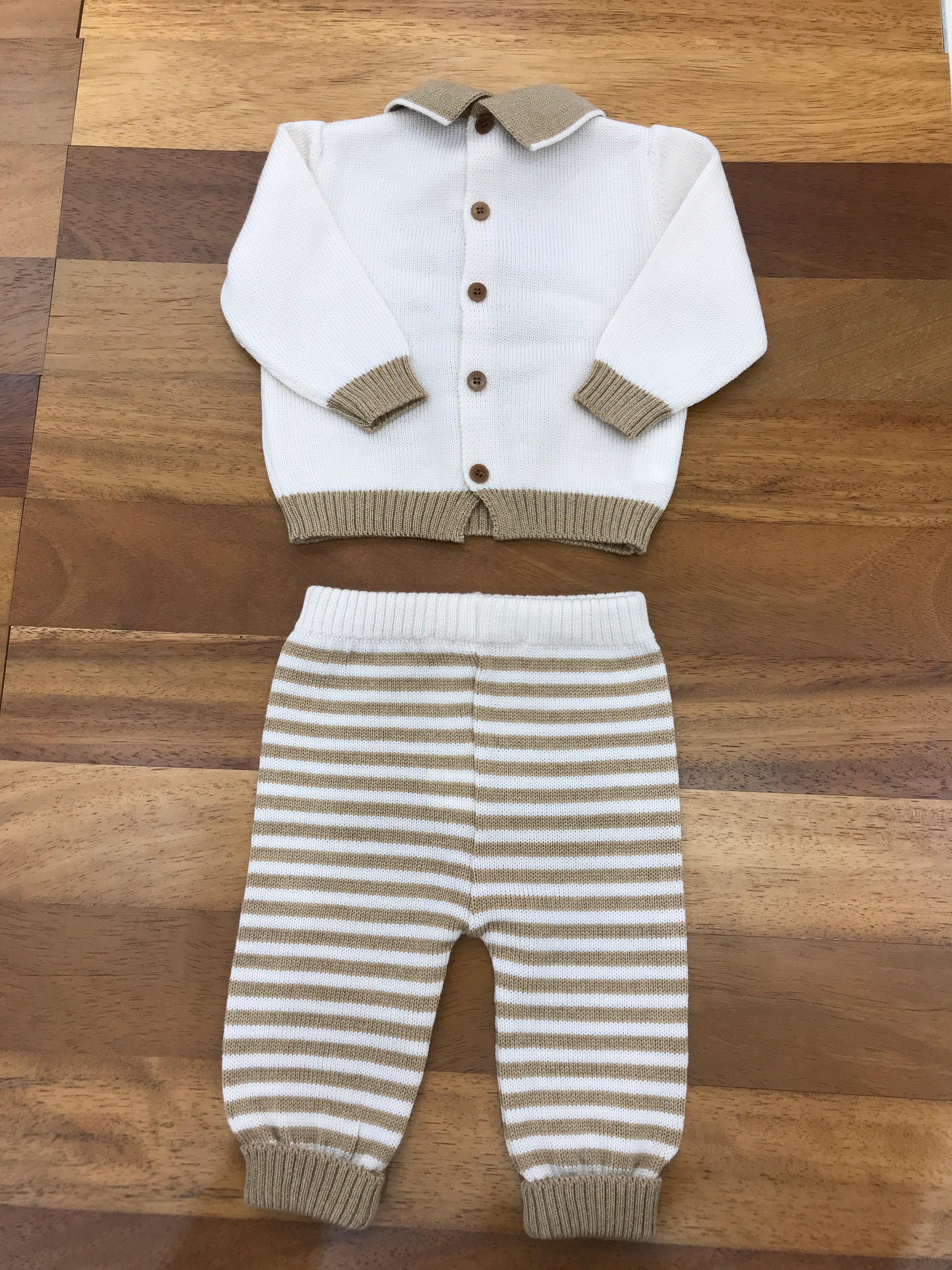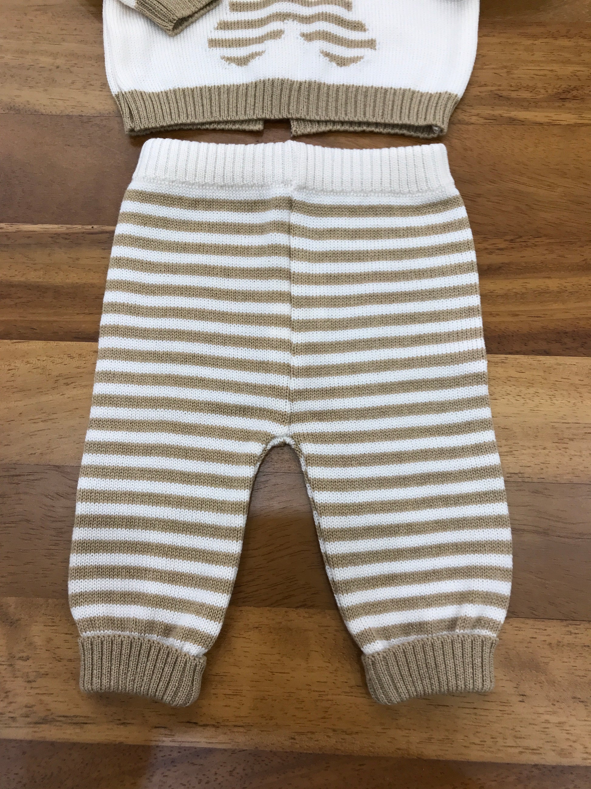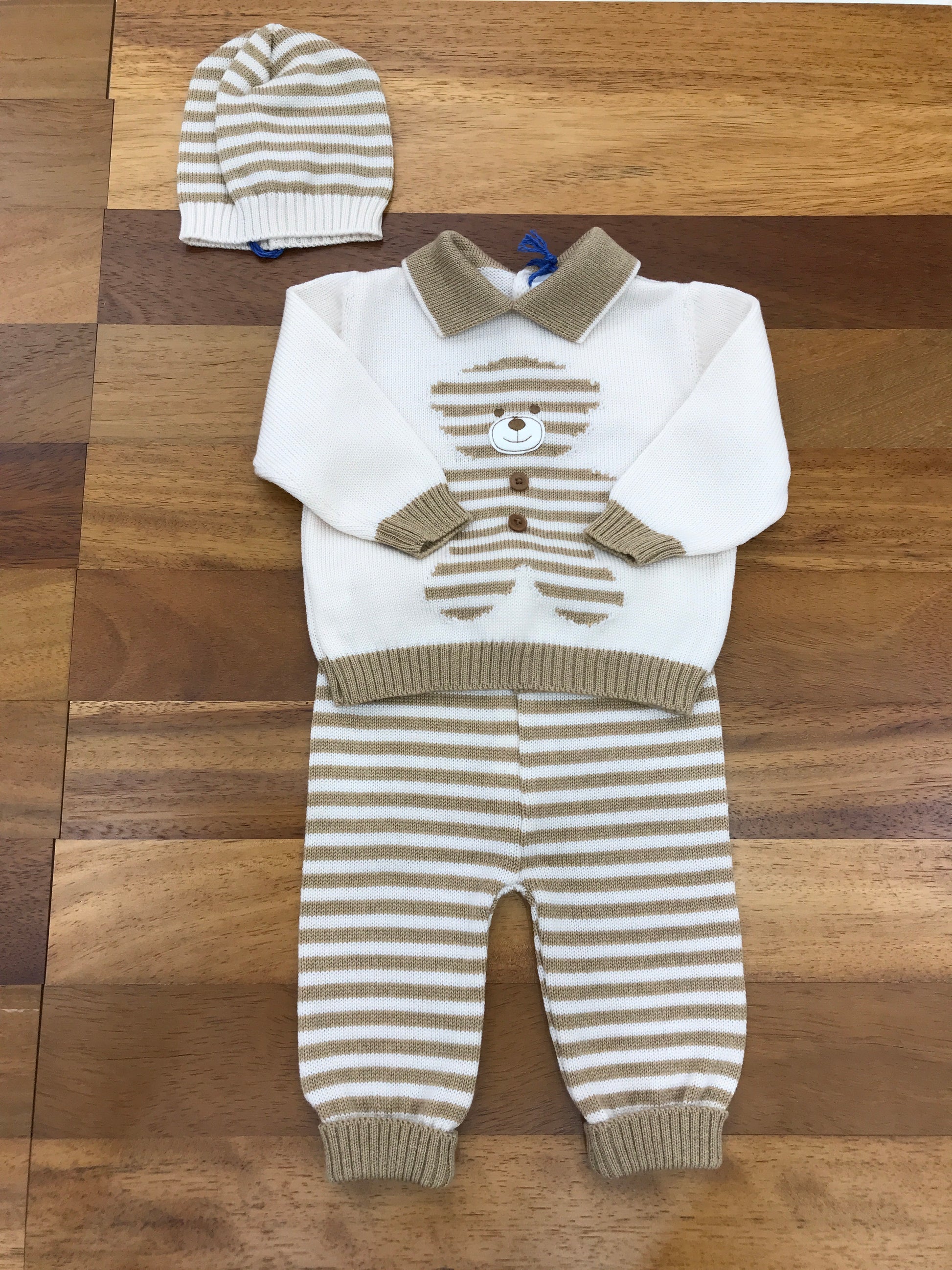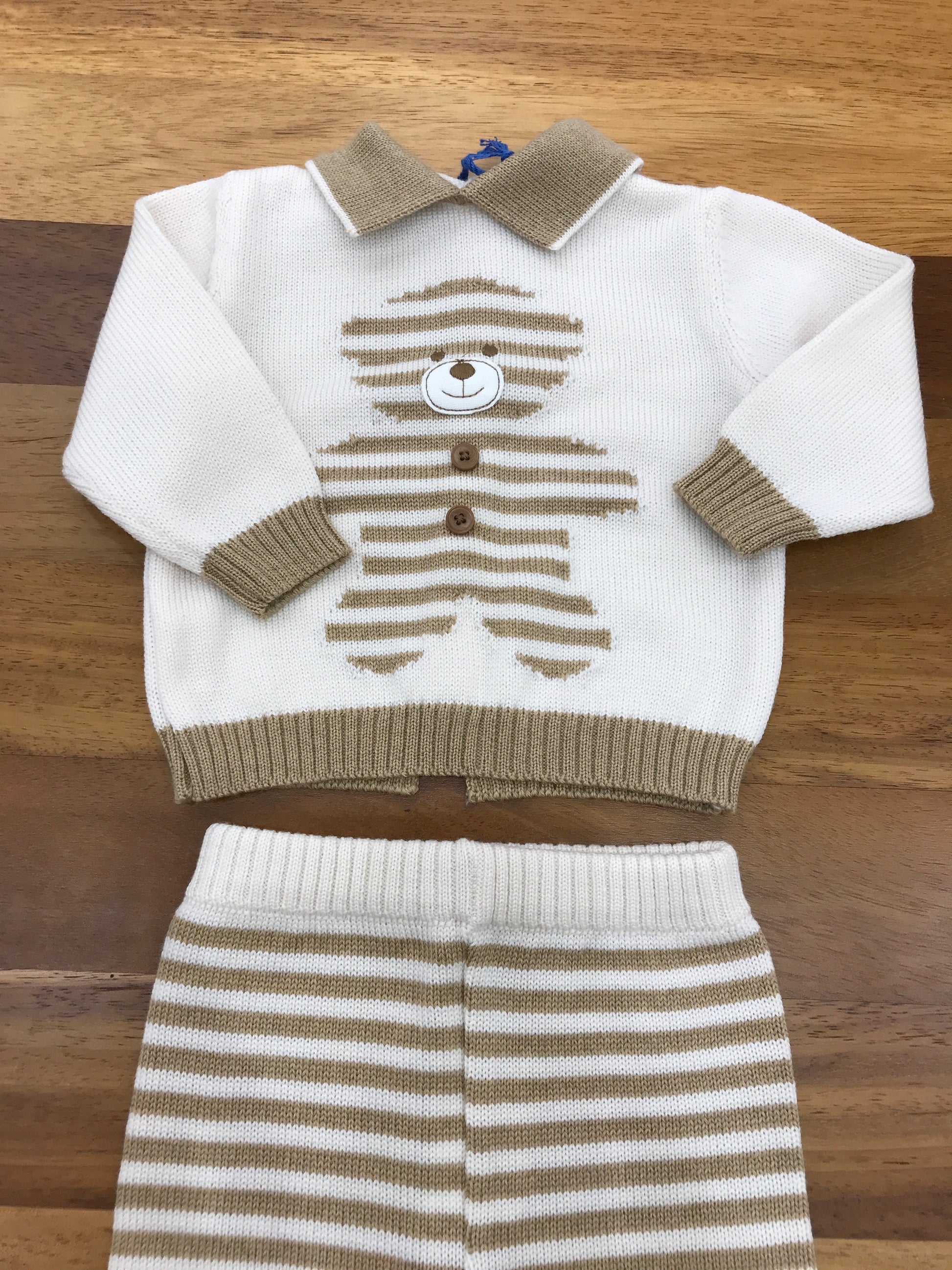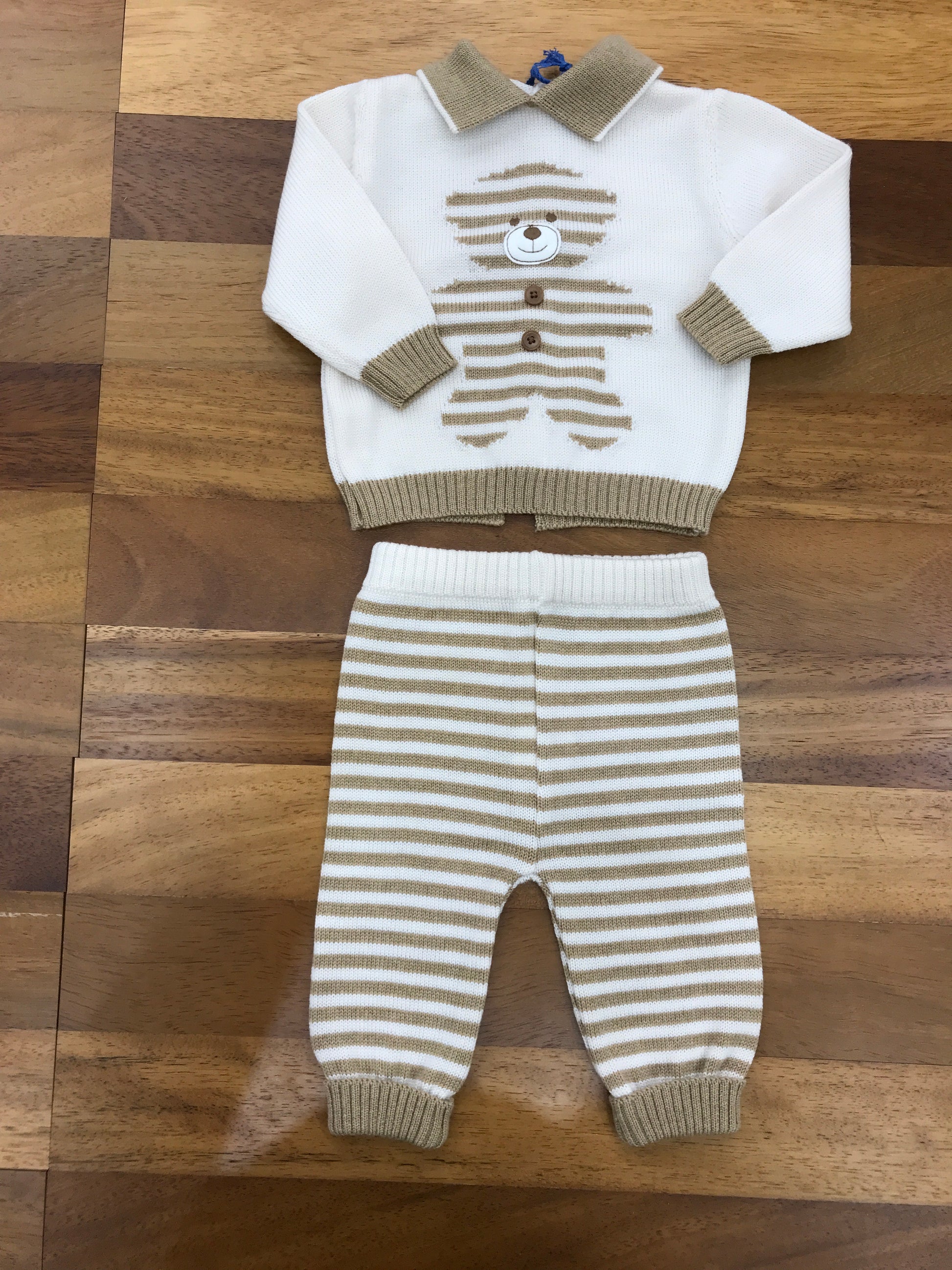Completo in lana composto da due pezzi: maglietta con collo a camicia decorata da un orsetto a righe bicolore, motivo che si estende uniformemente su tutto il pantalone.