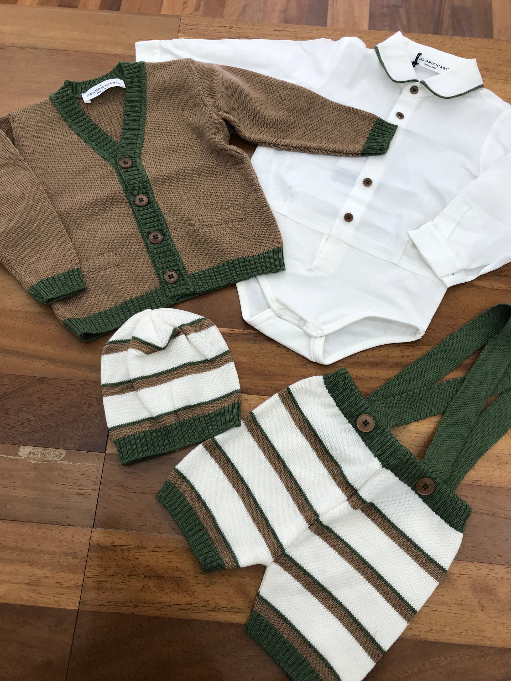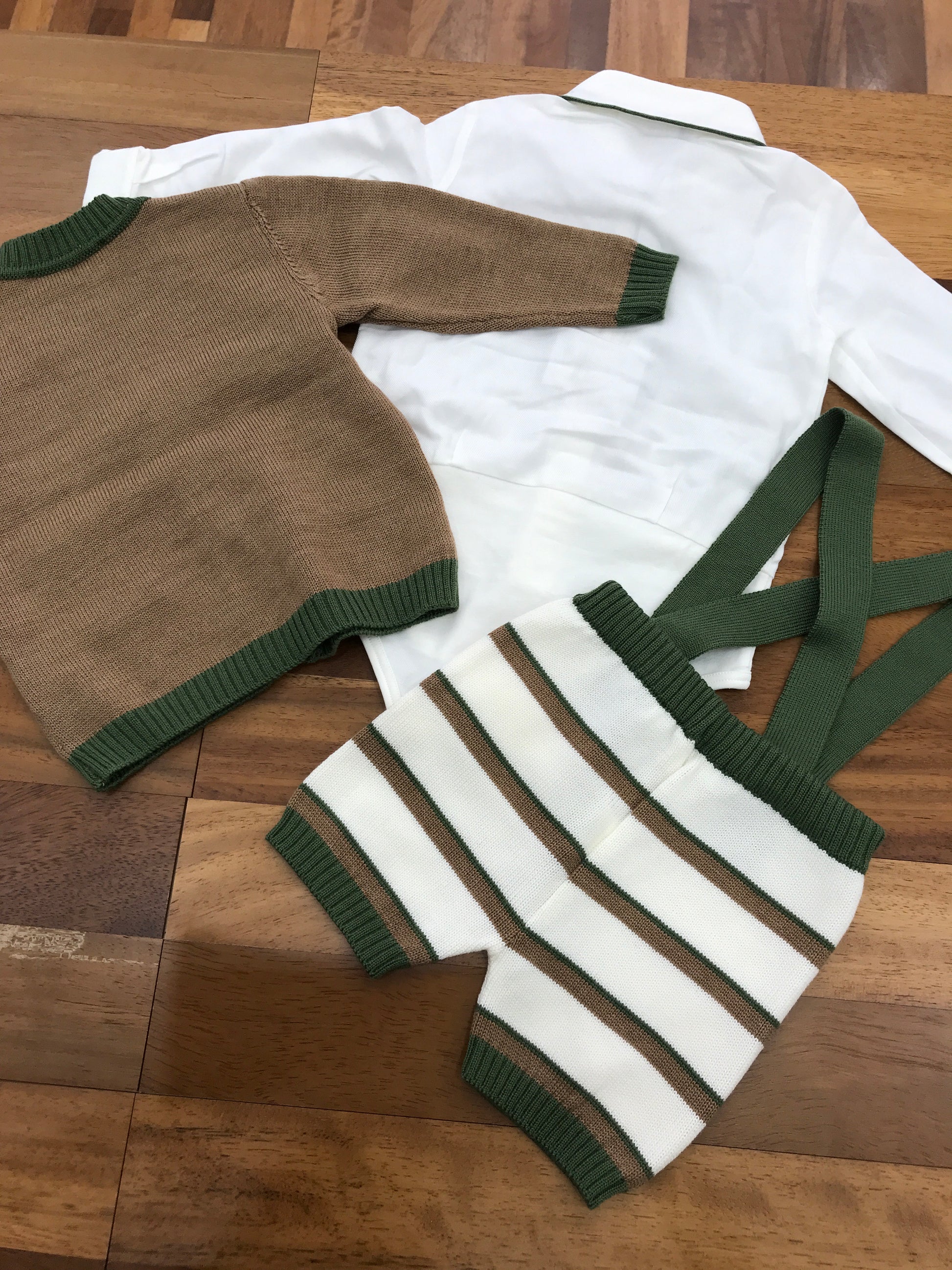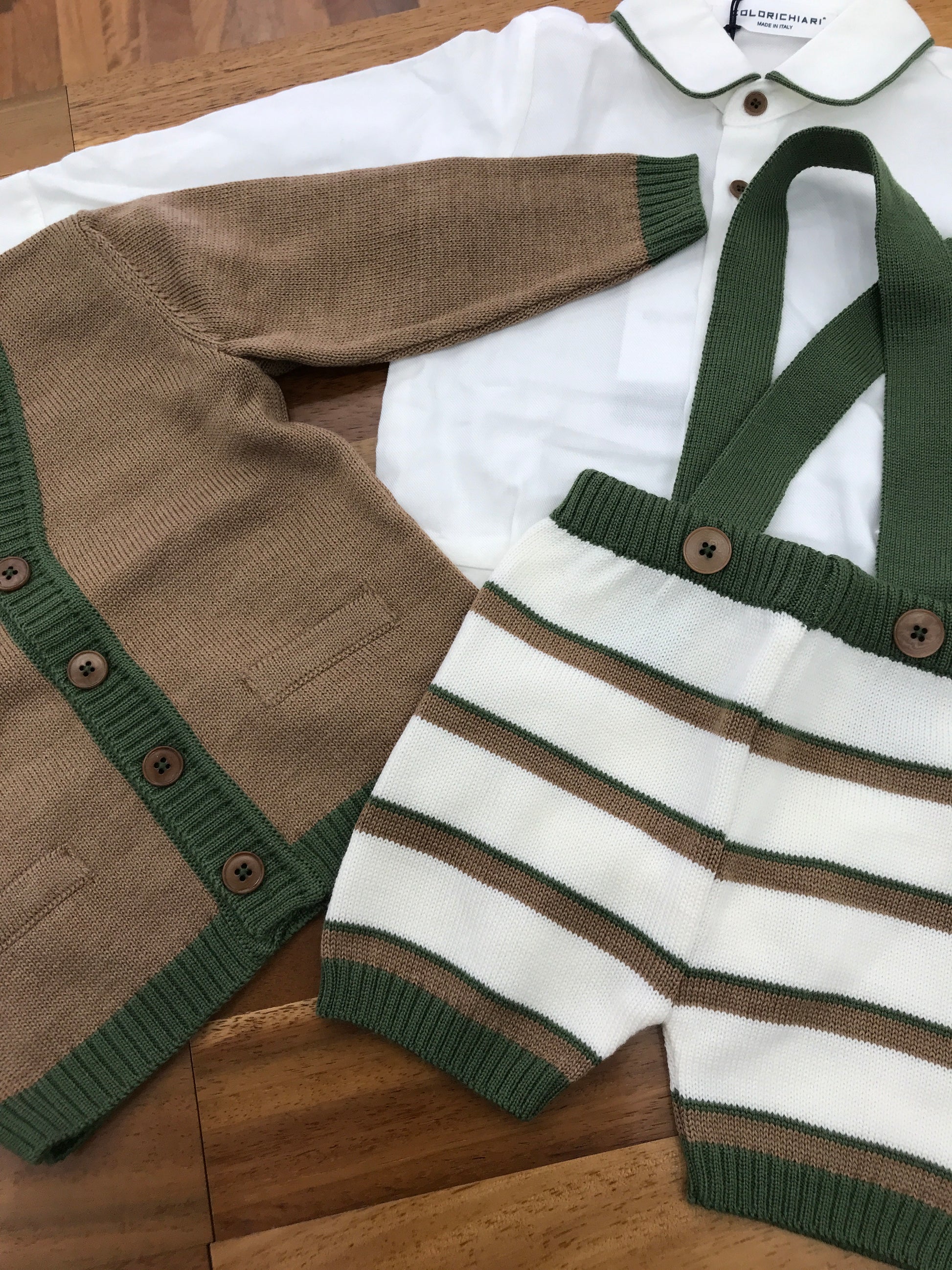 Questo completo a tre pezzi include un body bianco semplice e versatile, una salopette corta caratterizzata da righe nei colori verde, marrone e bianco, e un cardigan che combina tonalità di marrone e verde. La combinazione di questi capi offre un look coordinato e raffinato, ideale per chi cerca un abbigliamento pratico ma curato nei dettagli.