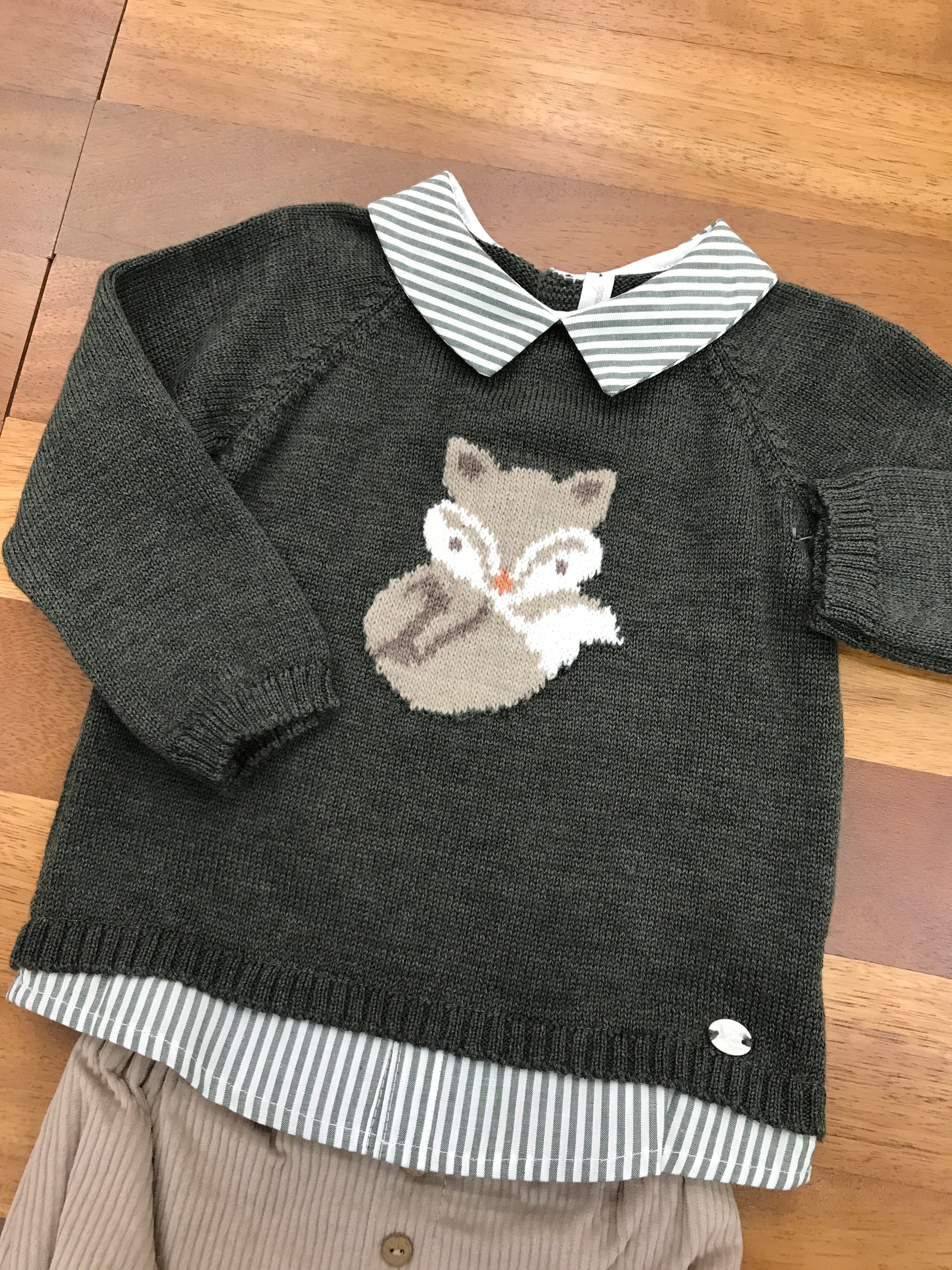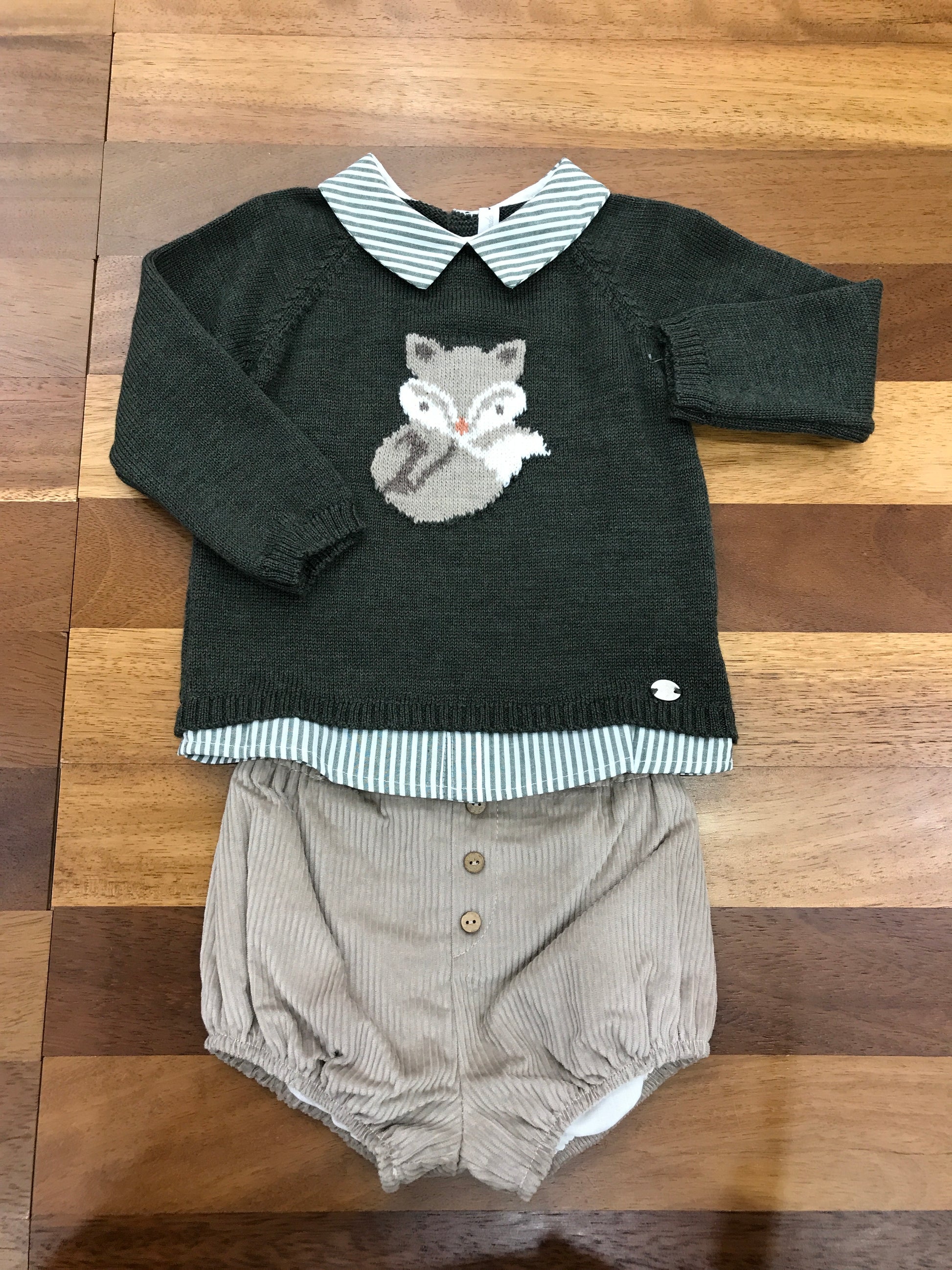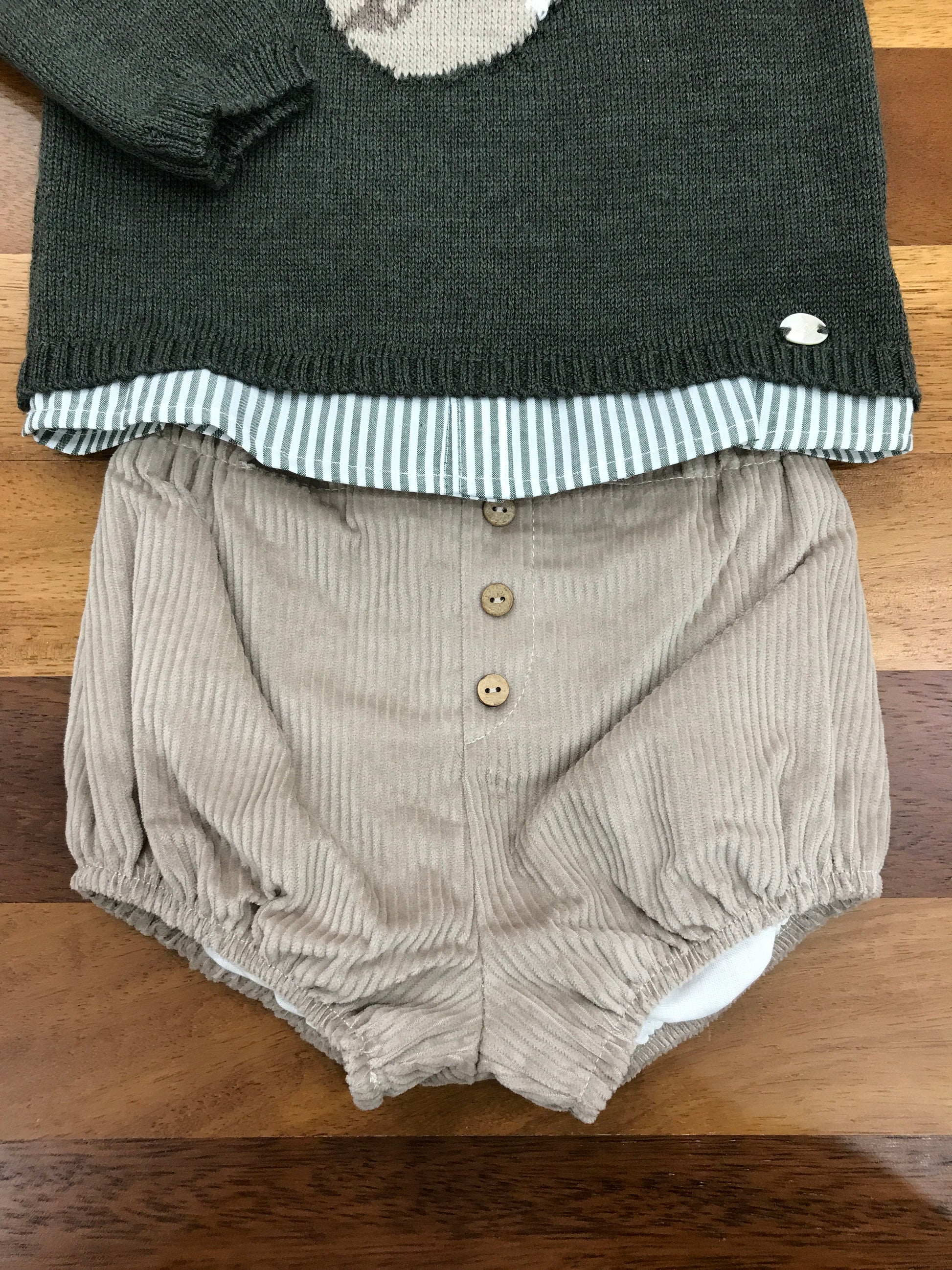 Elegante completino in lana verde con dettaglio di maglia a coste, arricchito da una camicia ricamata sottostante. La culottina in velluto beige completa l'insieme con un contrasto cromatico raffinato, creando un look sofisticato e versatile per occasioni speciali.