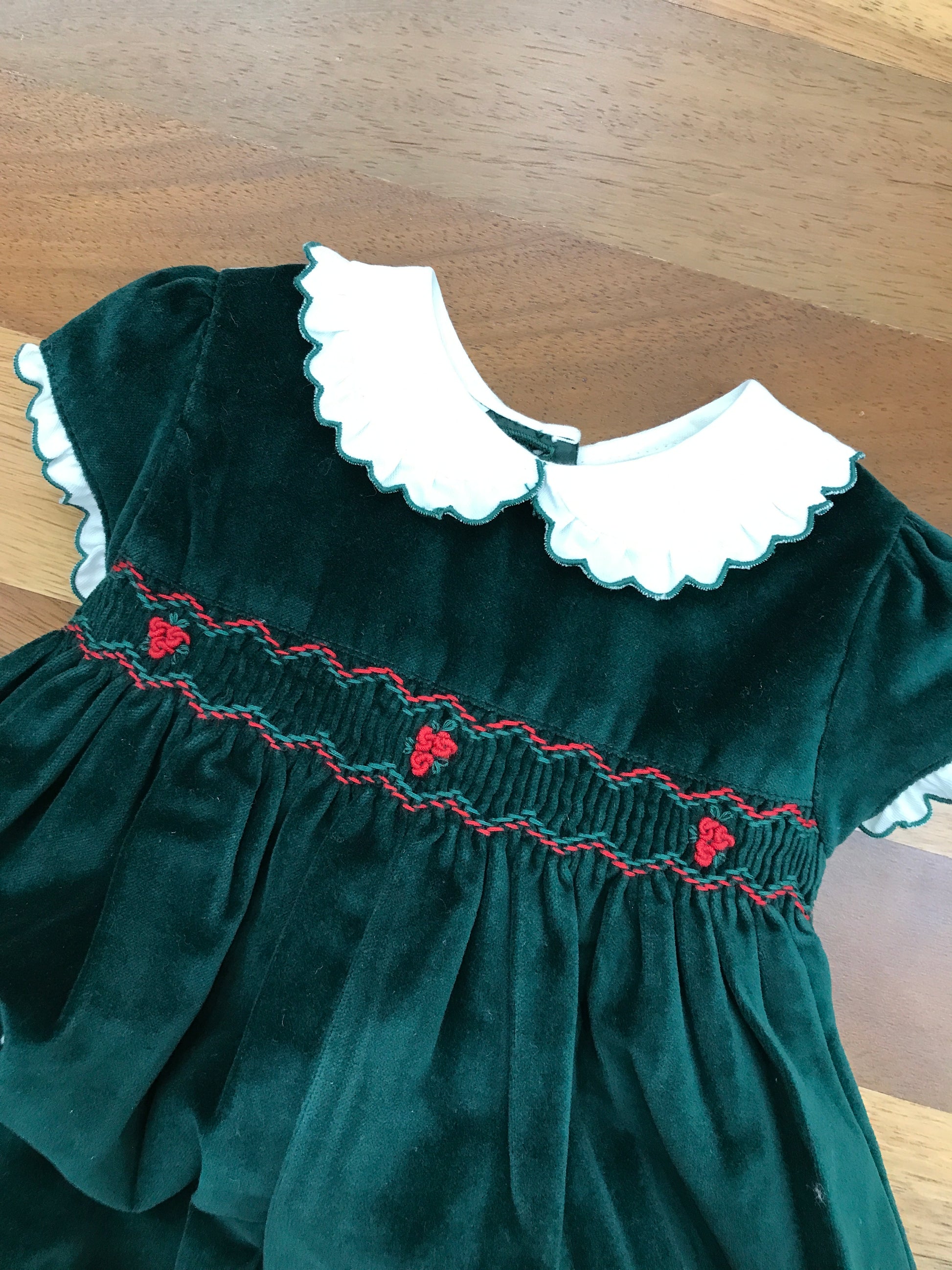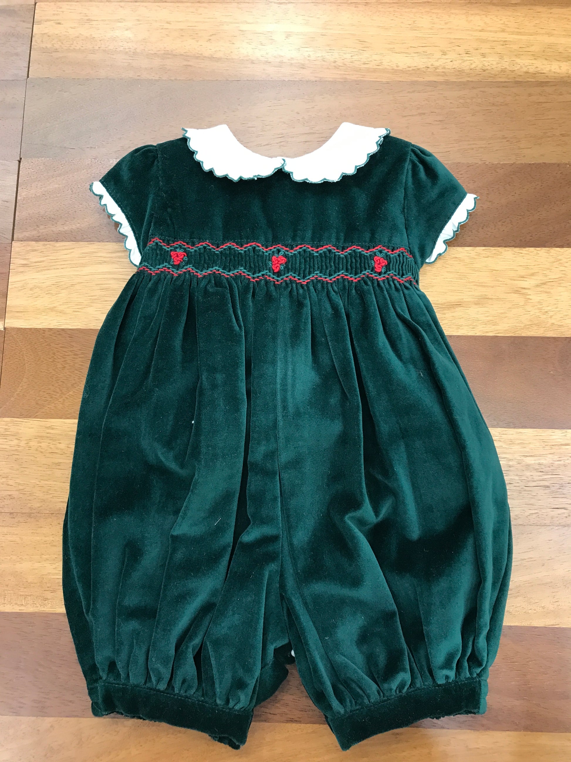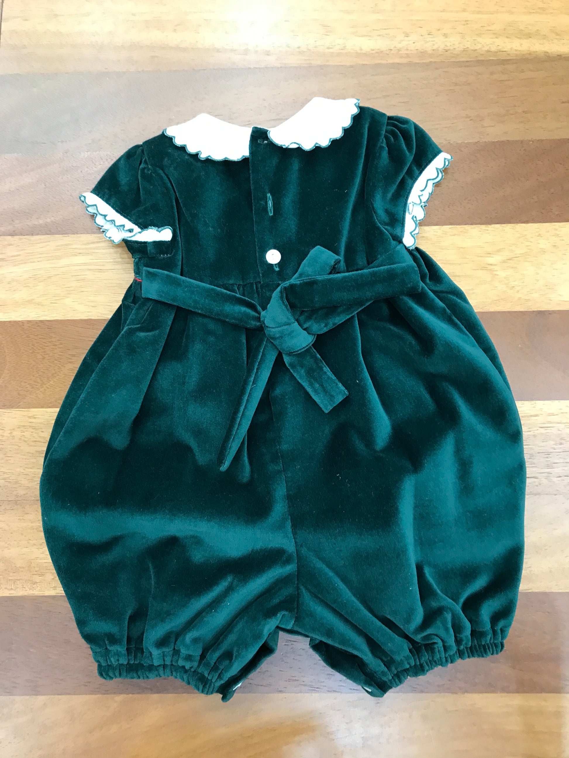 Elegante pagliaccetto in velluto verde della collezione Les enfants de Gisele, caratterizzato da finiture raffinate alle caviglie e da una pregiata lavorazione a punto smock al centro, arricchita da delicate rose ricamate in tonalità rossastre. Un capo sofisticato che unisce comfort e dettagli artigianali di qualità.