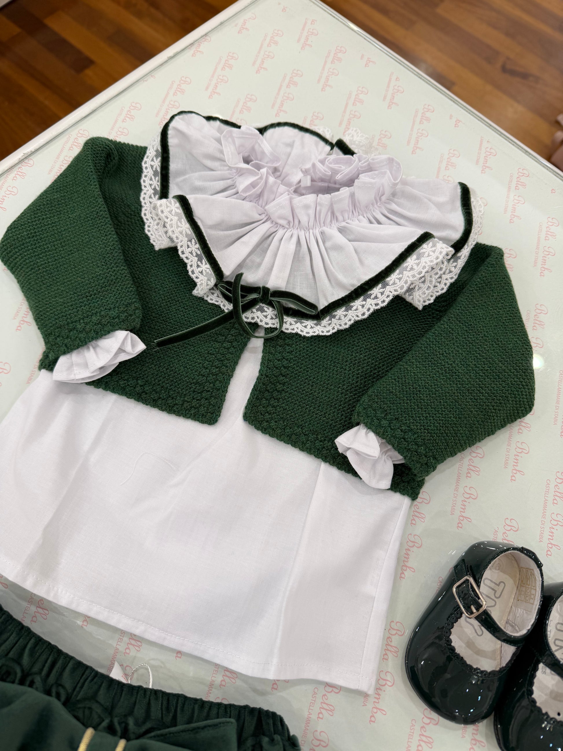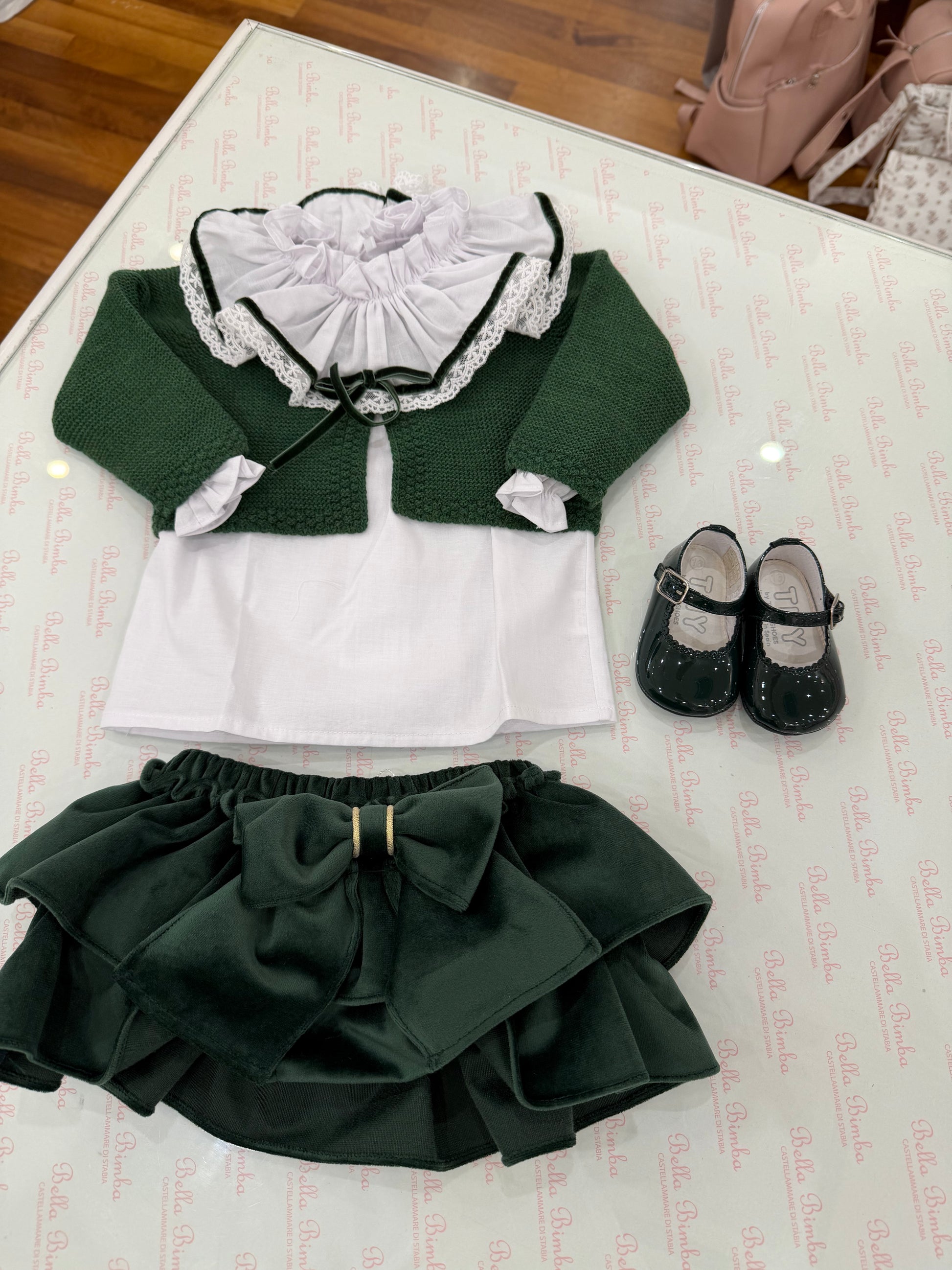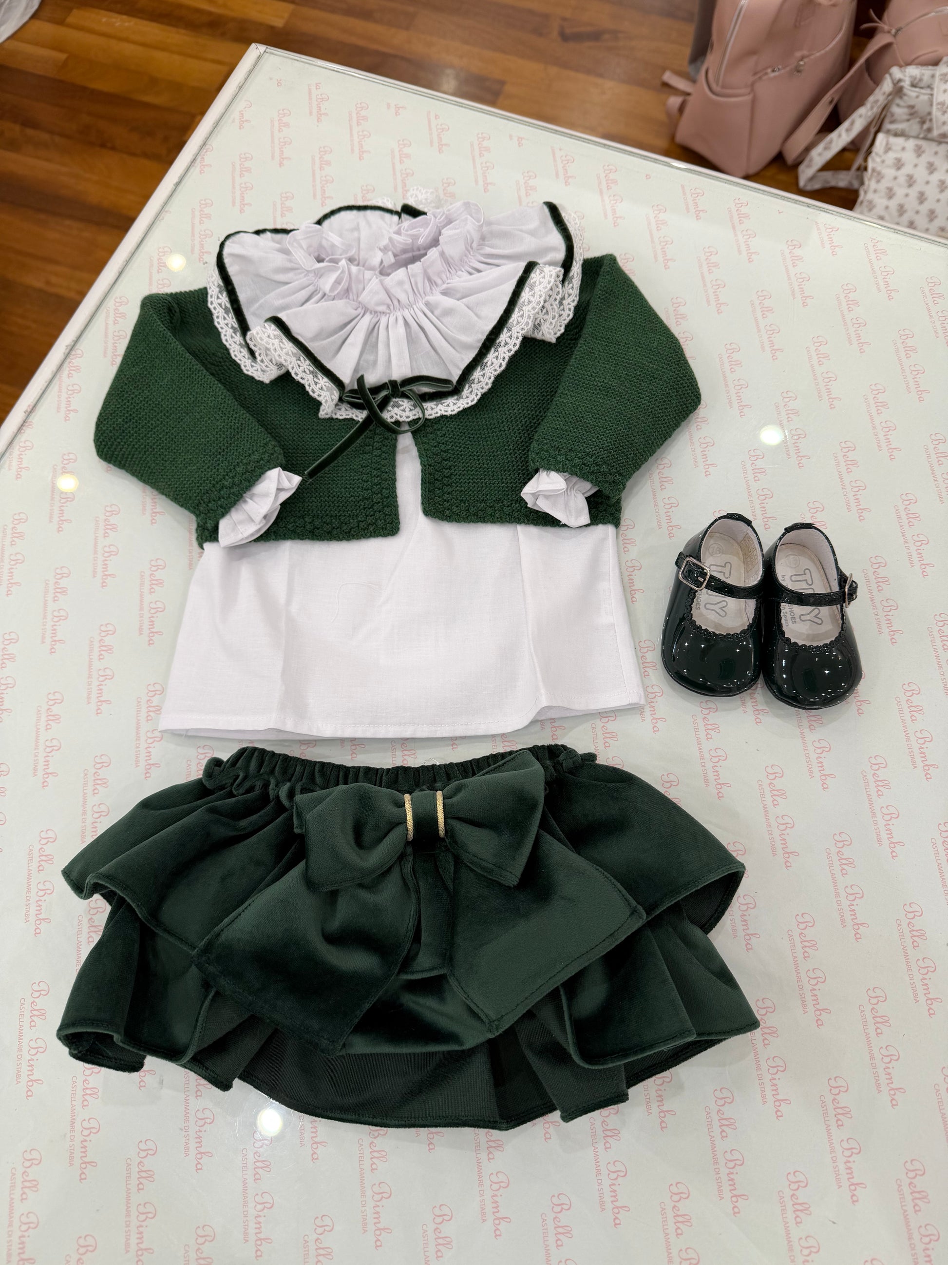 Elegante completo coordinato che combina una gonna in velluto verde con fiocco posteriore, camicetta bianca arricchita da dettagli in tono, cardigan verde dal taglio essenziale e scarpine in vernice verde. Un insieme raffinato e versatile, perfetto per occasioni speciali o look quotidiani ricercati.