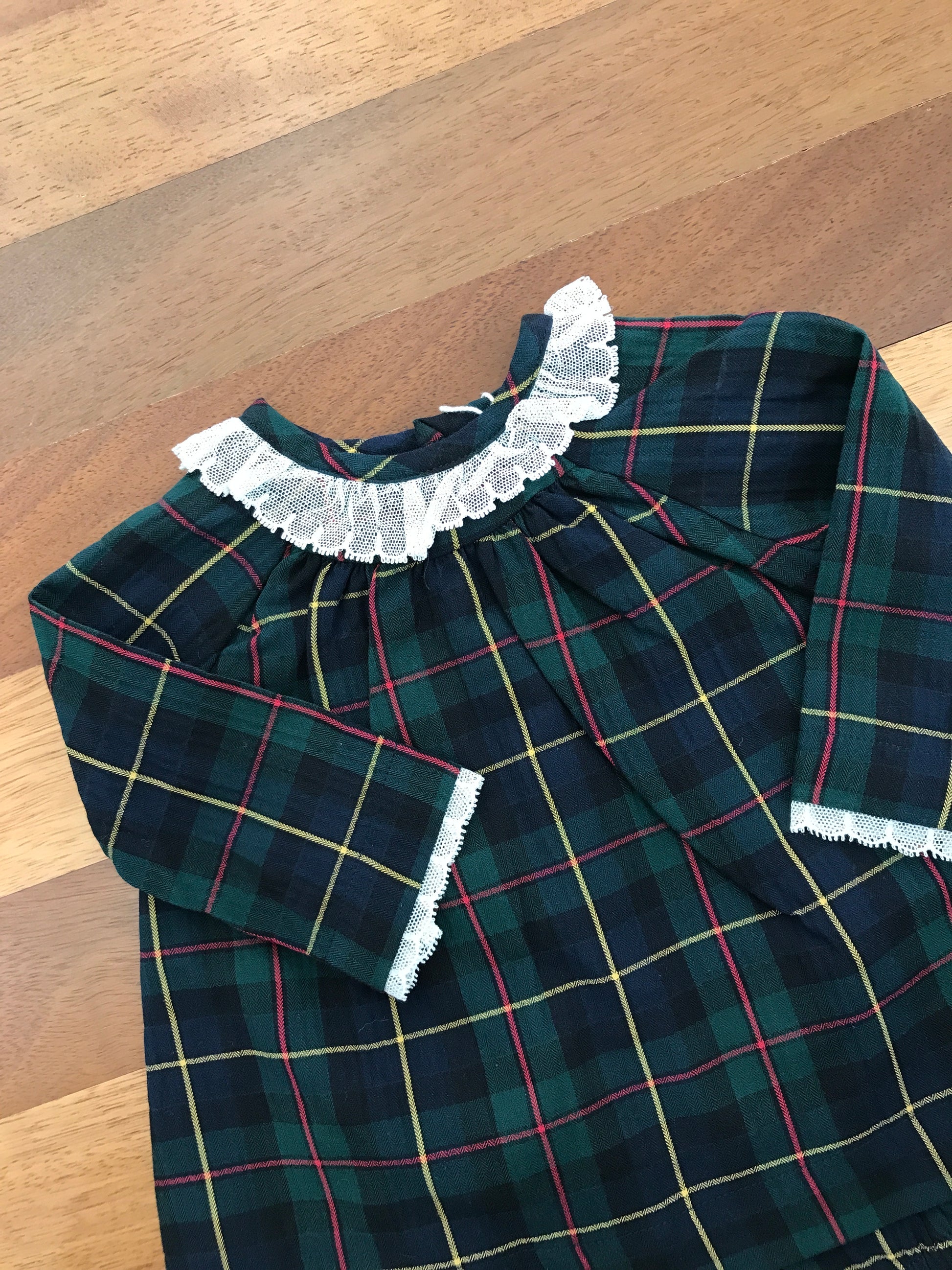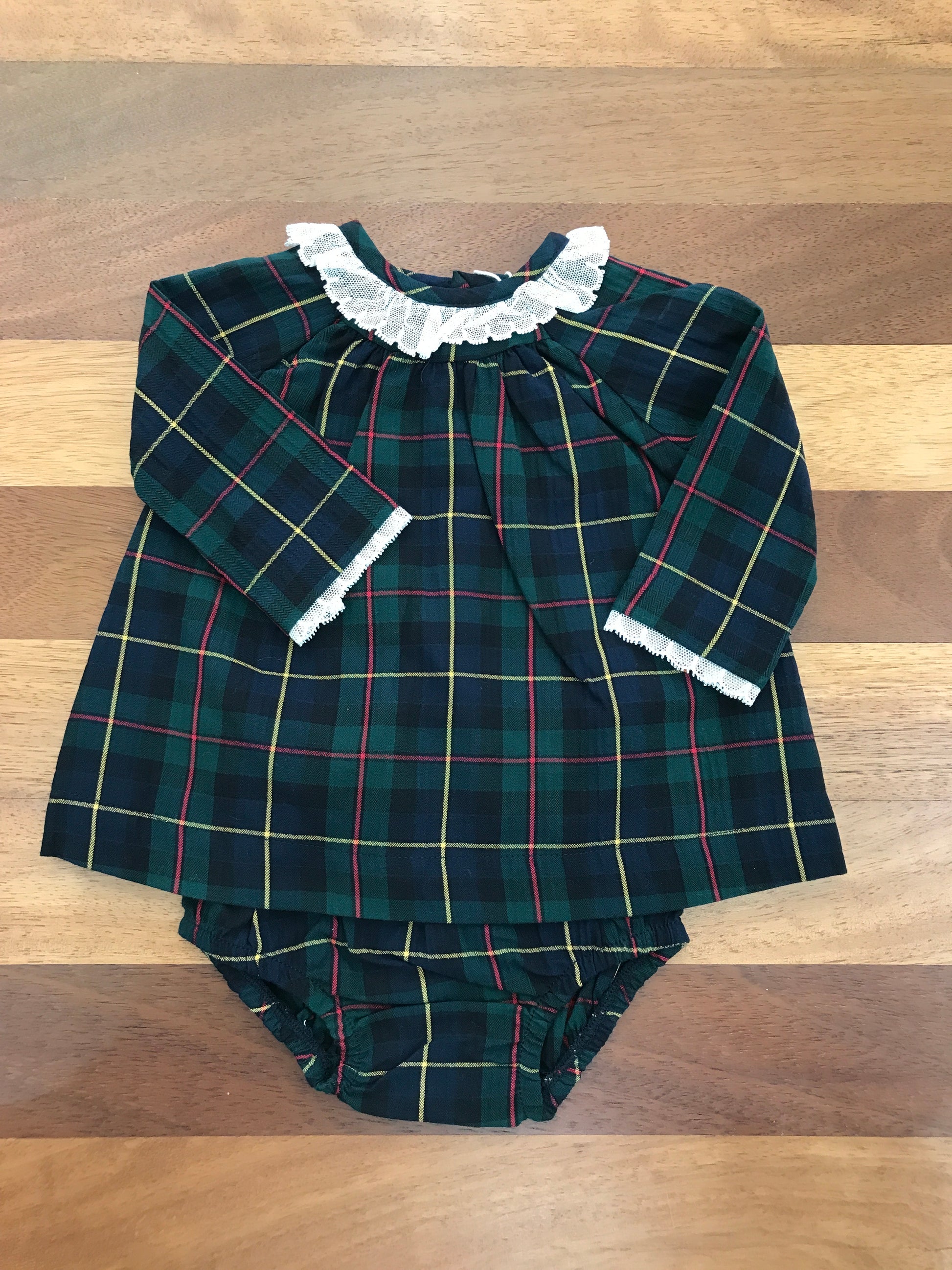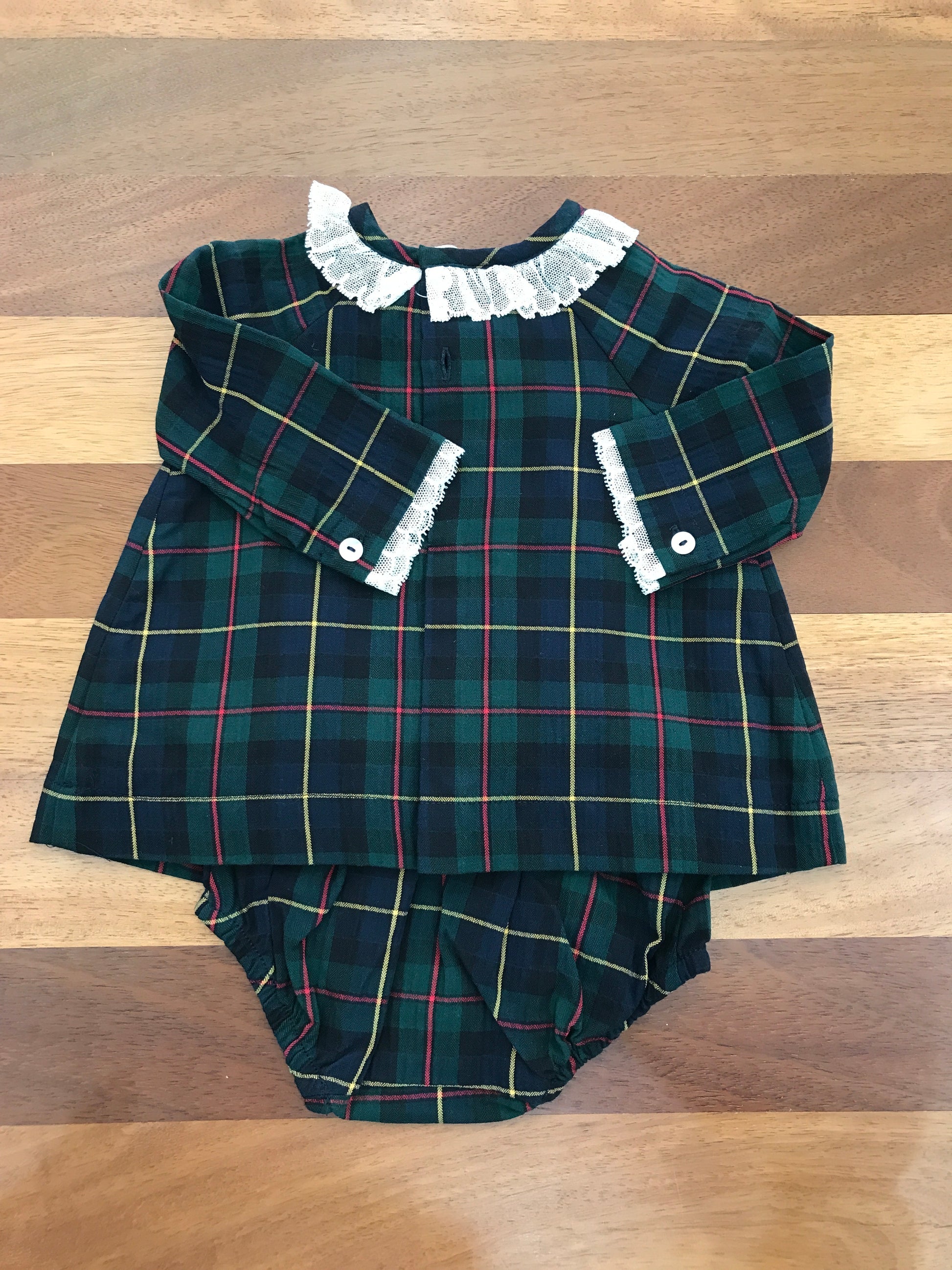 Completo in cotone a due pezzi con motivo scozzese. La culotte presenta una vestibilità comoda e pratica, mentre la camicetta è caratterizzata da bottoncini posteriori per una chiusura sicura. Dettagli raffinati includono il colletto con arricciature in bianco e maniche rifinite con lo stesso trattamento. Un capo versatile e elegante per le piccole fashioniste, perfetto per occasioni speciali o uso quotidiano.