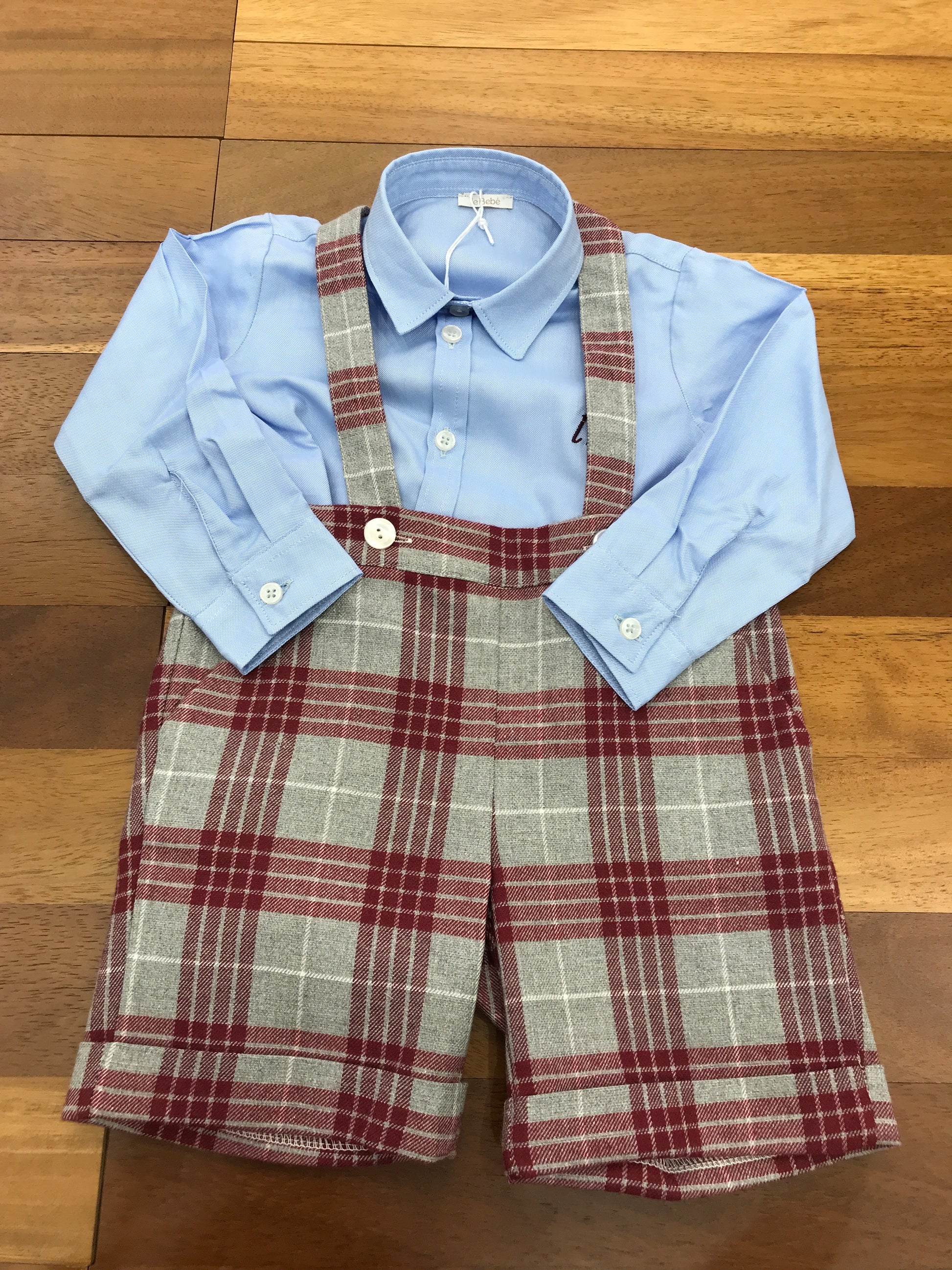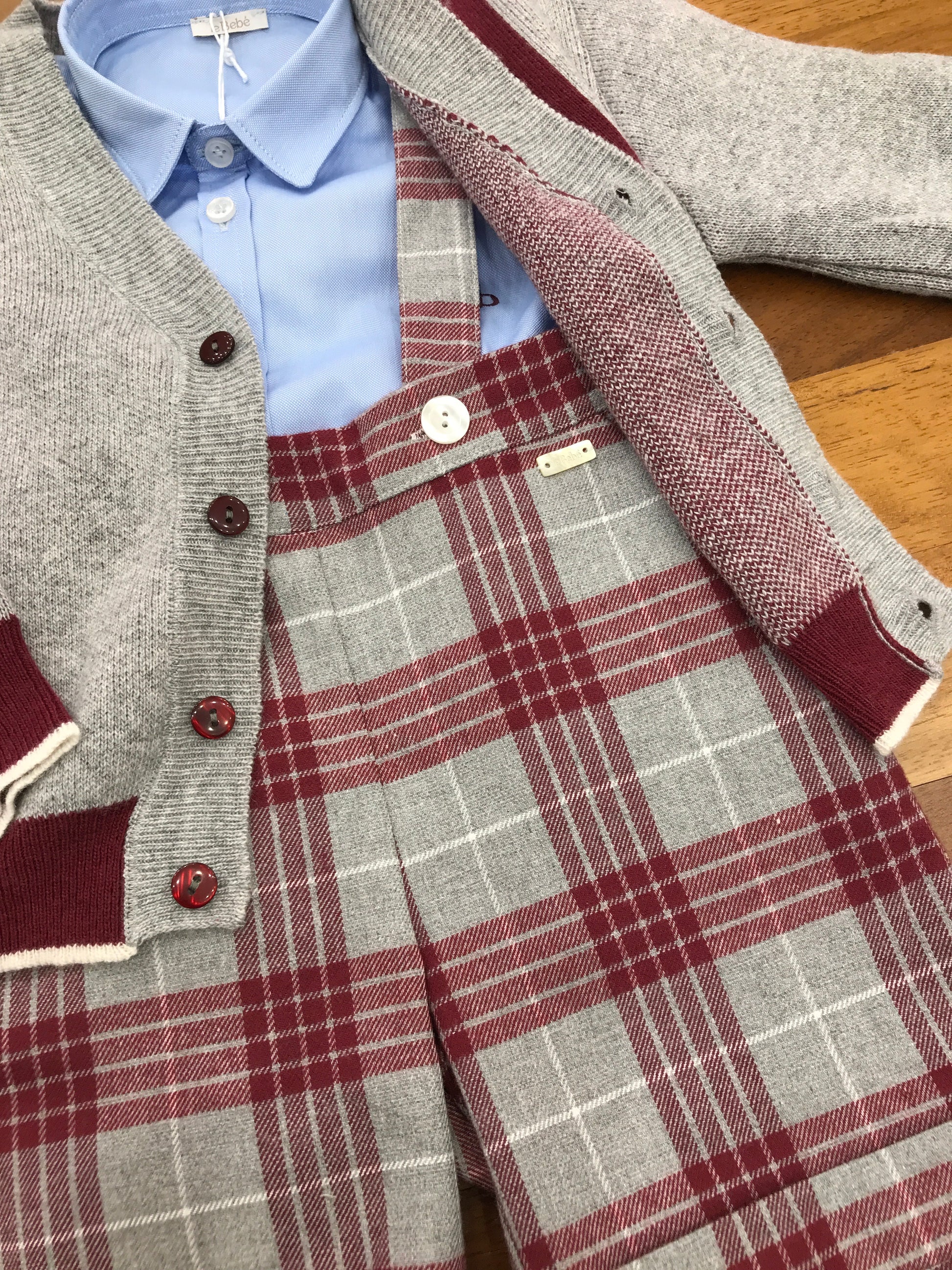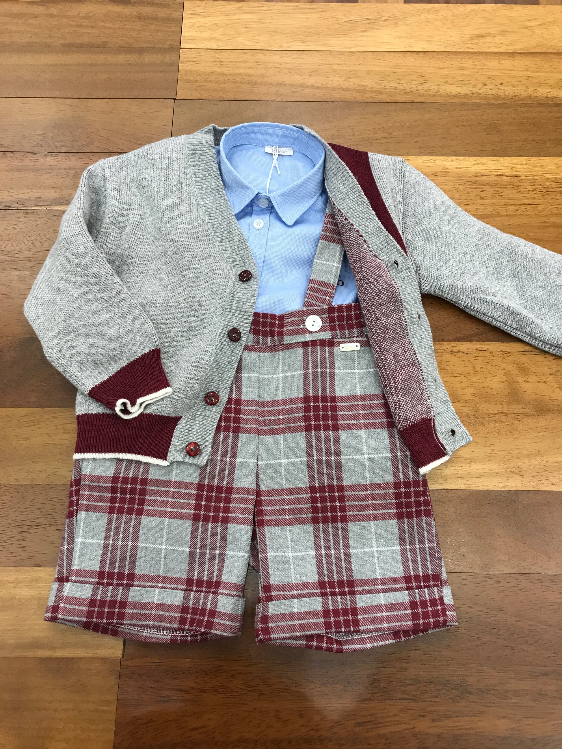 Set completo composto da tre capi: una salopette grigia con bretelle e dettagli bordeaux, una camicia celeste a maniche lunghe con bottoni, e un cardigan grigio arricchito da rifiniture bordeaux e chiusura con bottoncini.